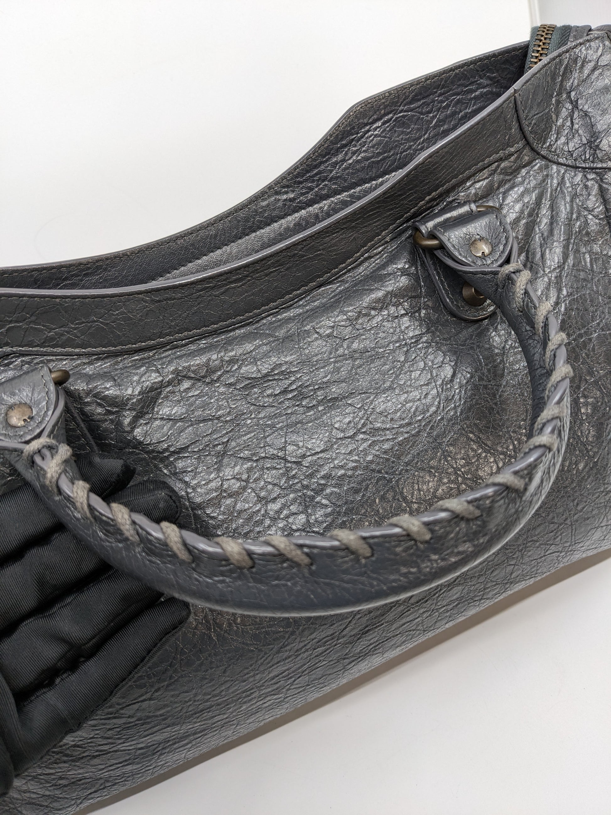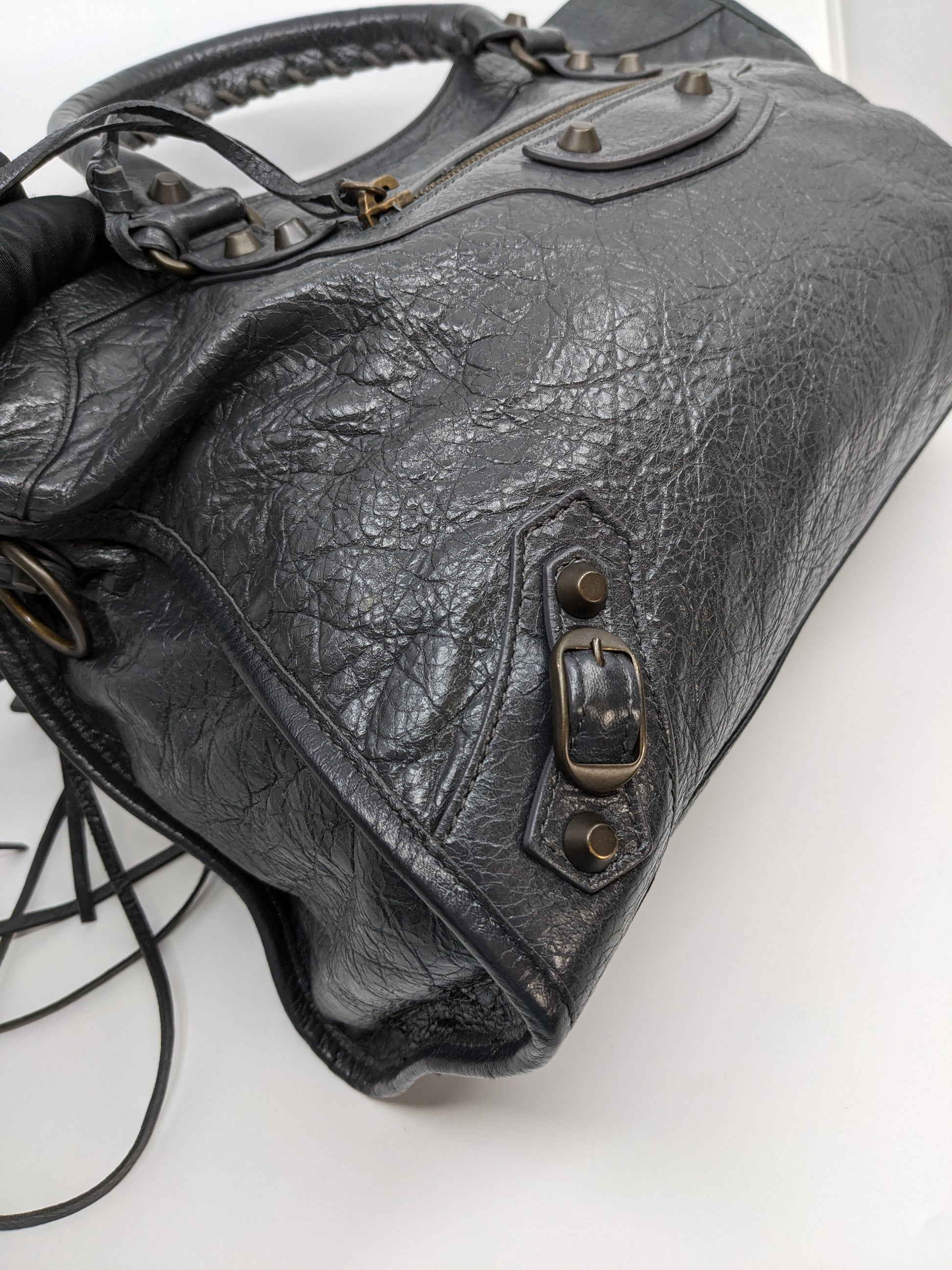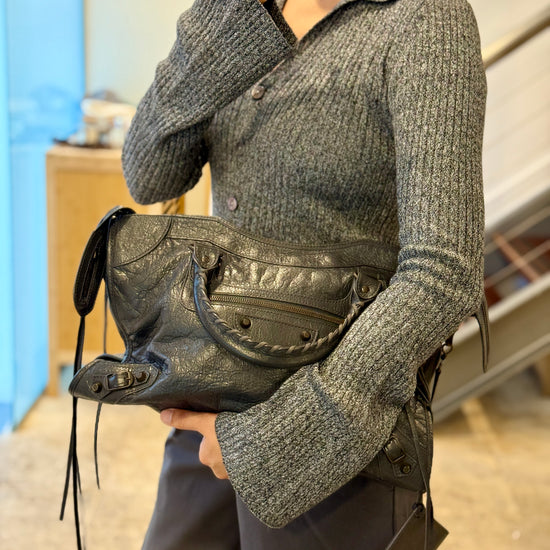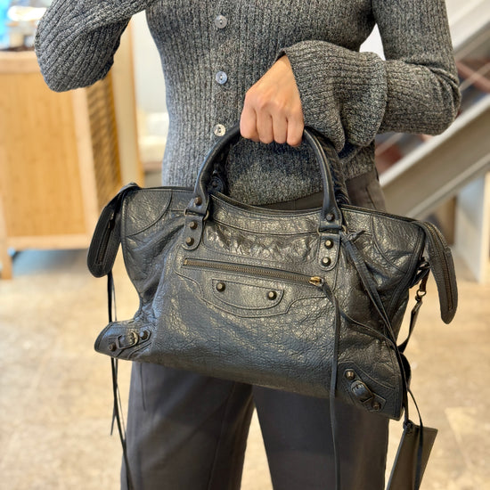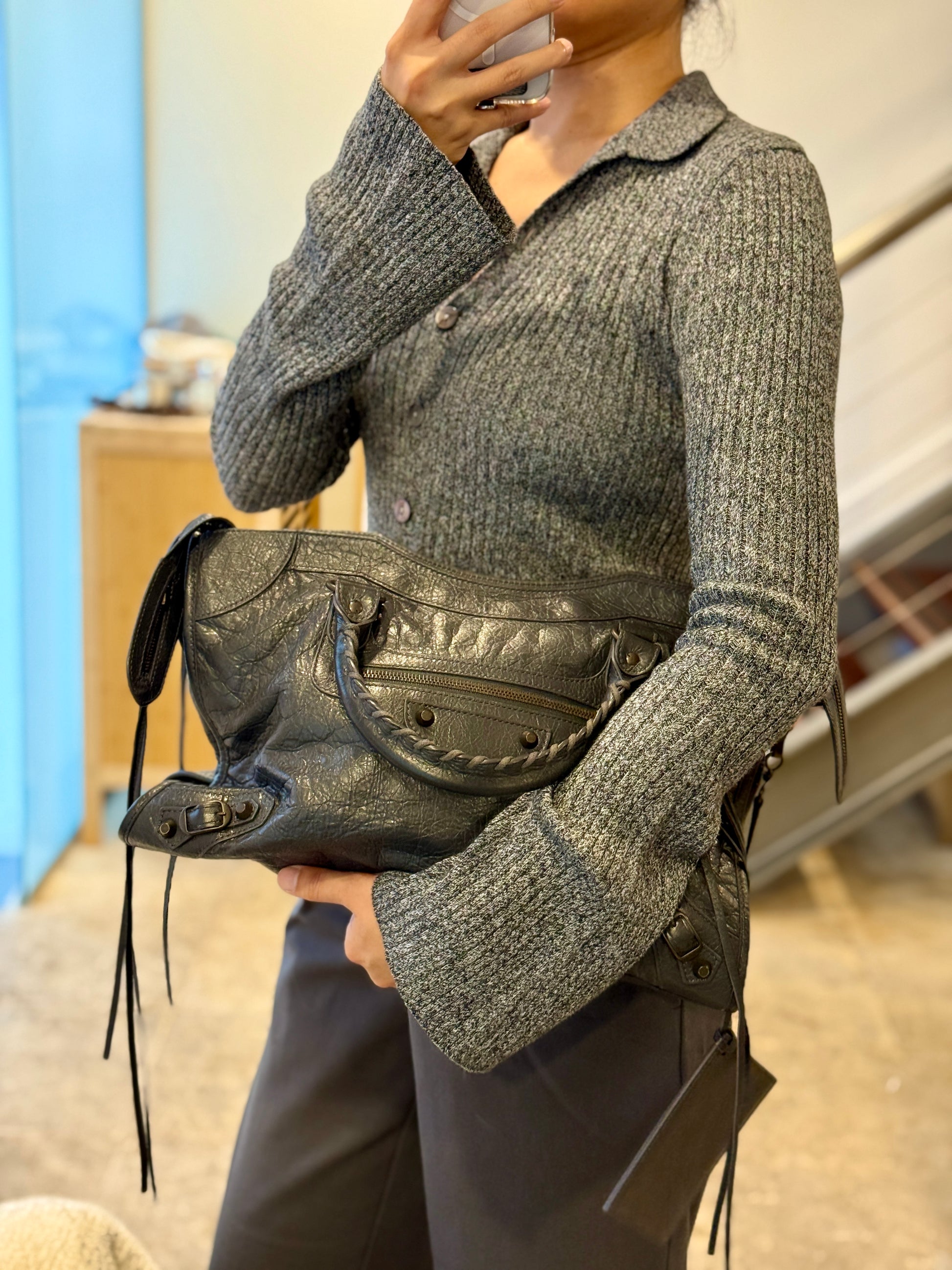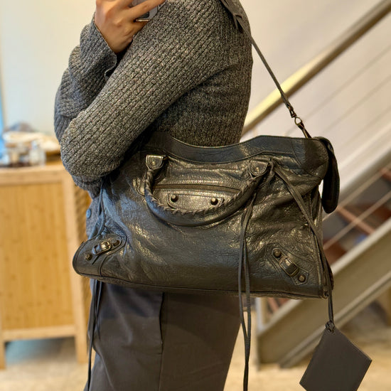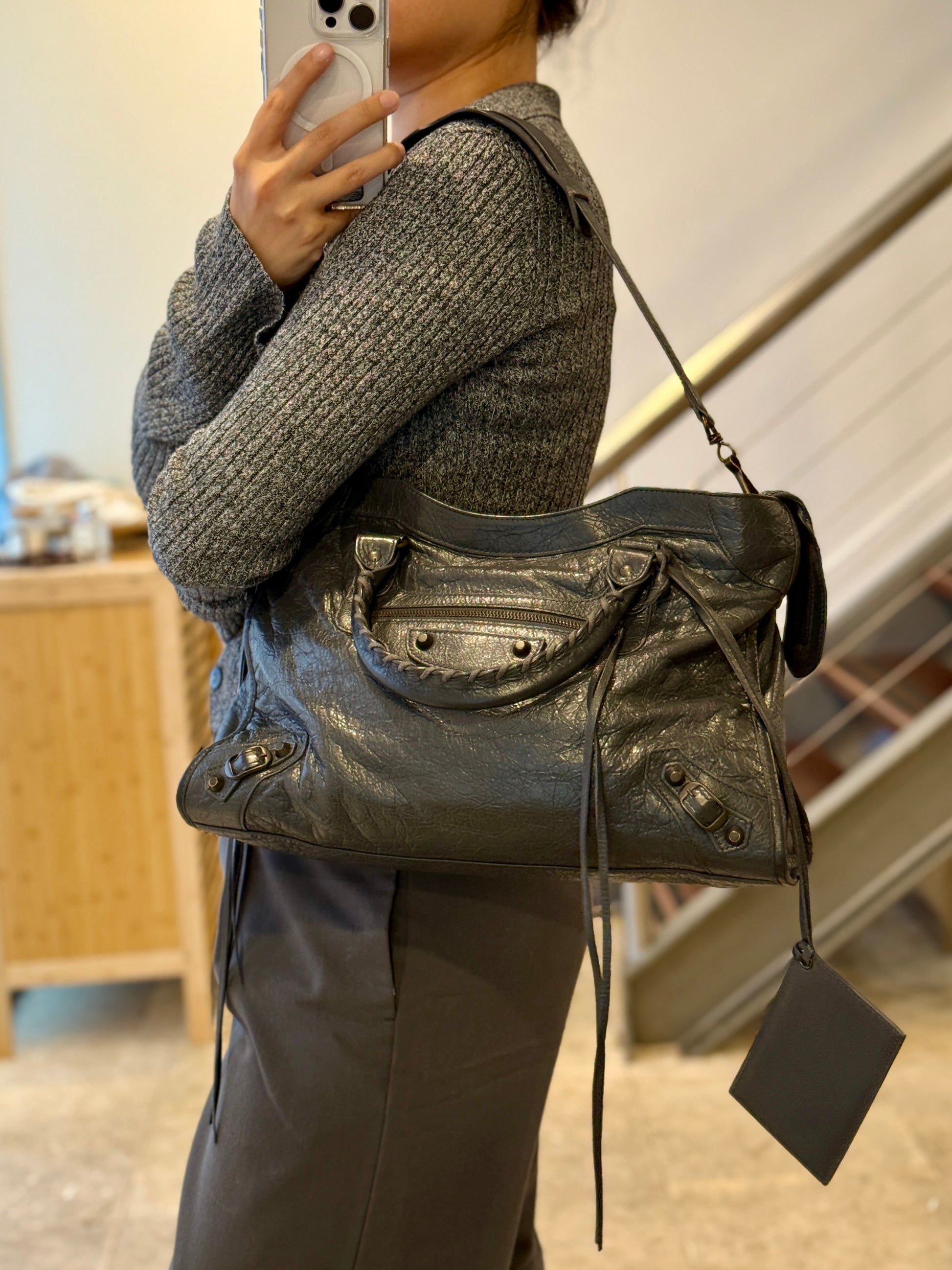 Balenciaga Medium City in dark grey, an iconic staple from the house known for its effortlessly cool, lived in aesthetic. Crafted from soft, supple leather, it features the signature studded hardware and relaxed silhouette. The spacious interior makes it perfect for everyday use while maintaining a lightweight feel. Designed with top handles and an optional shoulder strap for versatile wear. A timeless and edgy classic that remains a favorite among Balenciaga collectors.
