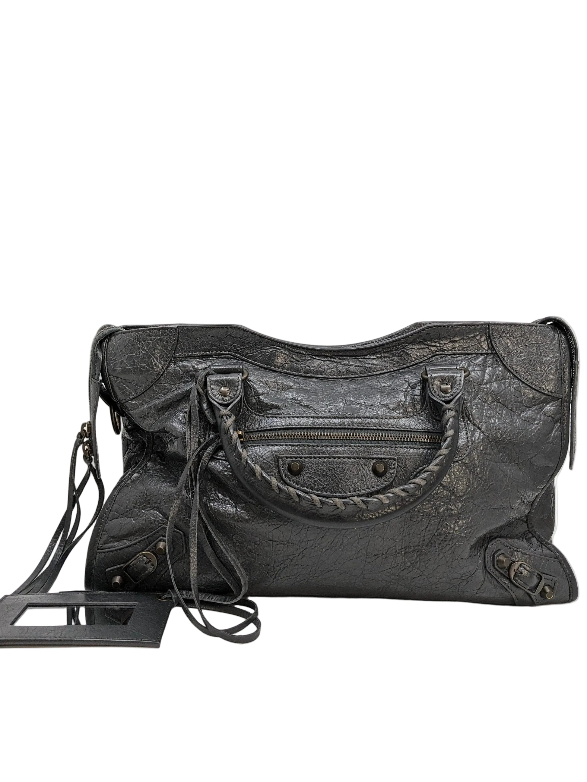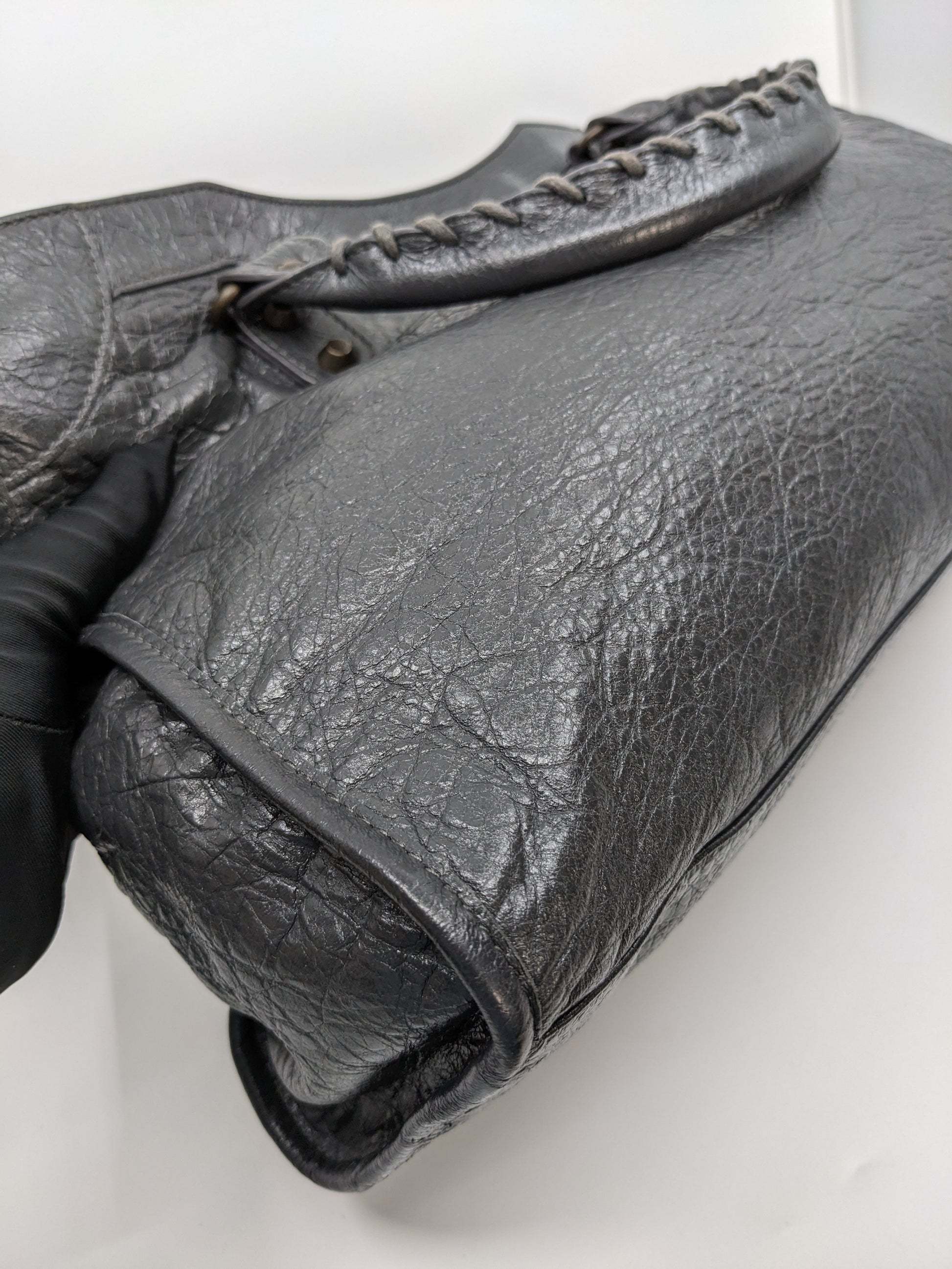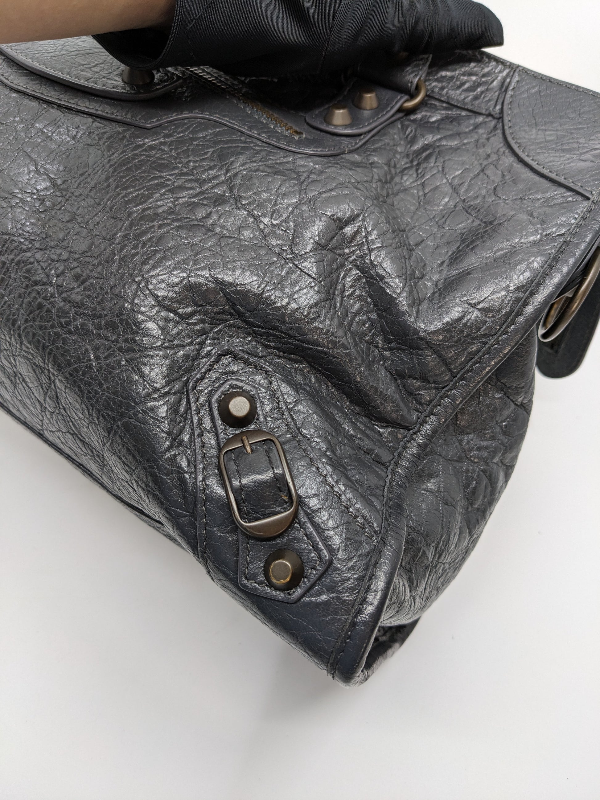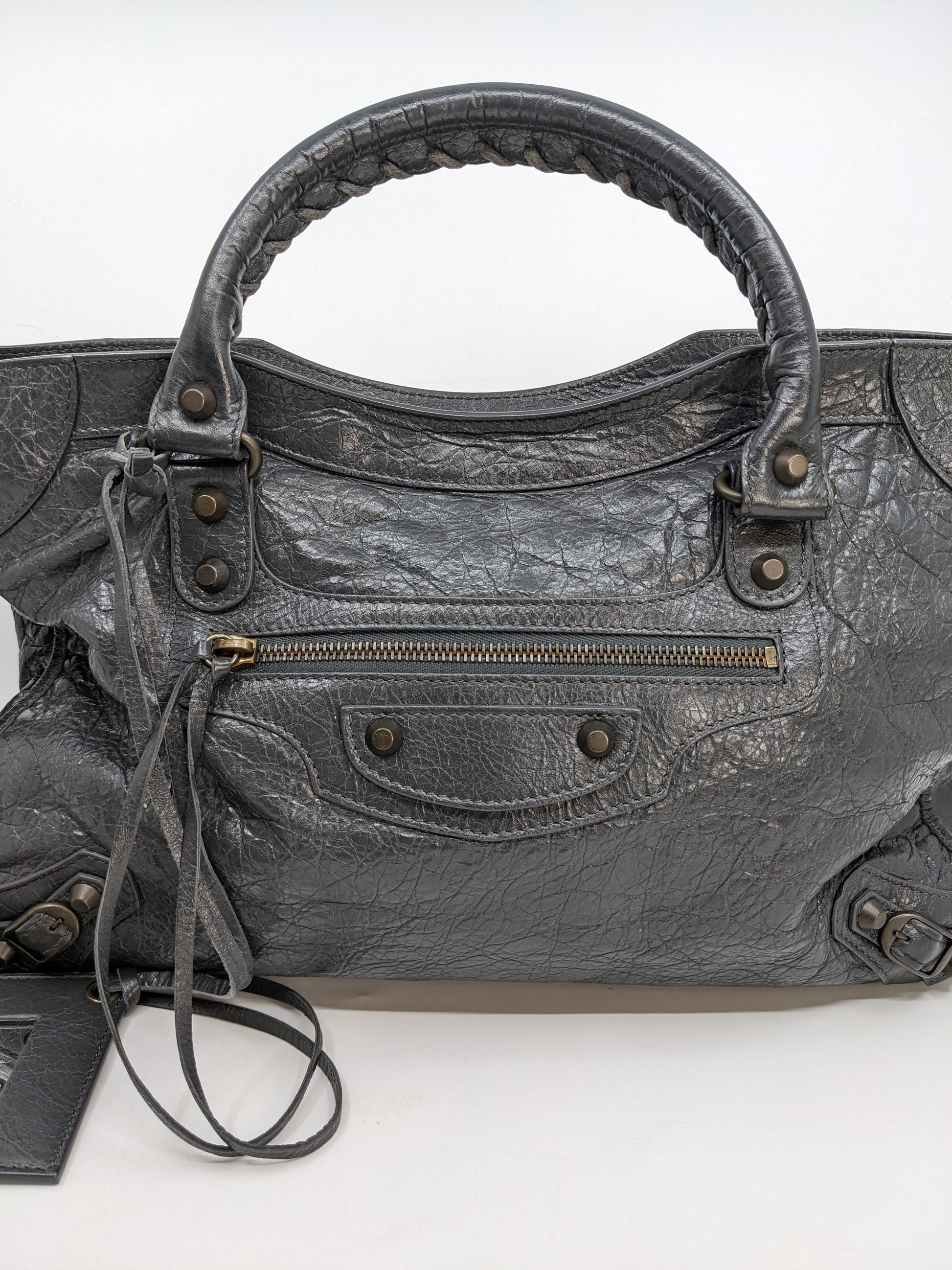 Balenciaga Medium City in dark grey, an iconic staple from the house known for its effortlessly cool, lived in aesthetic. Crafted from soft, supple leather, it features the signature studded hardware and relaxed silhouette. The spacious interior makes it perfect for everyday use while maintaining a lightweight feel. Designed with top handles and an optional shoulder strap for versatile wear. A timeless and edgy classic that remains a favorite among Balenciaga collectors.