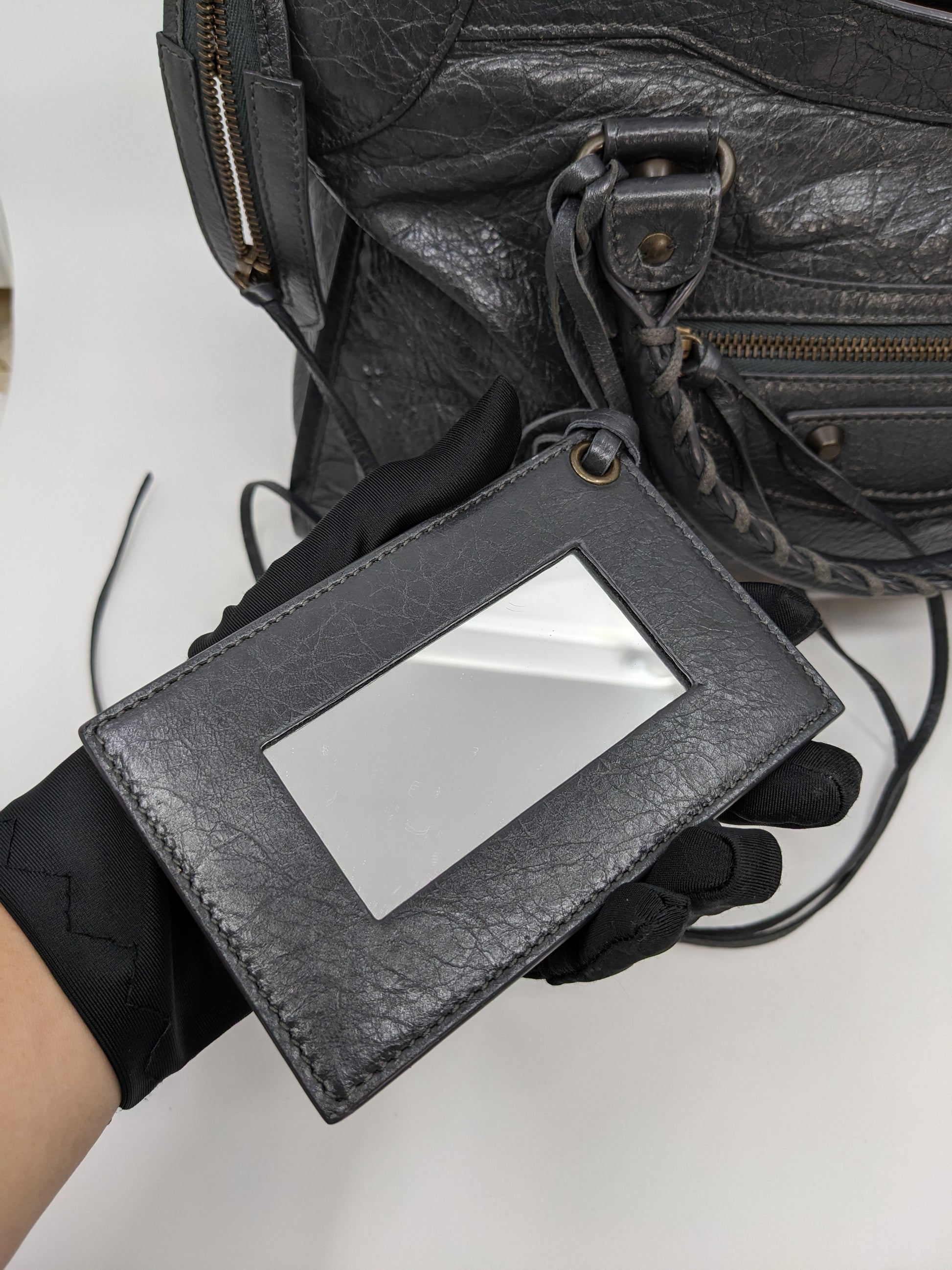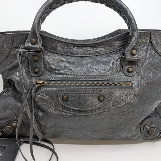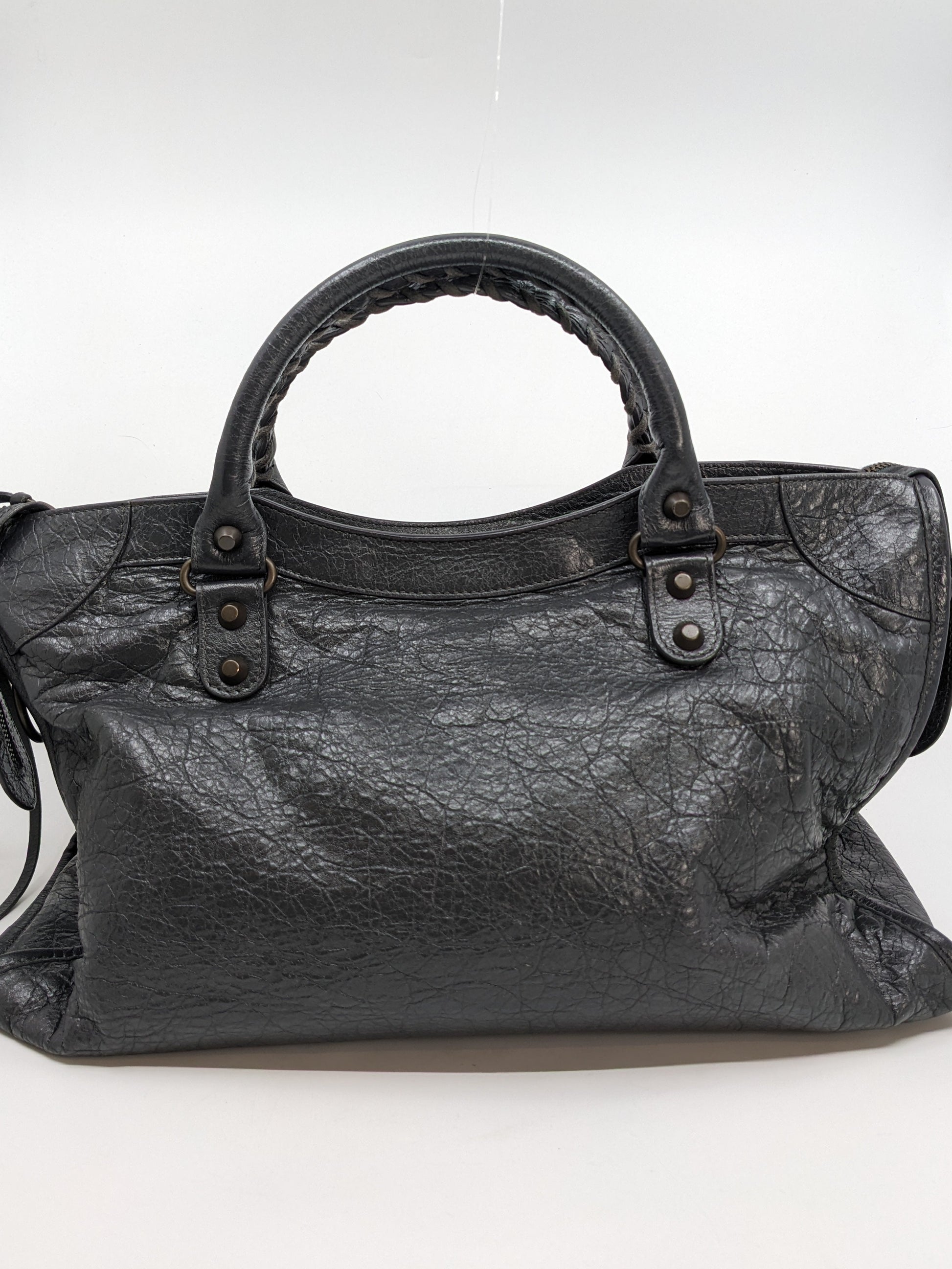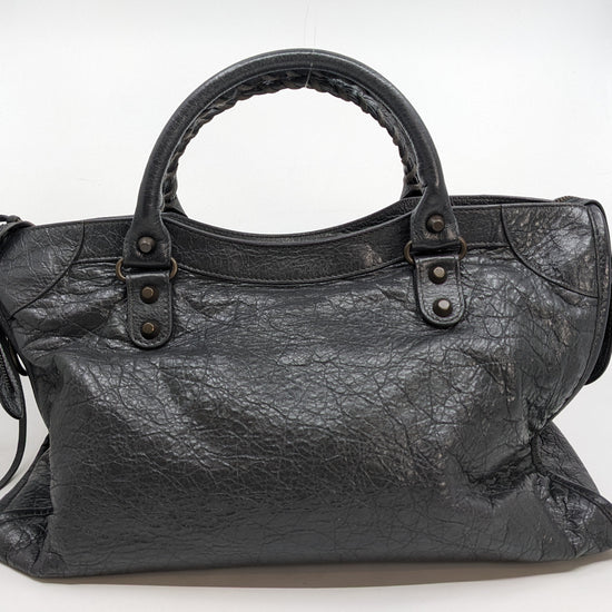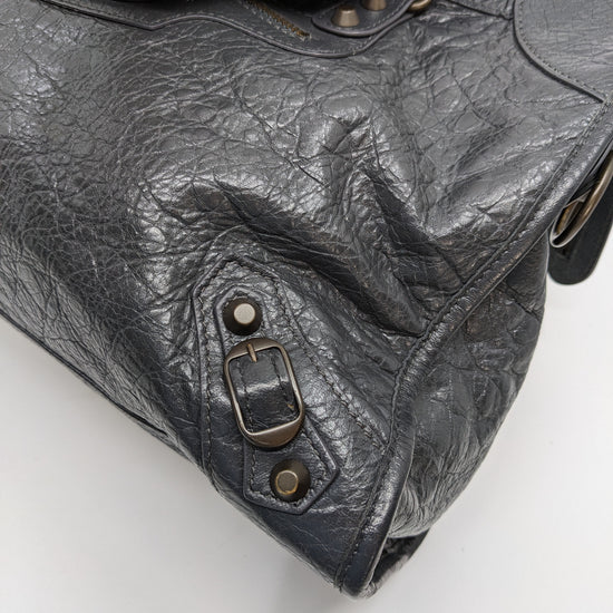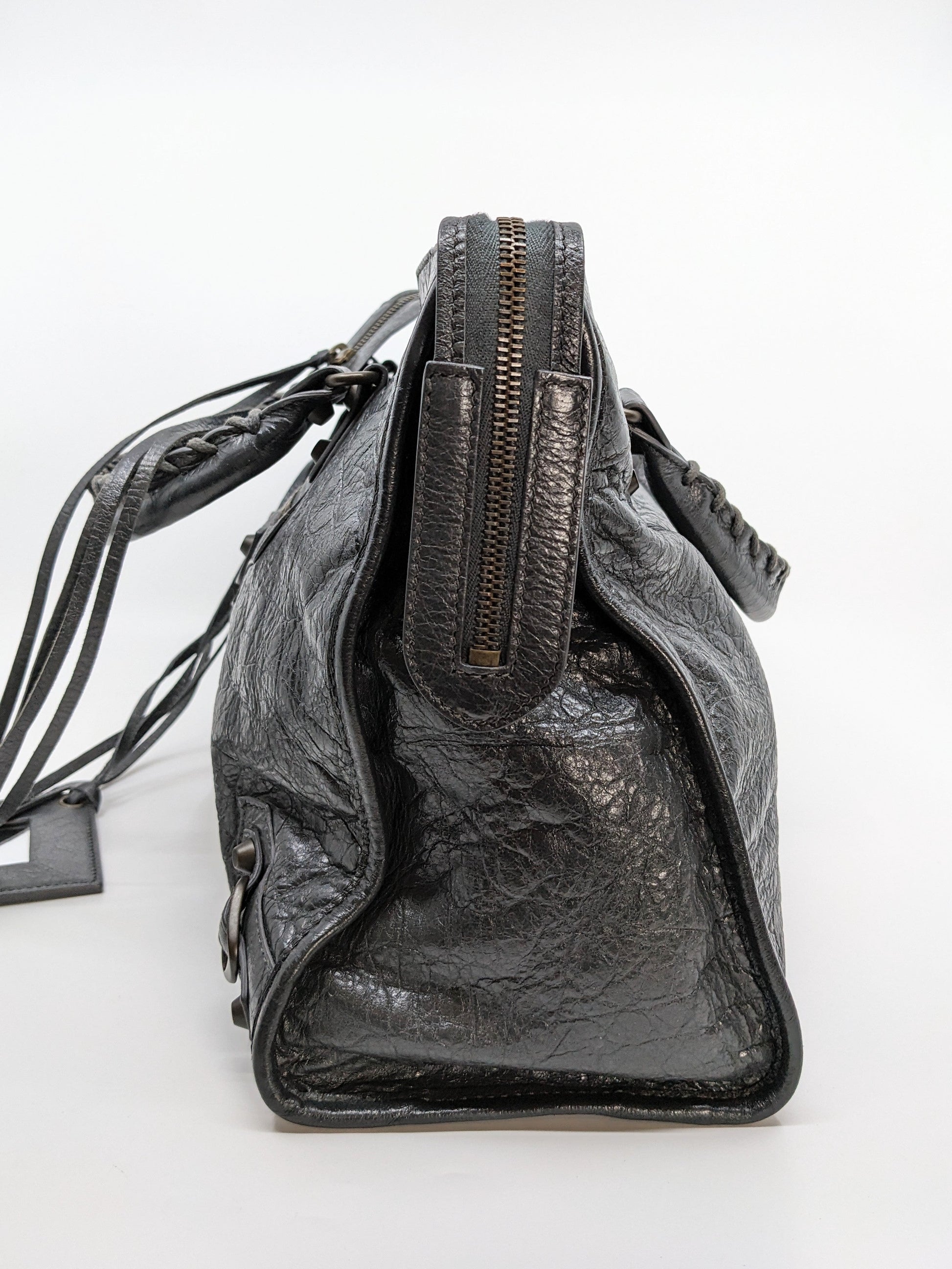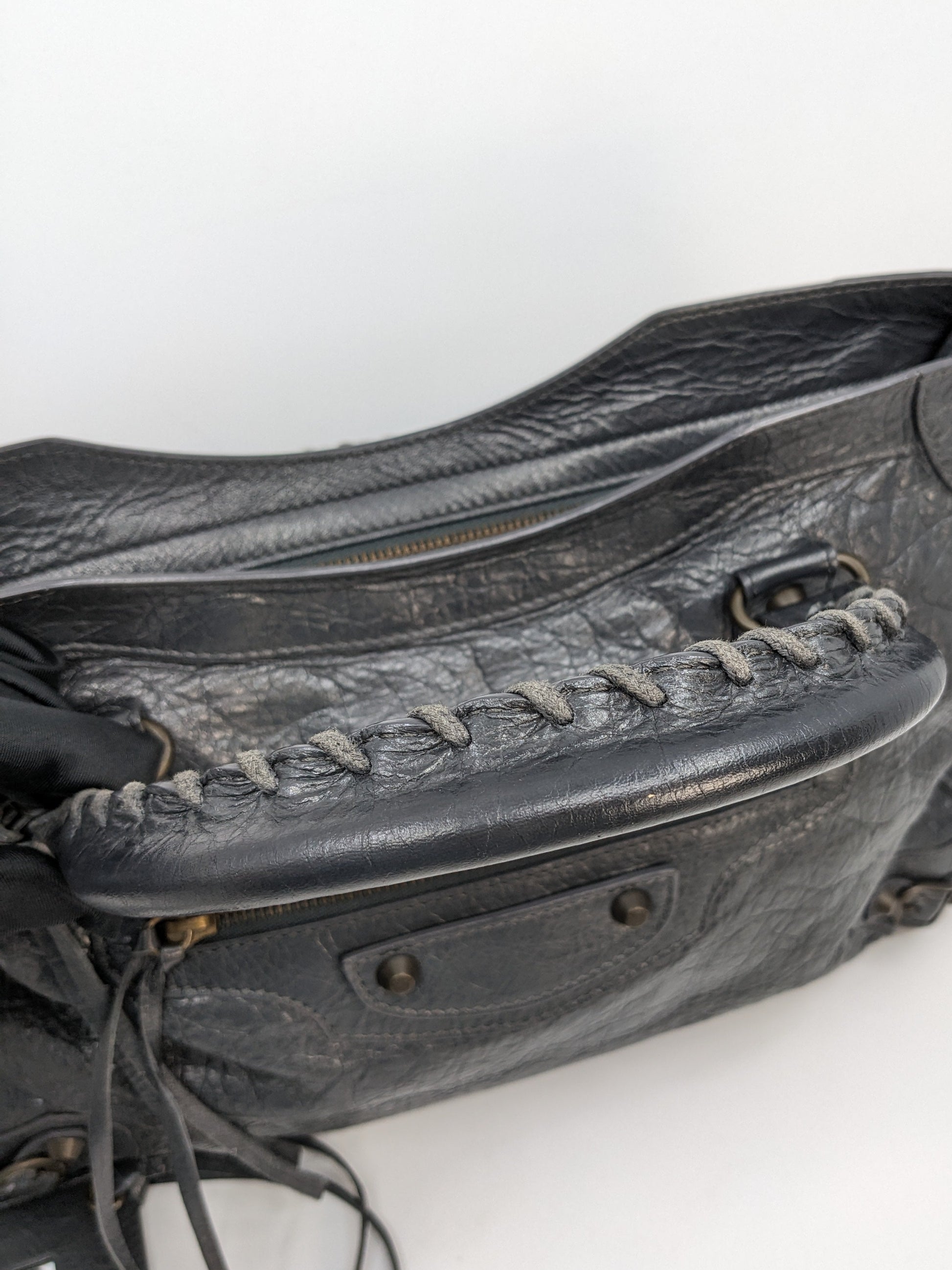 Balenciaga Medium City in dark grey, an iconic staple from the house known for its effortlessly cool, lived in aesthetic. Crafted from soft, supple leather, it features the signature studded hardware and relaxed silhouette. The spacious interior makes it perfect for everyday use while maintaining a lightweight feel. Designed with top handles and an optional shoulder strap for versatile wear. A timeless and edgy classic that remains a favorite among Balenciaga collectors.