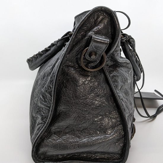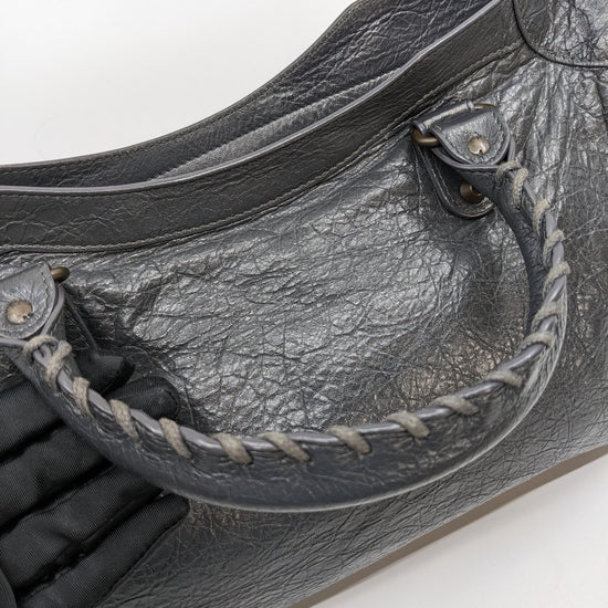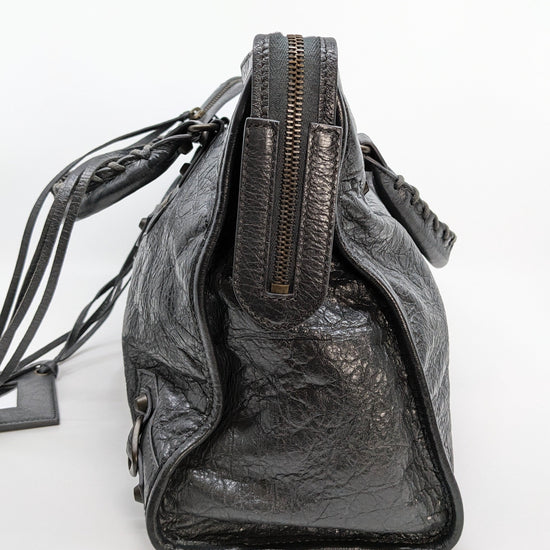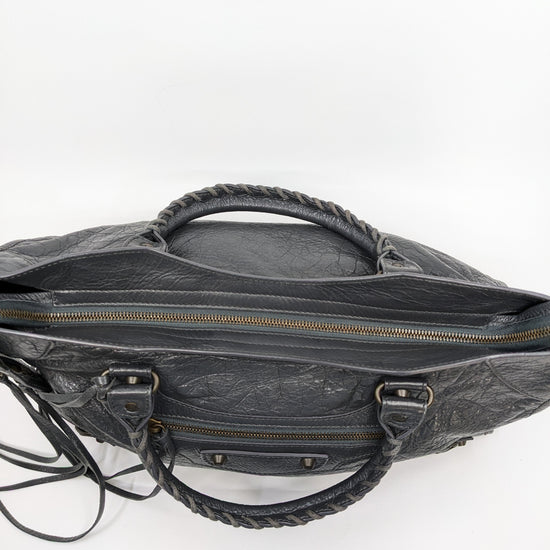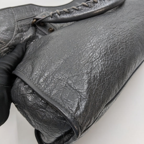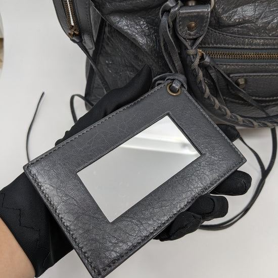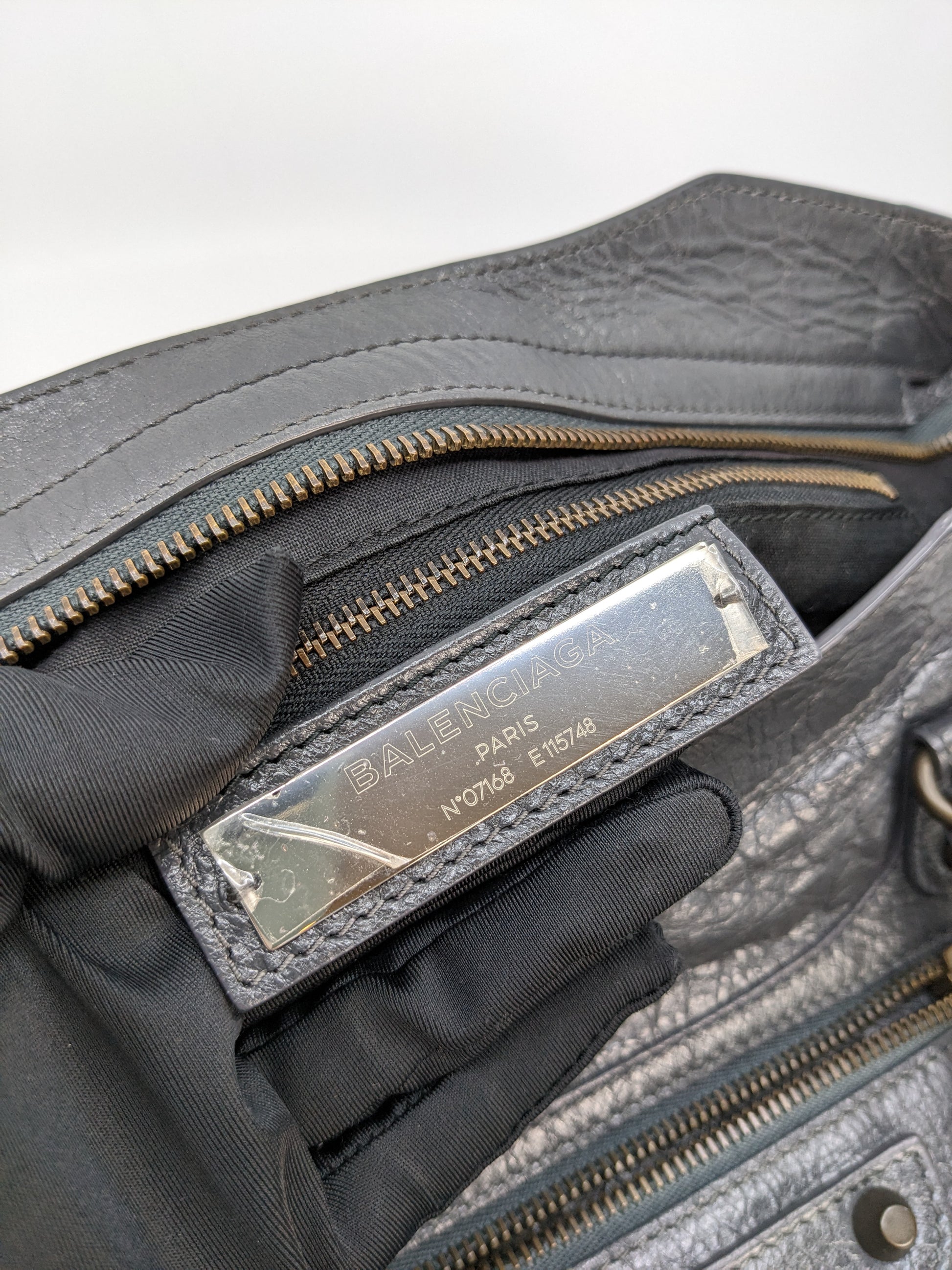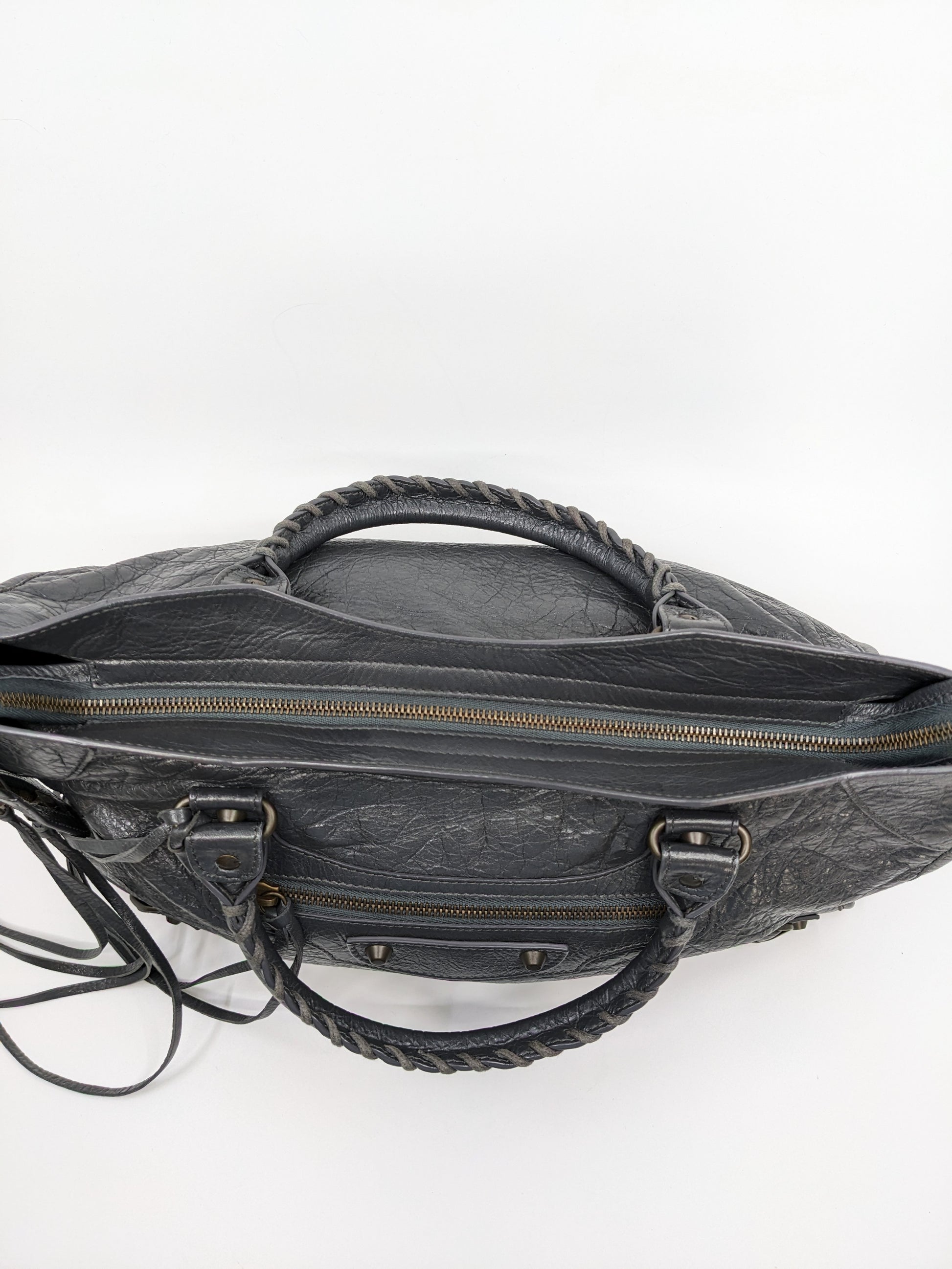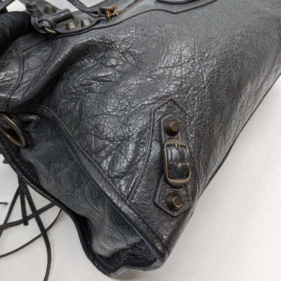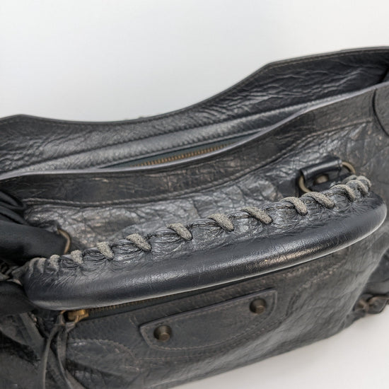 Balenciaga Medium City in dark grey, an iconic staple from the house known for its effortlessly cool, lived in aesthetic. Crafted from soft, supple leather, it features the signature studded hardware and relaxed silhouette. The spacious interior makes it perfect for everyday use while maintaining a lightweight feel. Designed with top handles and an optional shoulder strap for versatile wear. A timeless and edgy classic that remains a favorite among Balenciaga collectors.