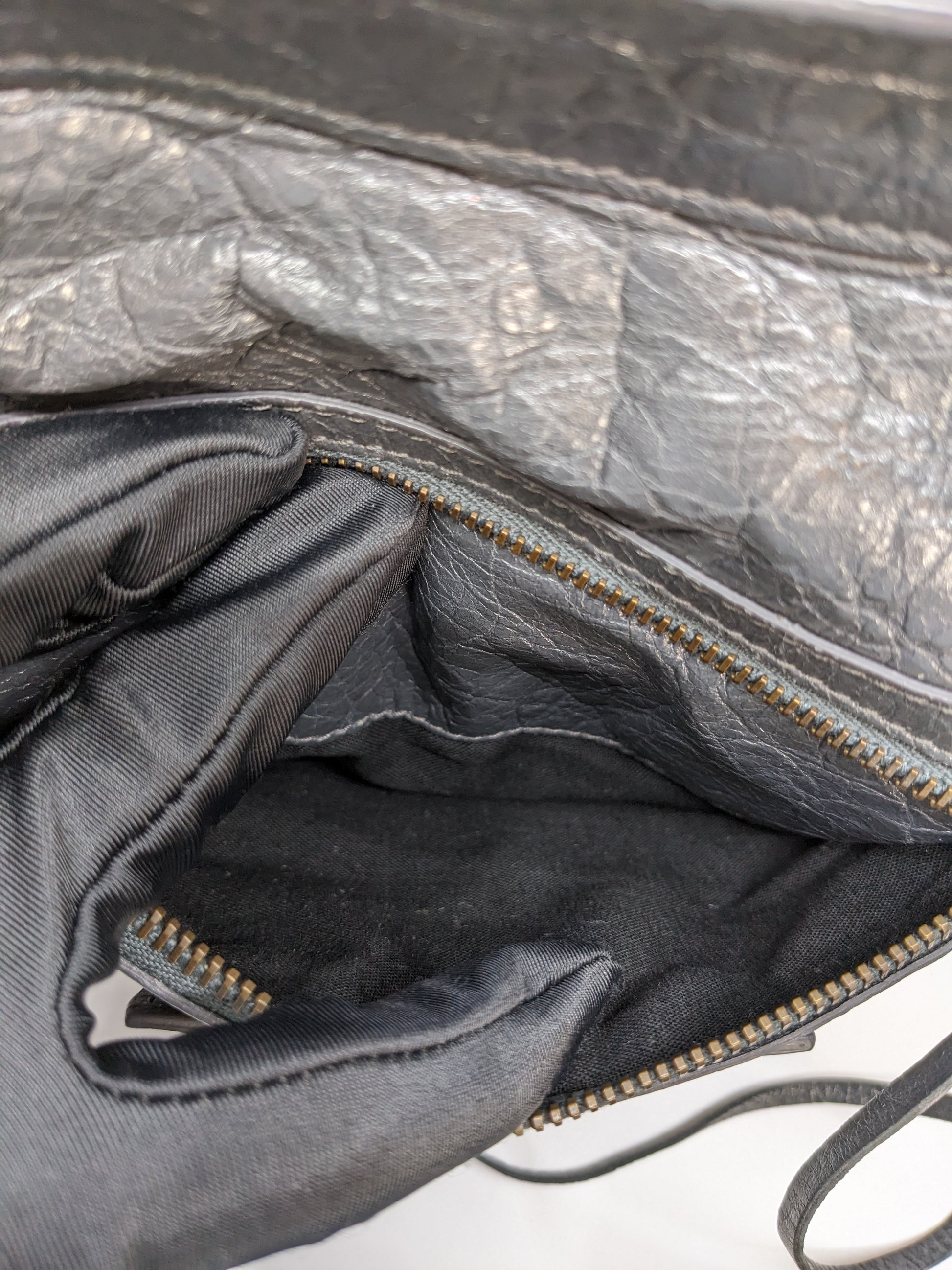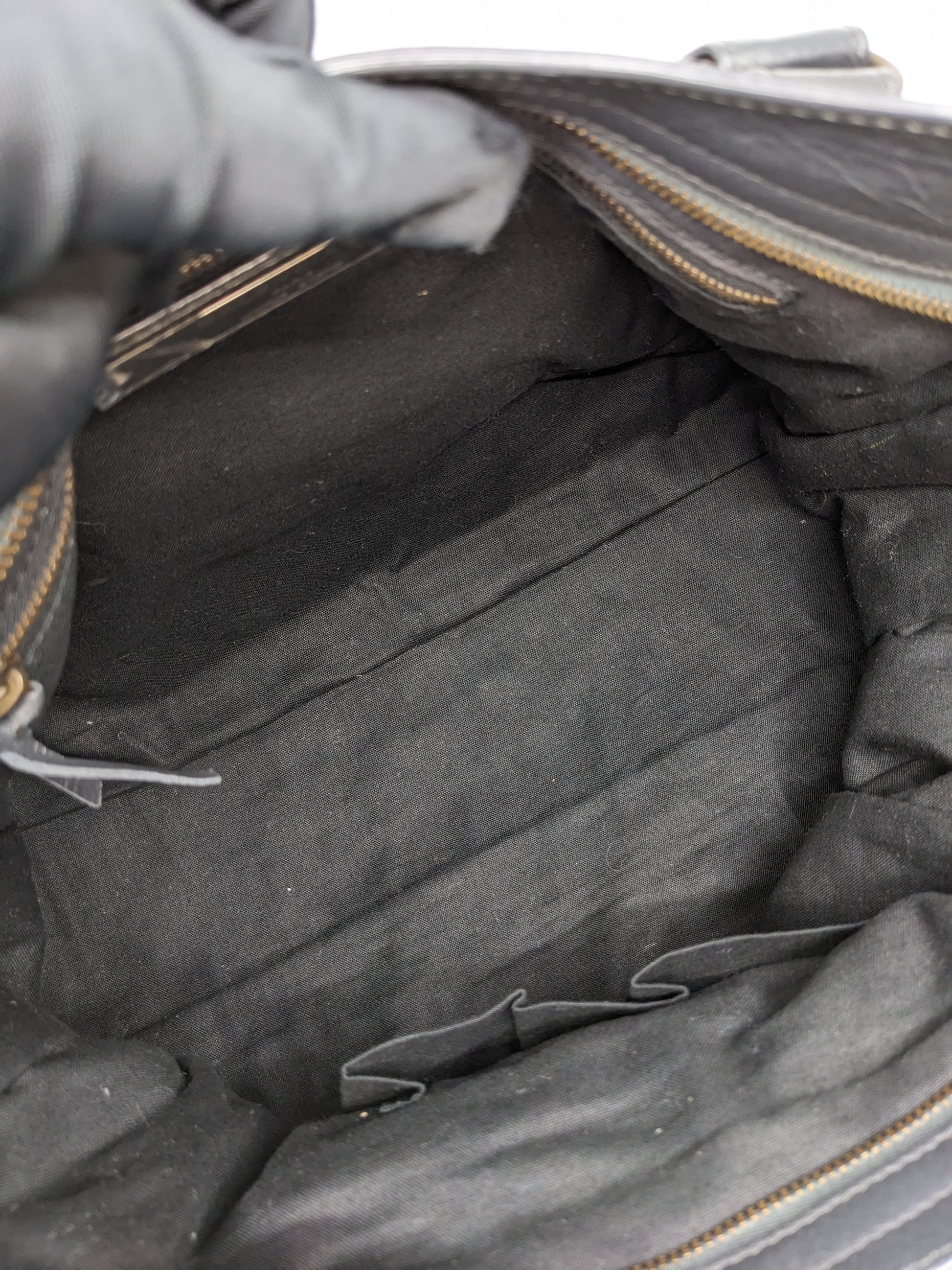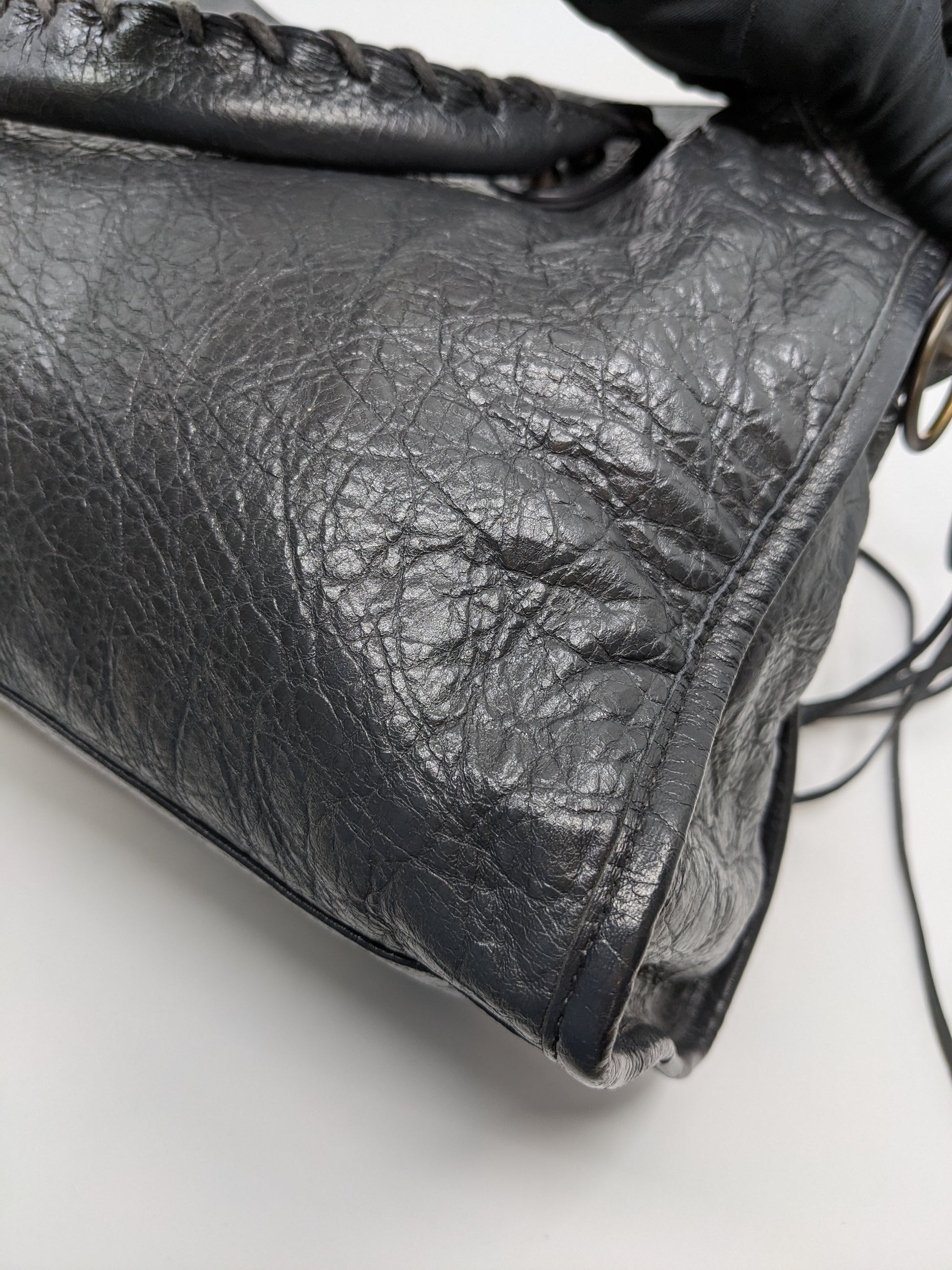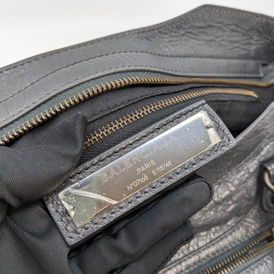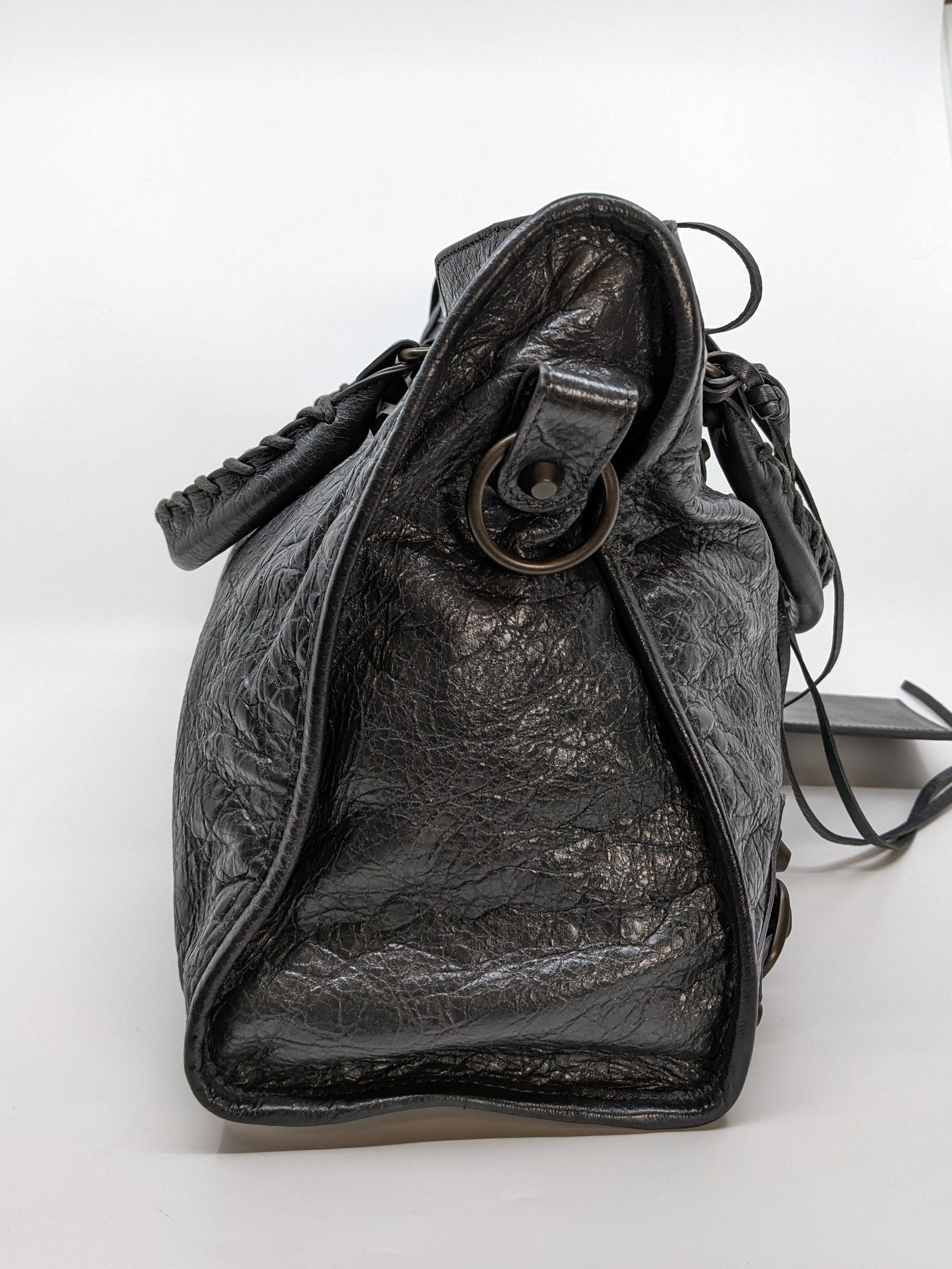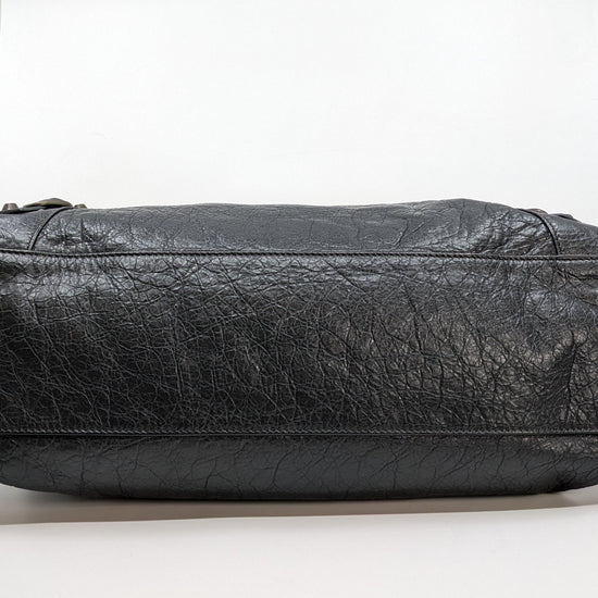 Balenciaga Medium City in dark grey, an iconic staple from the house known for its effortlessly cool, lived in aesthetic. Crafted from soft, supple leather, it features the signature studded hardware and relaxed silhouette. The spacious interior makes it perfect for everyday use while maintaining a lightweight feel. Designed with top handles and an optional shoulder strap for versatile wear. A timeless and edgy classic that remains a favorite among Balenciaga collectors.