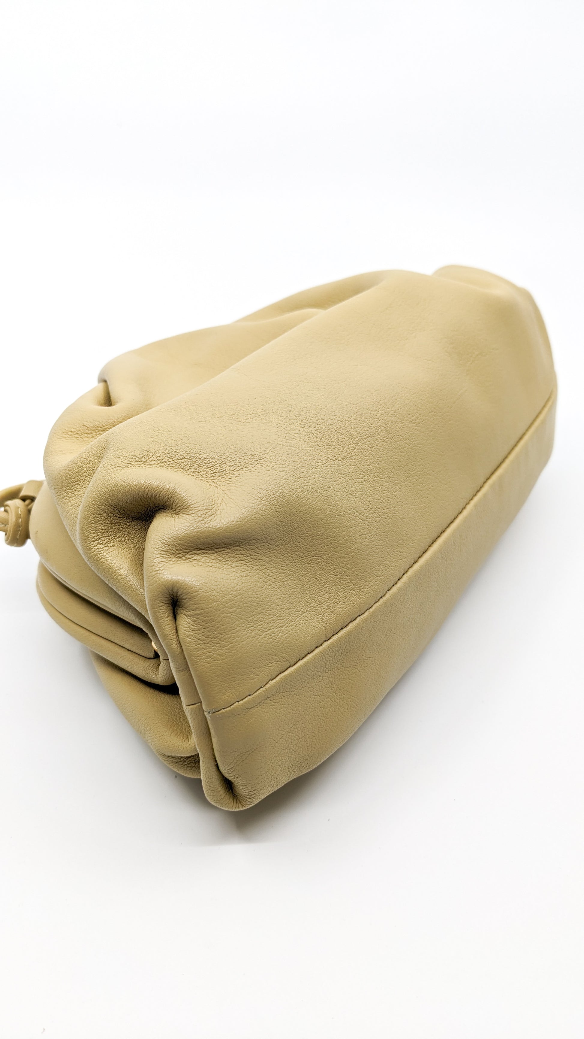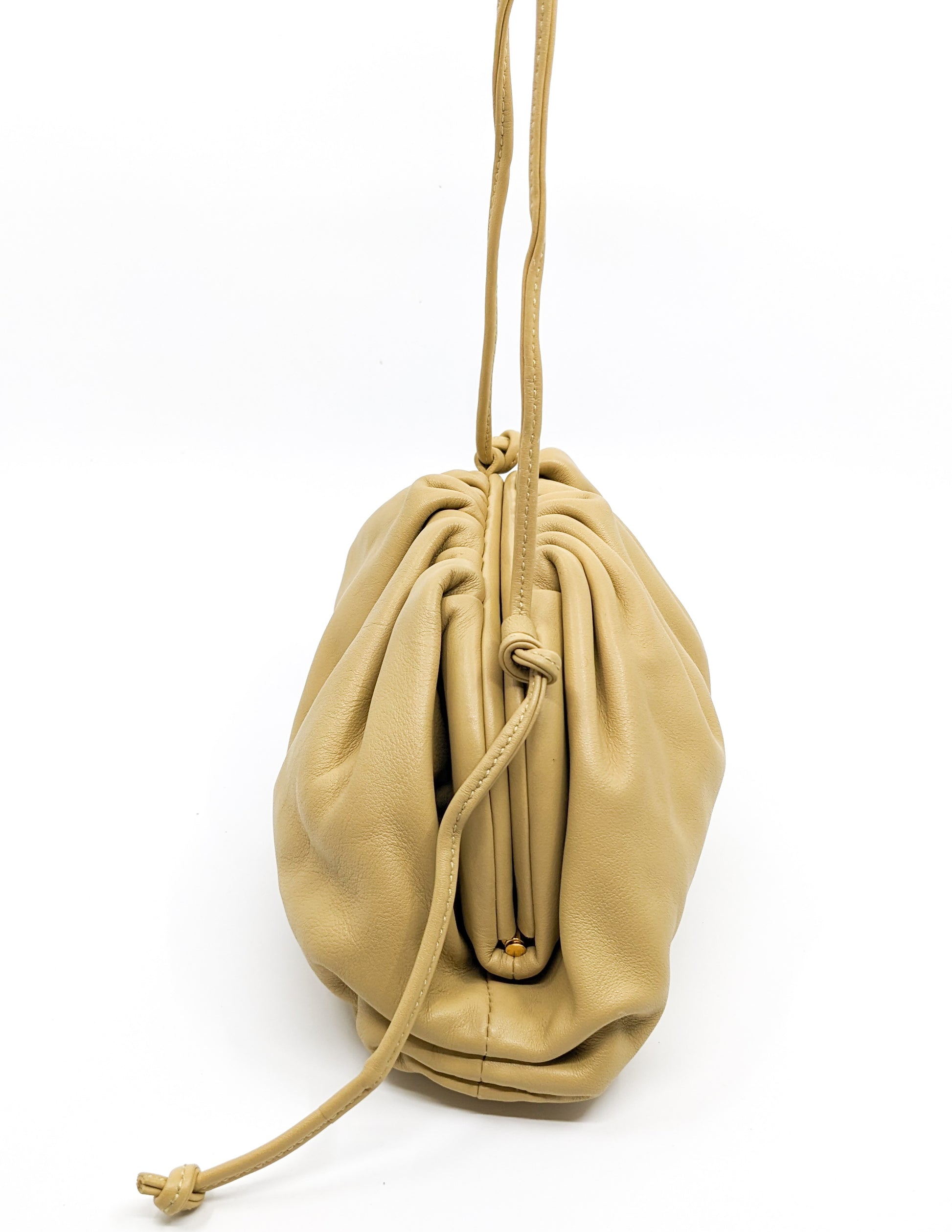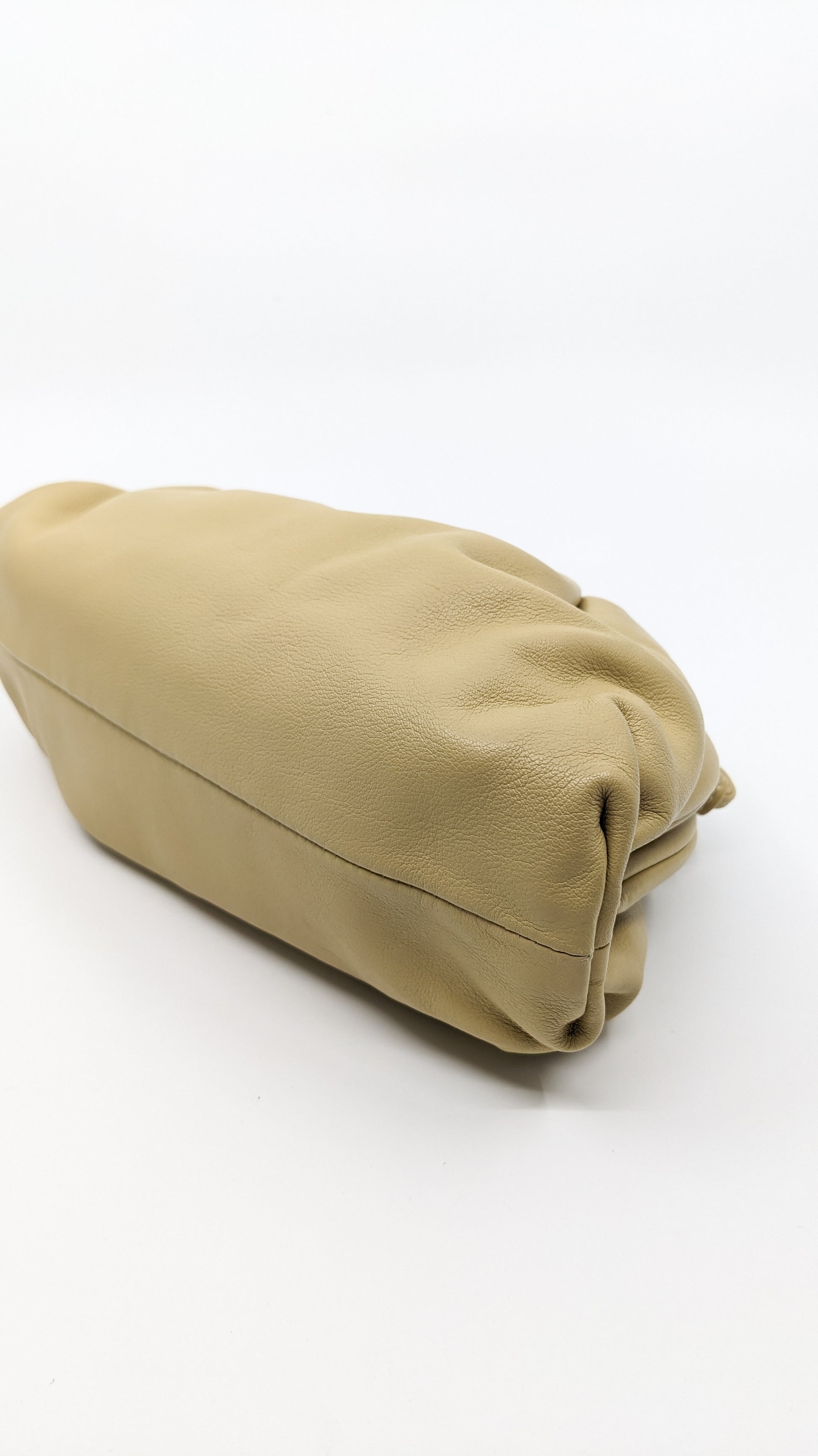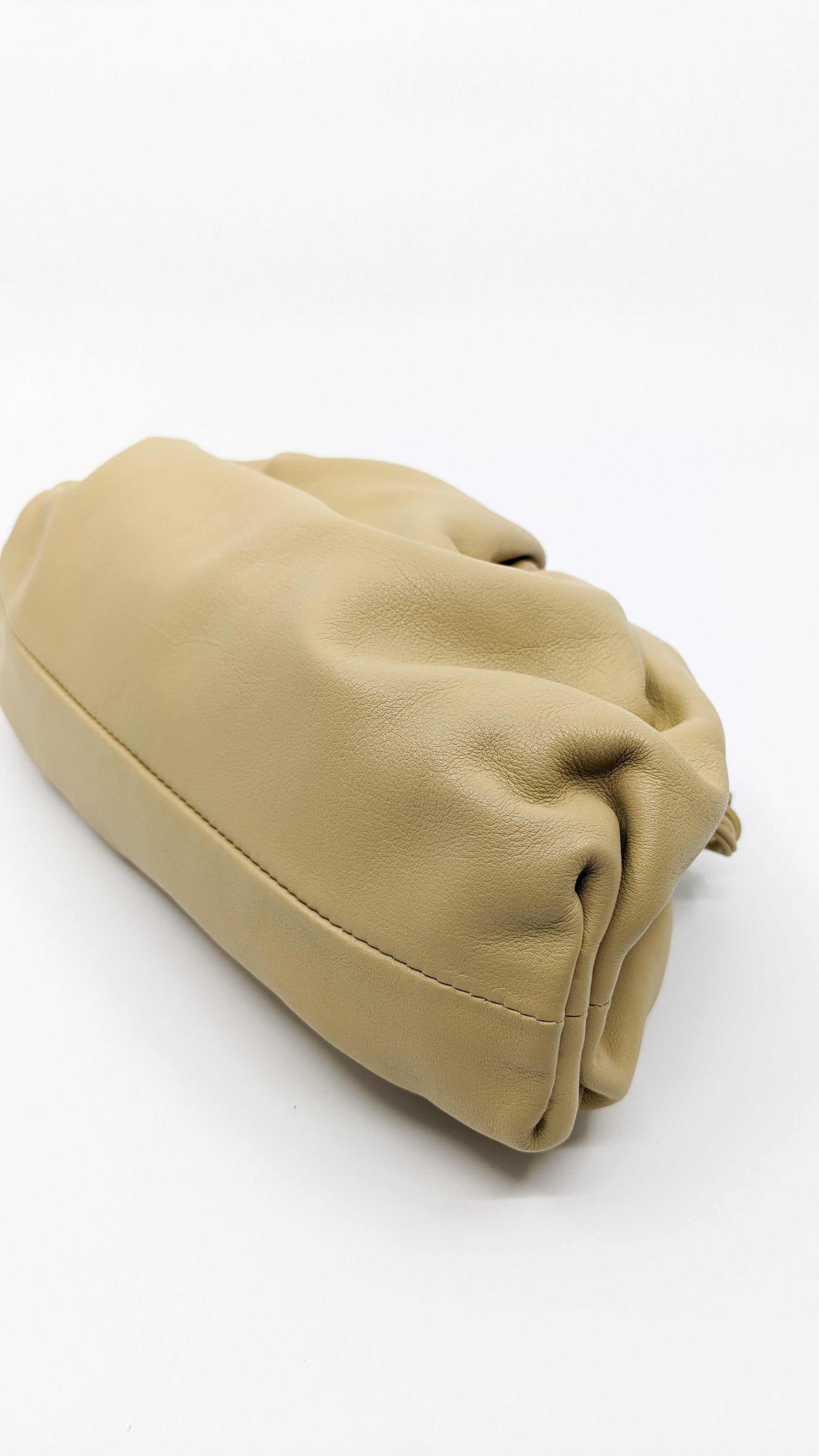 Buffed nappa calfskin clutch in beige. Adjustable and detachable leather shoulder strap with self-tie fastening. Gathering at hinged opening with magnetic fastening. Logo embossed at interior. Tonal leather lining. Gold-tone hardware. Approx. 8.5" length x 5" height x 2" width.
