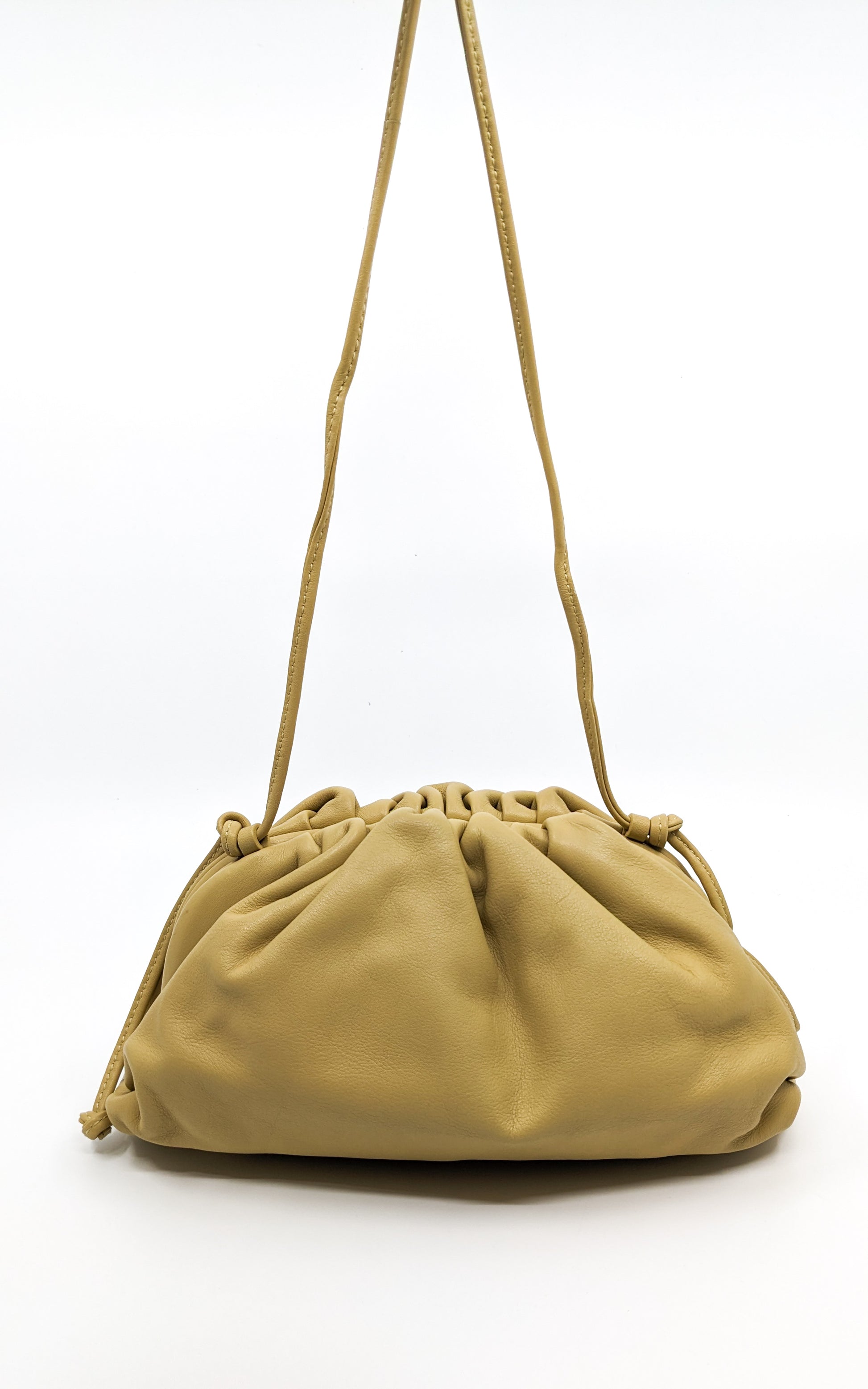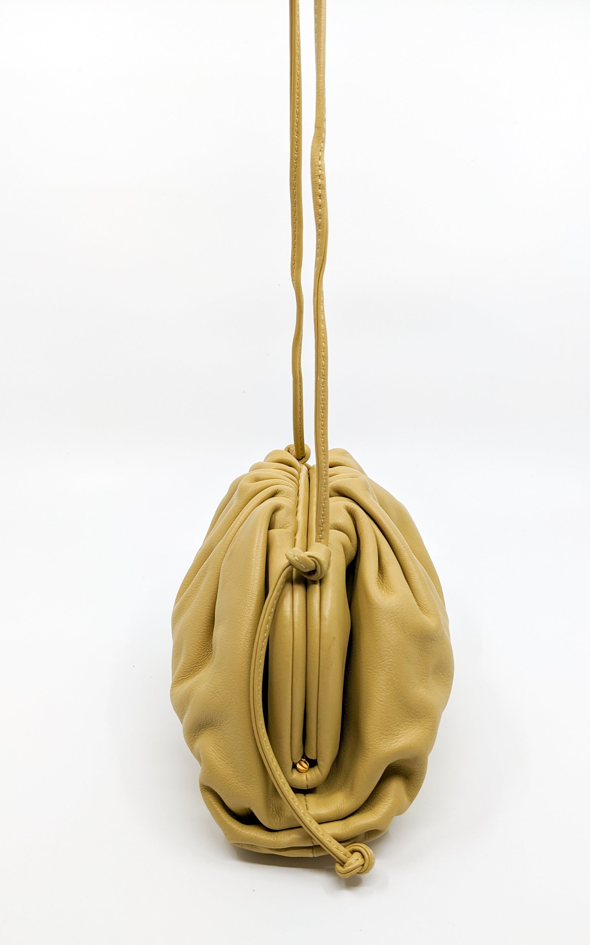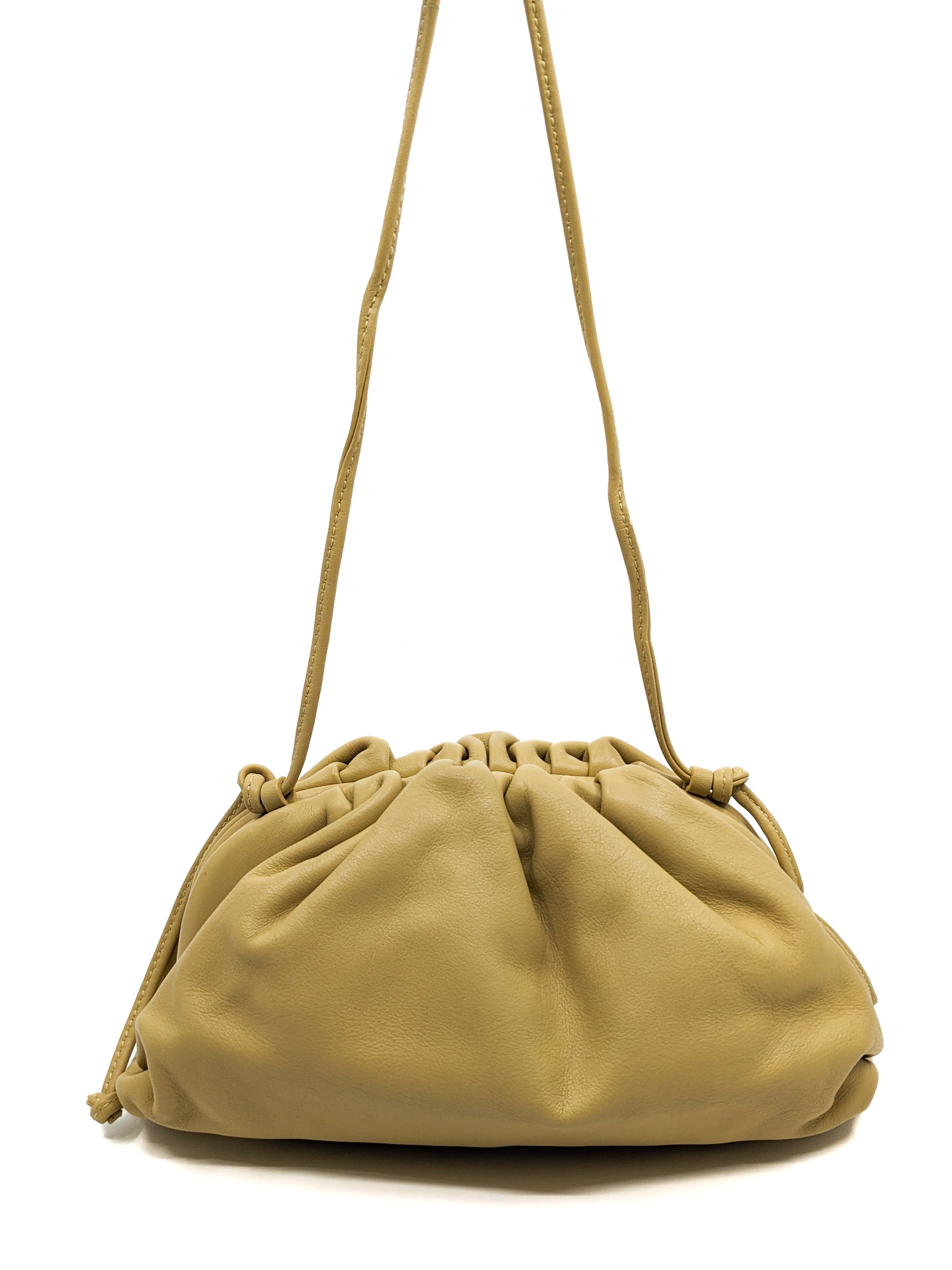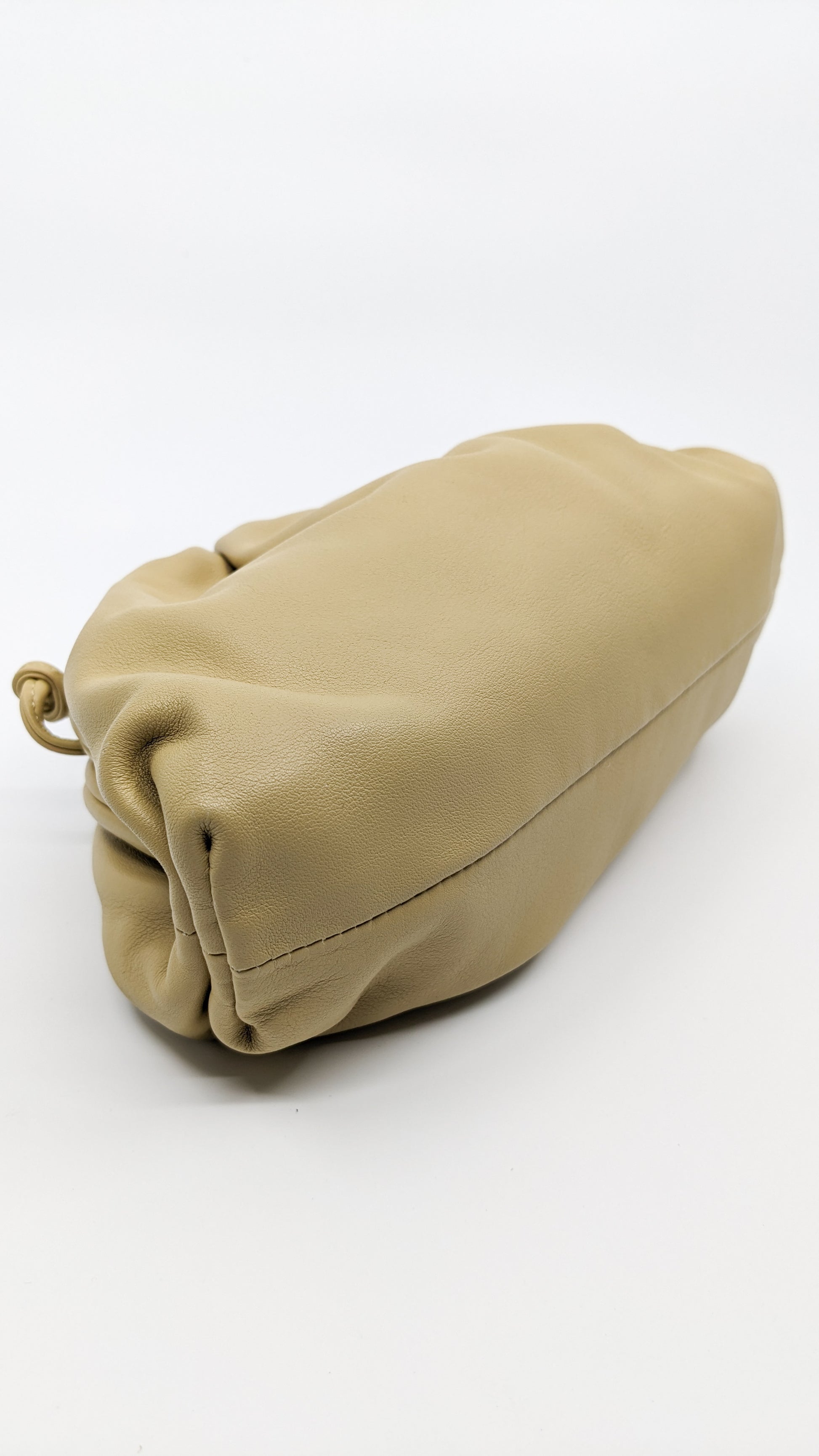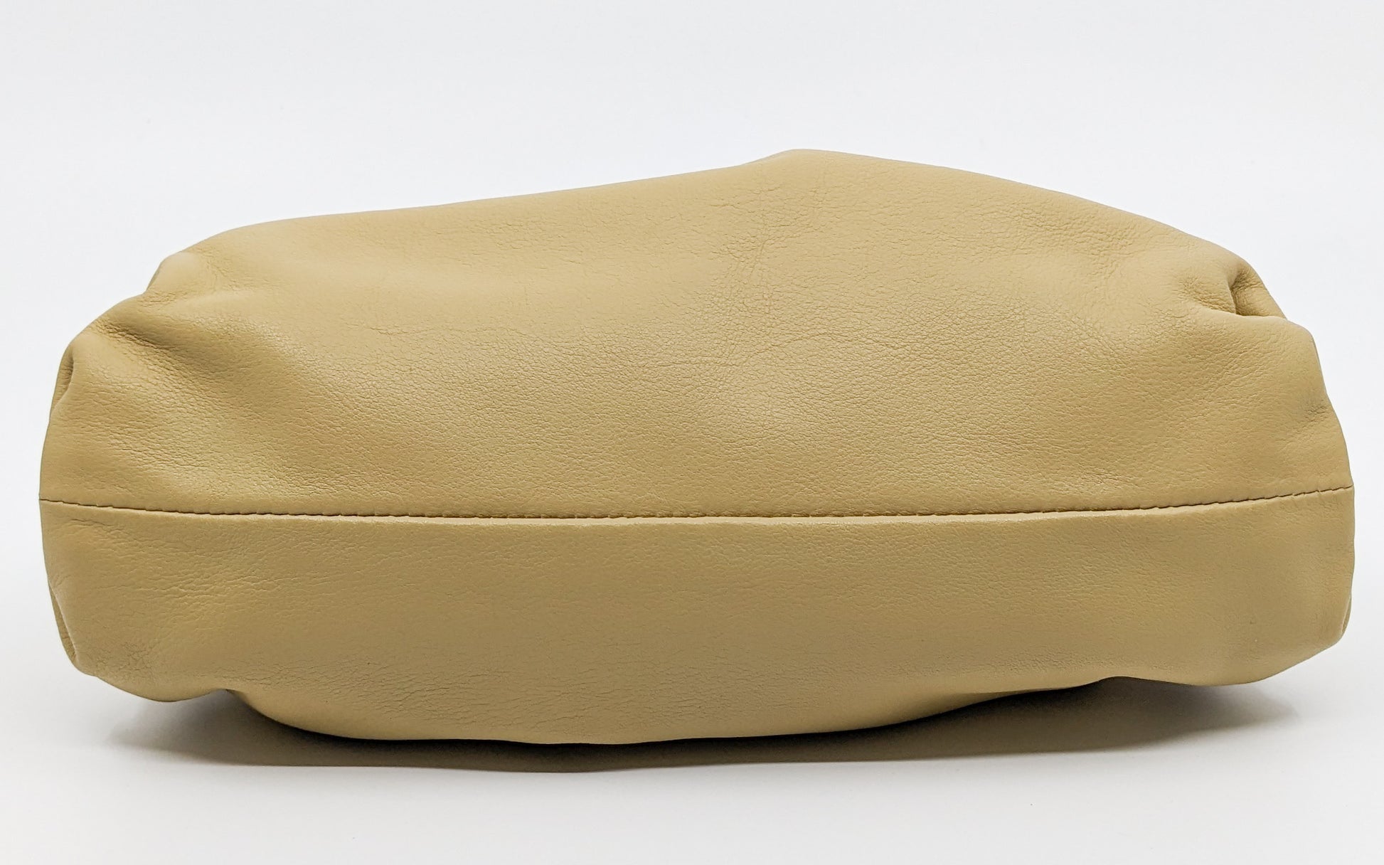 Buffed nappa calfskin clutch in beige. Adjustable and detachable leather shoulder strap with self-tie fastening. Gathering at hinged opening with magnetic fastening. Logo embossed at interior. Tonal leather lining. Gold-tone hardware. Approx. 8.5" length x 5" height x 2" width.
