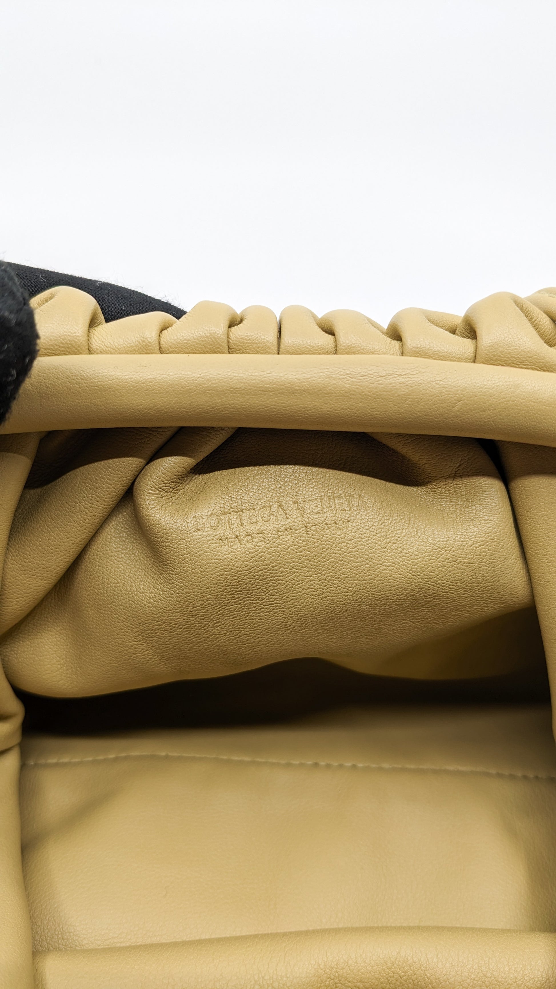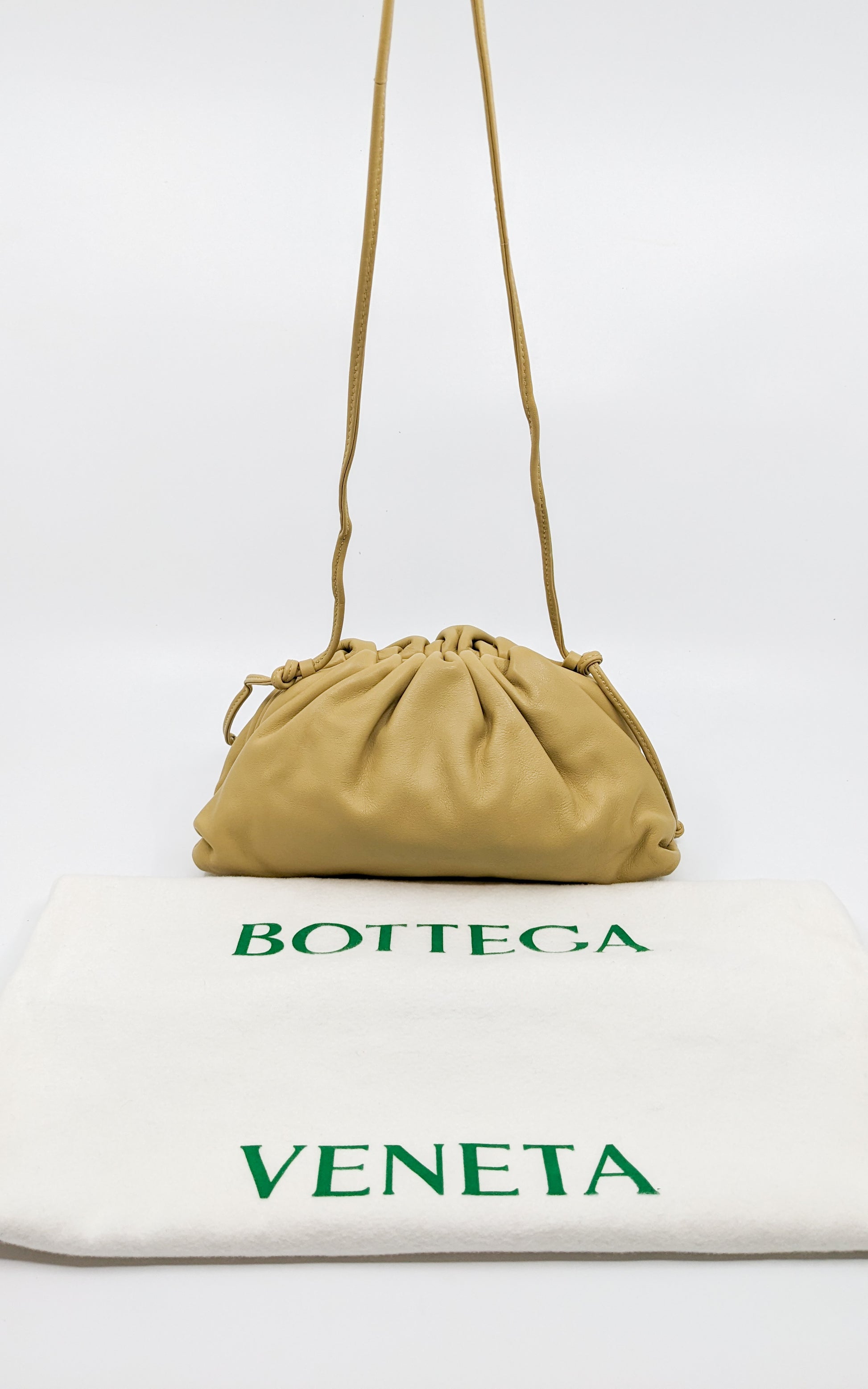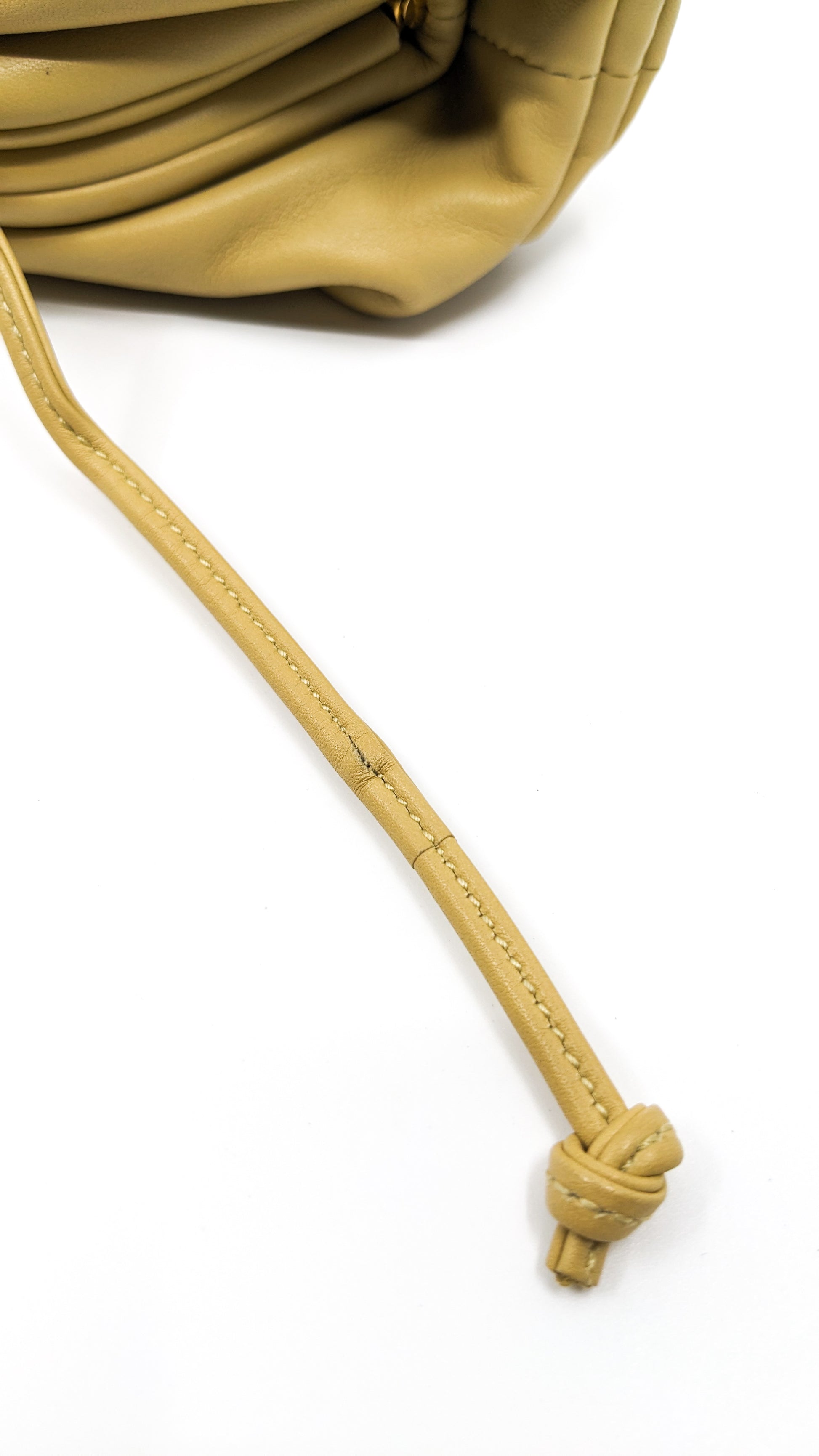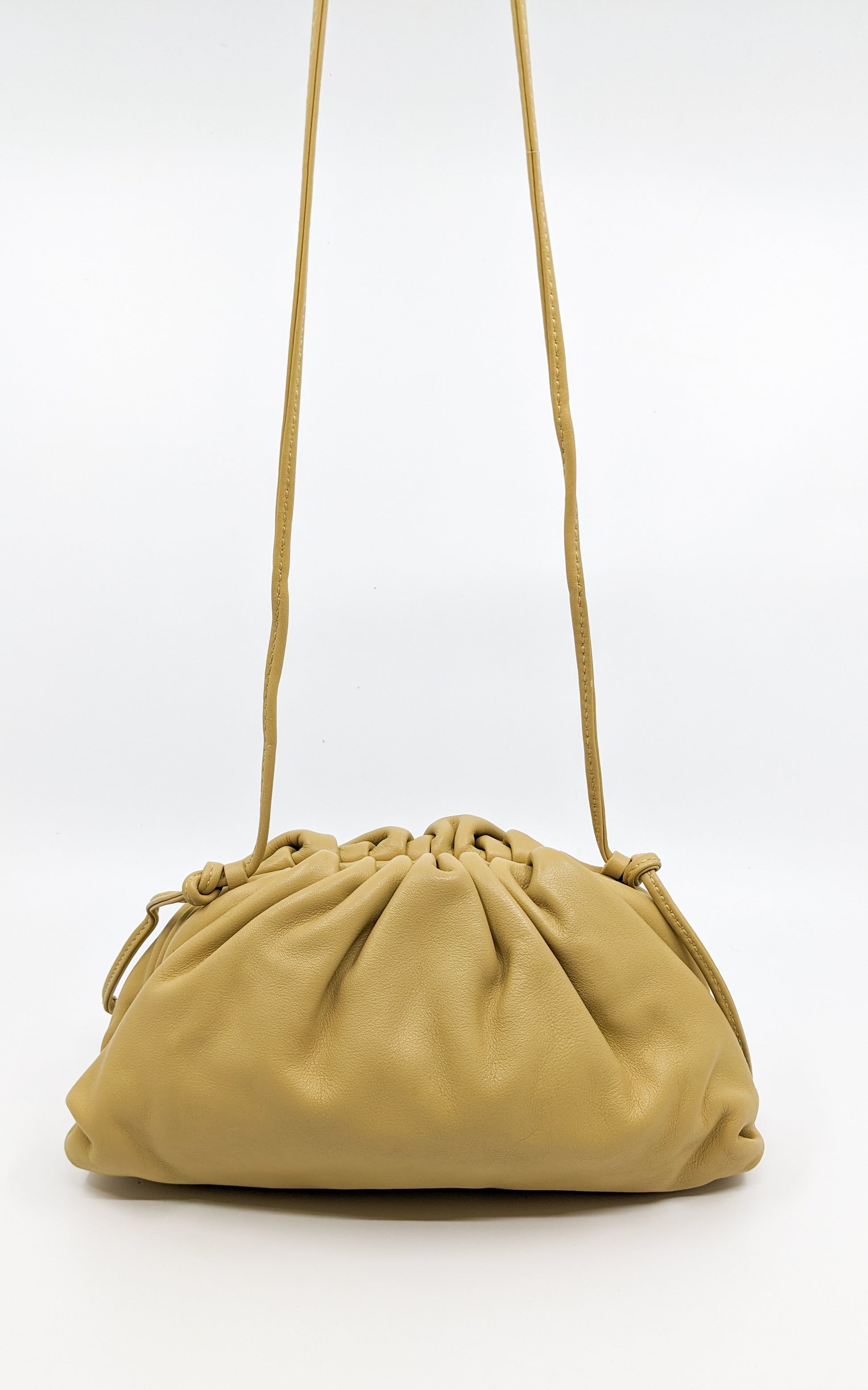 Buffed nappa calfskin clutch in beige. Adjustable and detachable leather shoulder strap with self-tie fastening. Gathering at hinged opening with magnetic fastening. Logo embossed at interior. Tonal leather lining. Gold-tone hardware. Approx. 8.5" length x 5" height x 2" width.