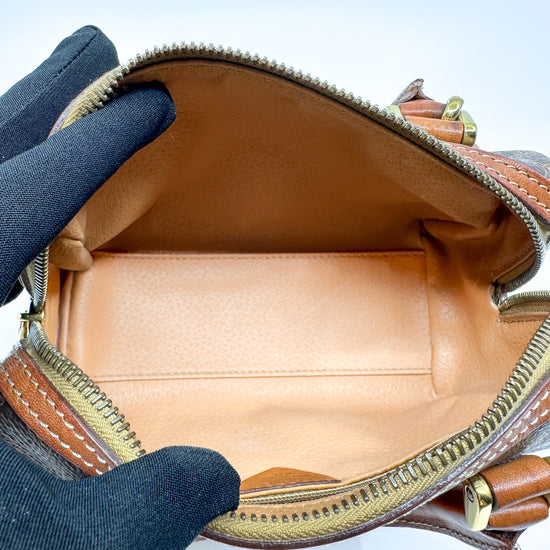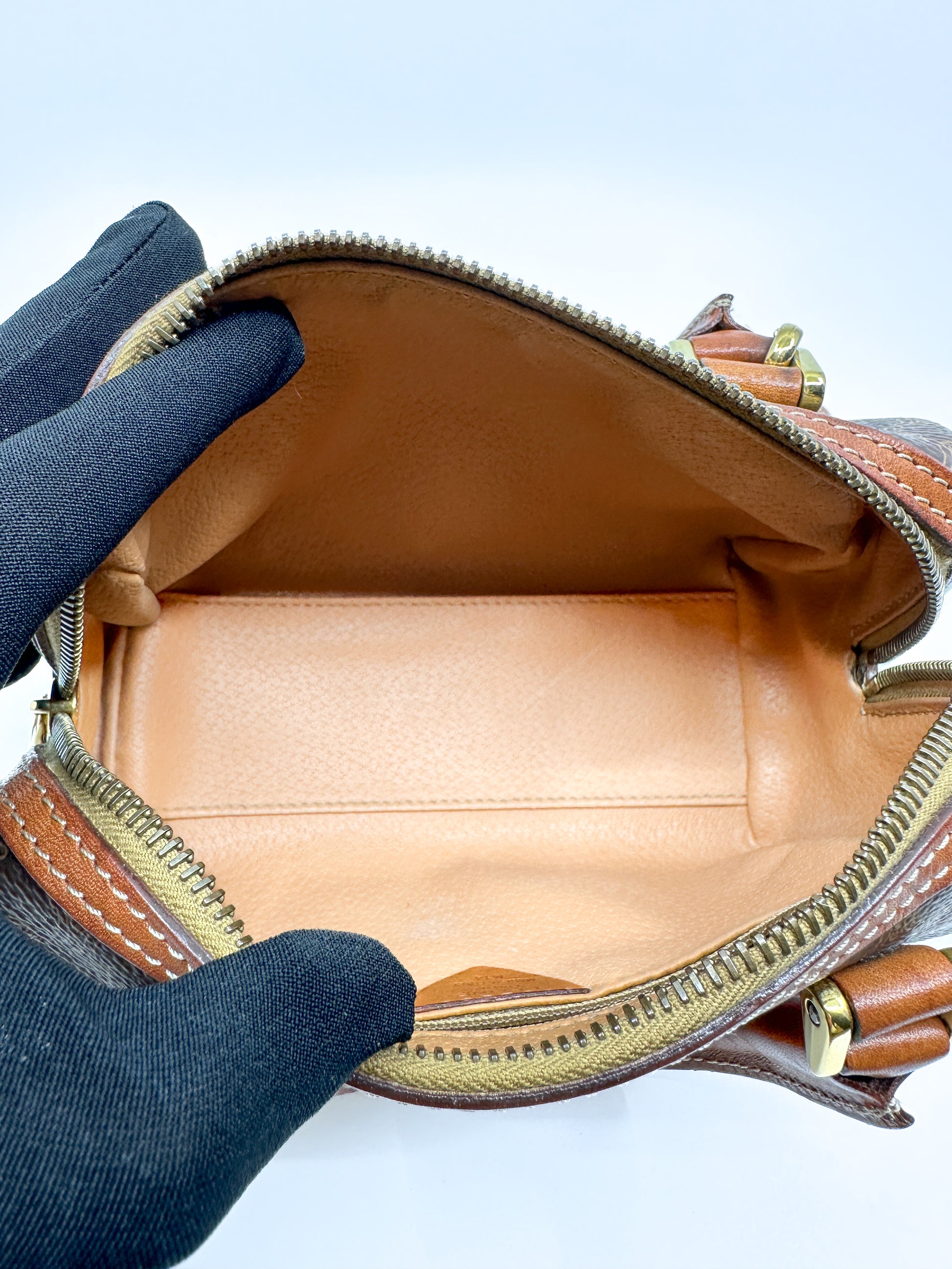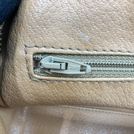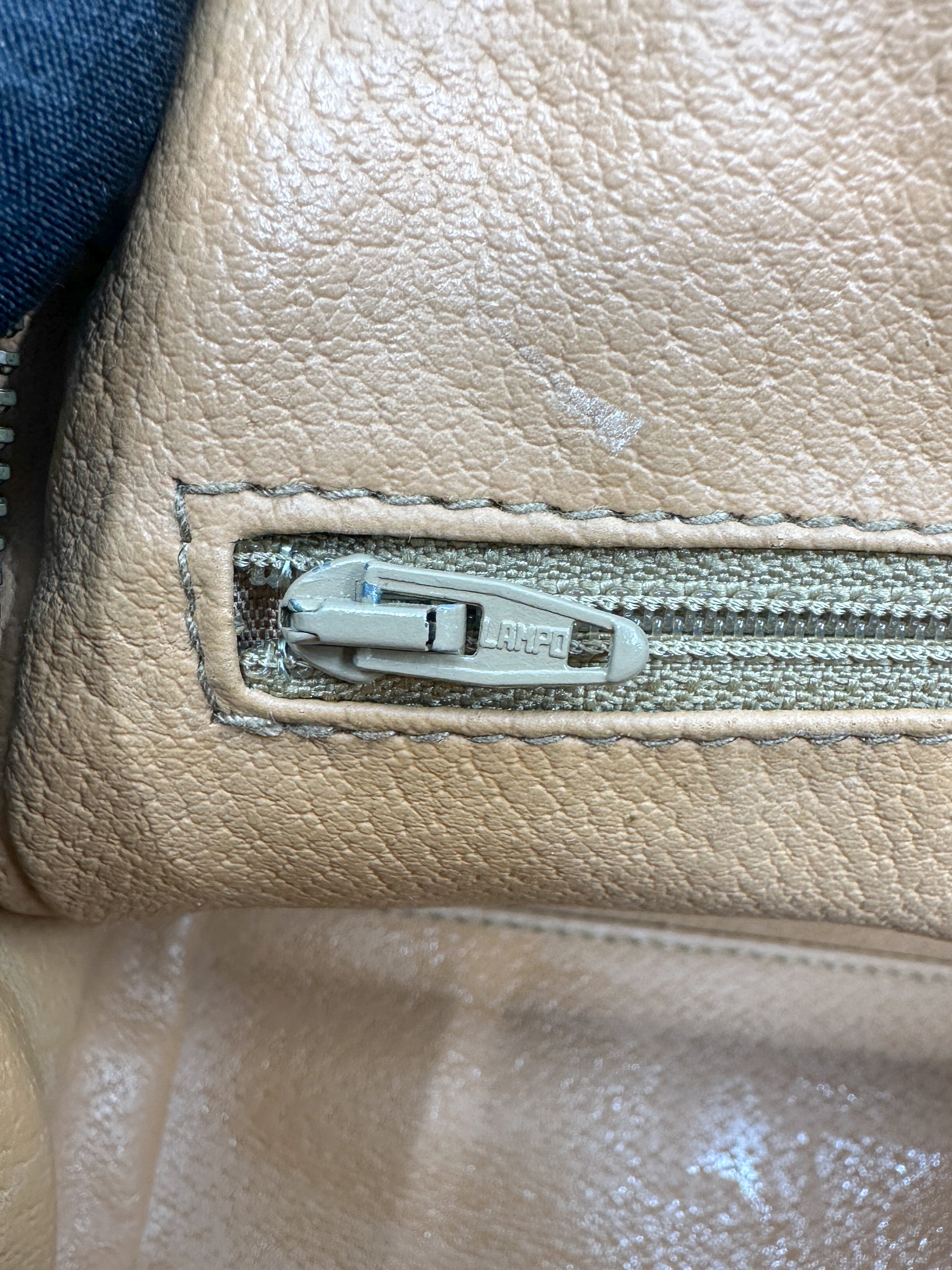 - Condition: Very good. Light marks on the hardware. Light scuffs at corners. The leather has a golden tan with some dark spots near the gold hardware.