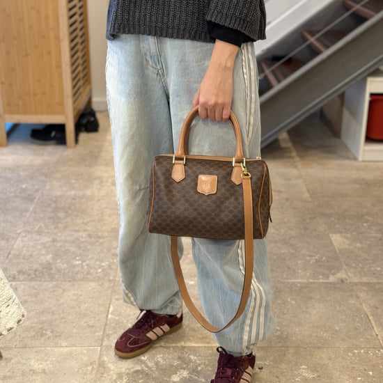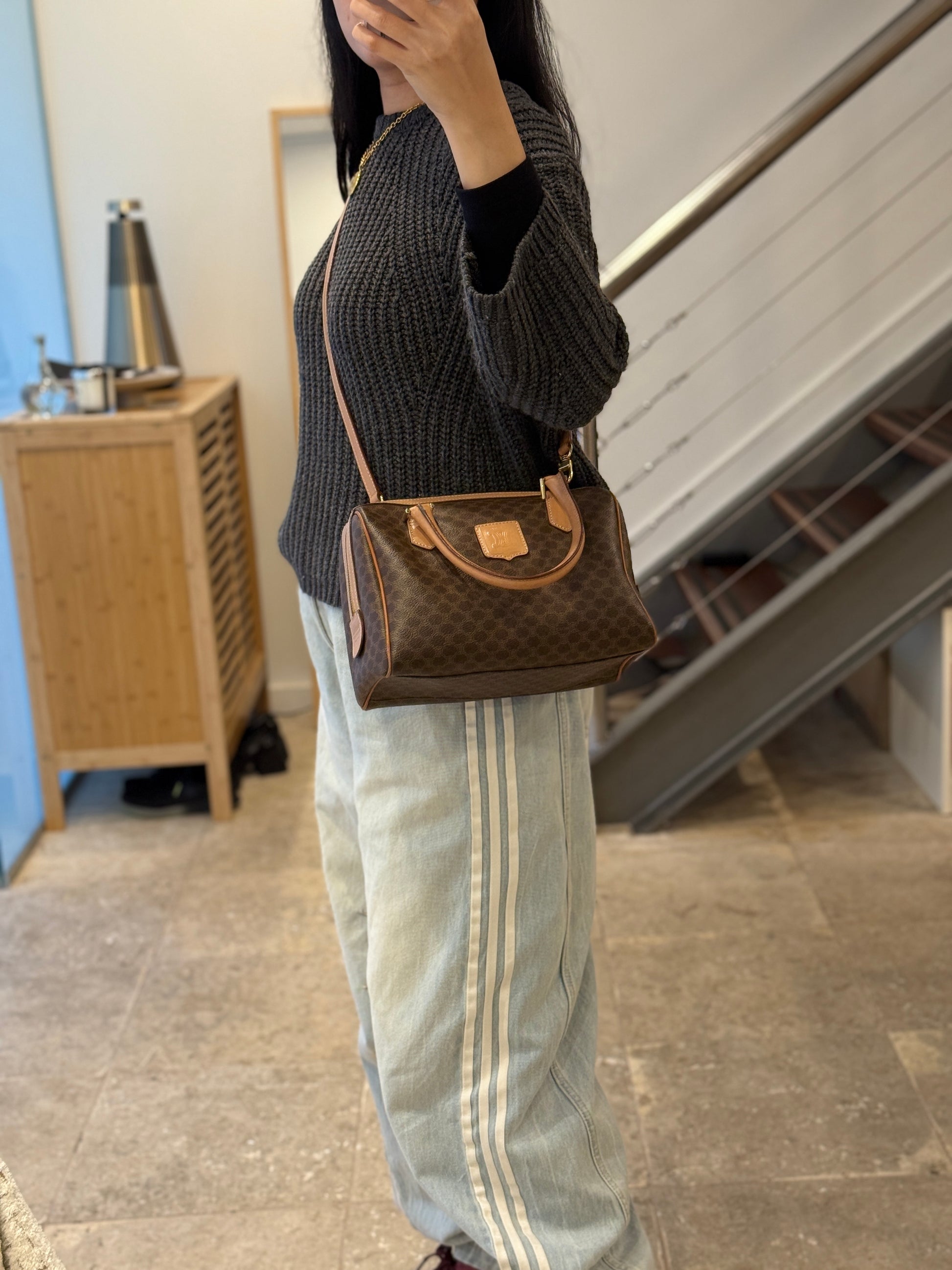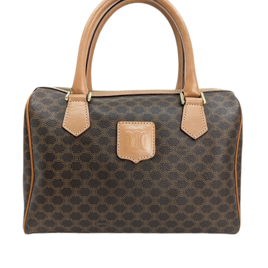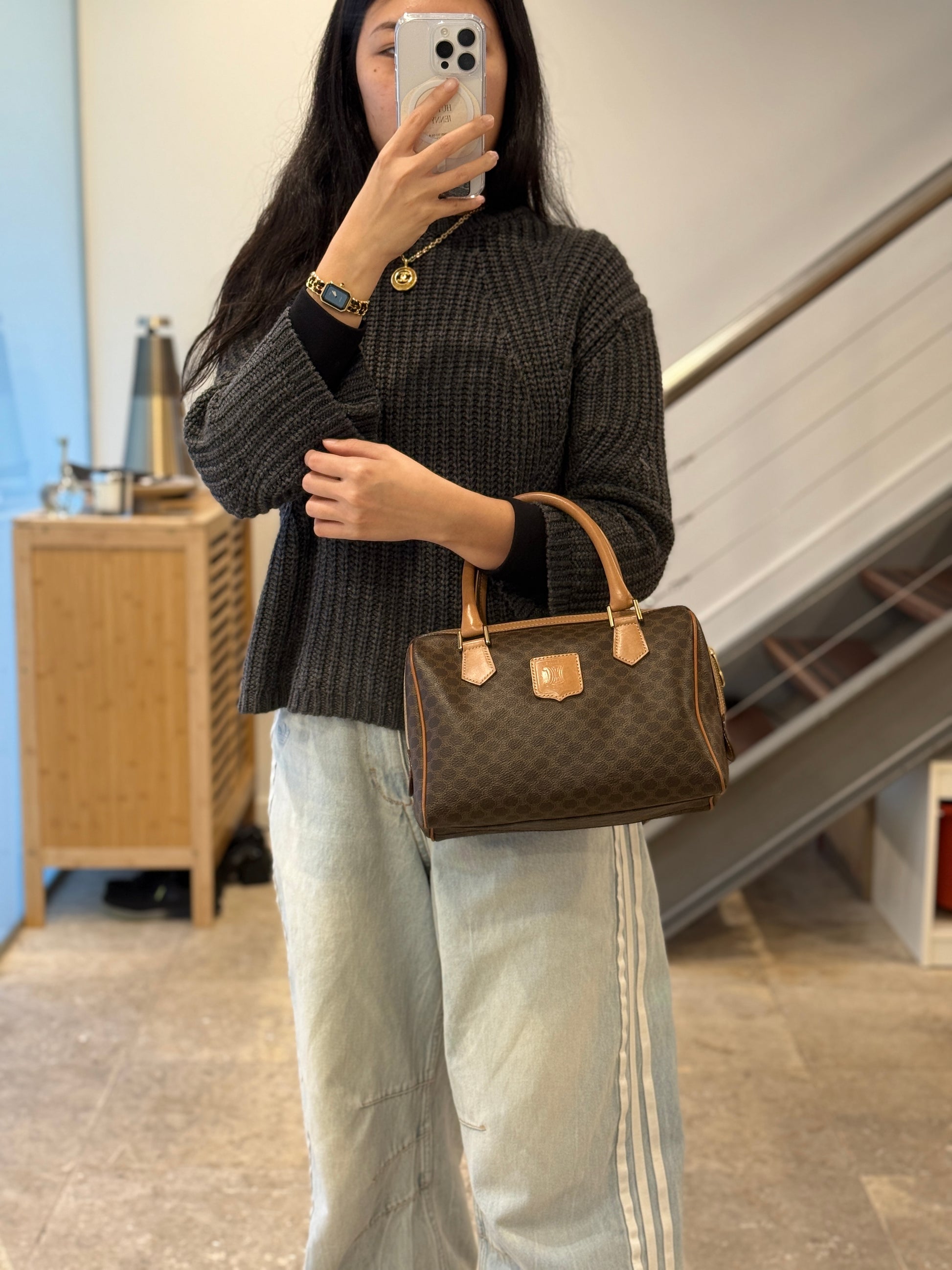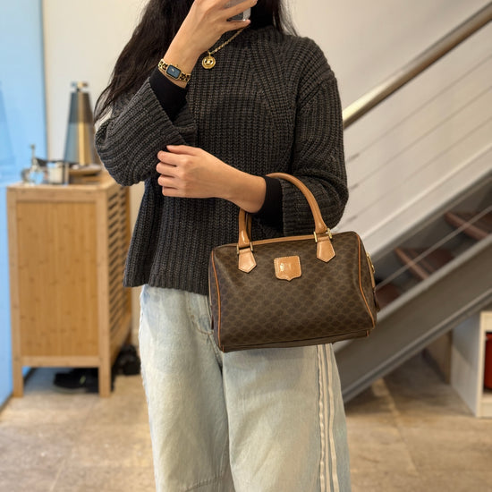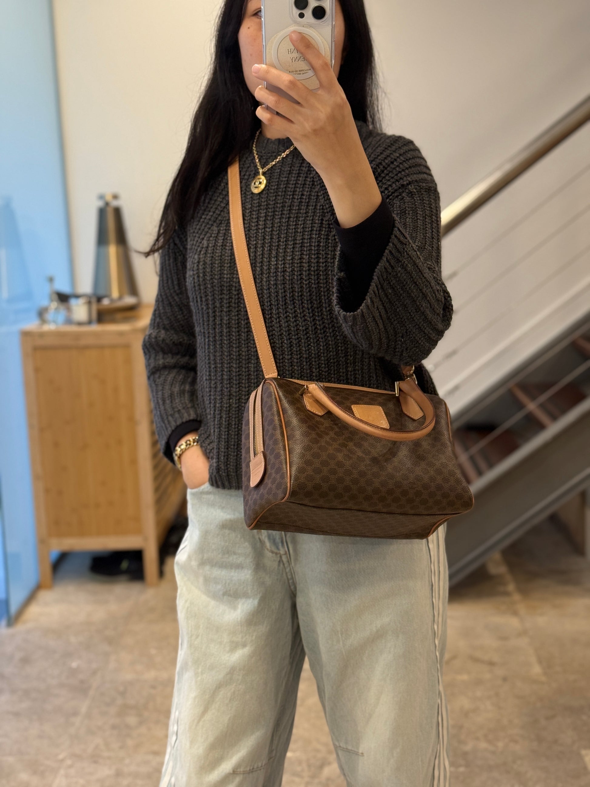 The vintage Celine Boston Bag 25cm is a compact yet timeless piece, often crafted in the brand’s iconic Macadam canvas with leather trim and gold-tone hardware. Its structured silhouette features a zip-around closure and a roomy interior, perfect for daily essentials.