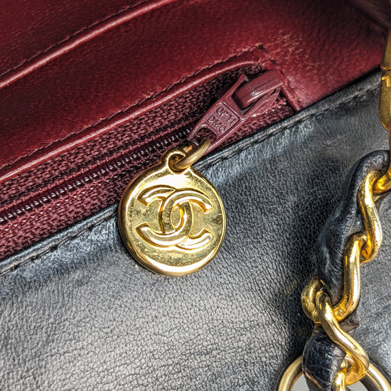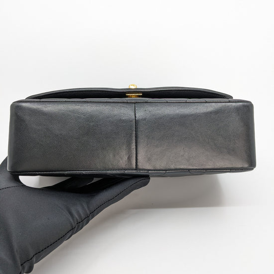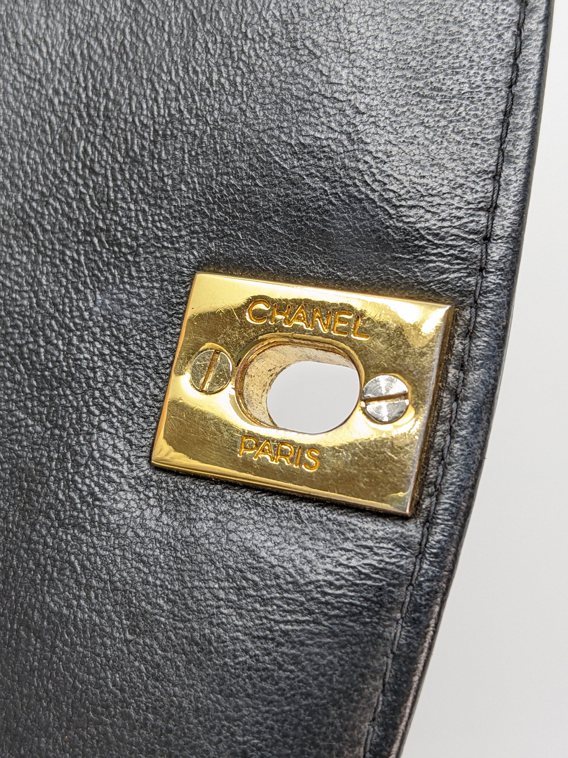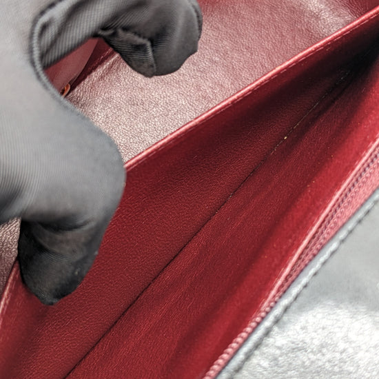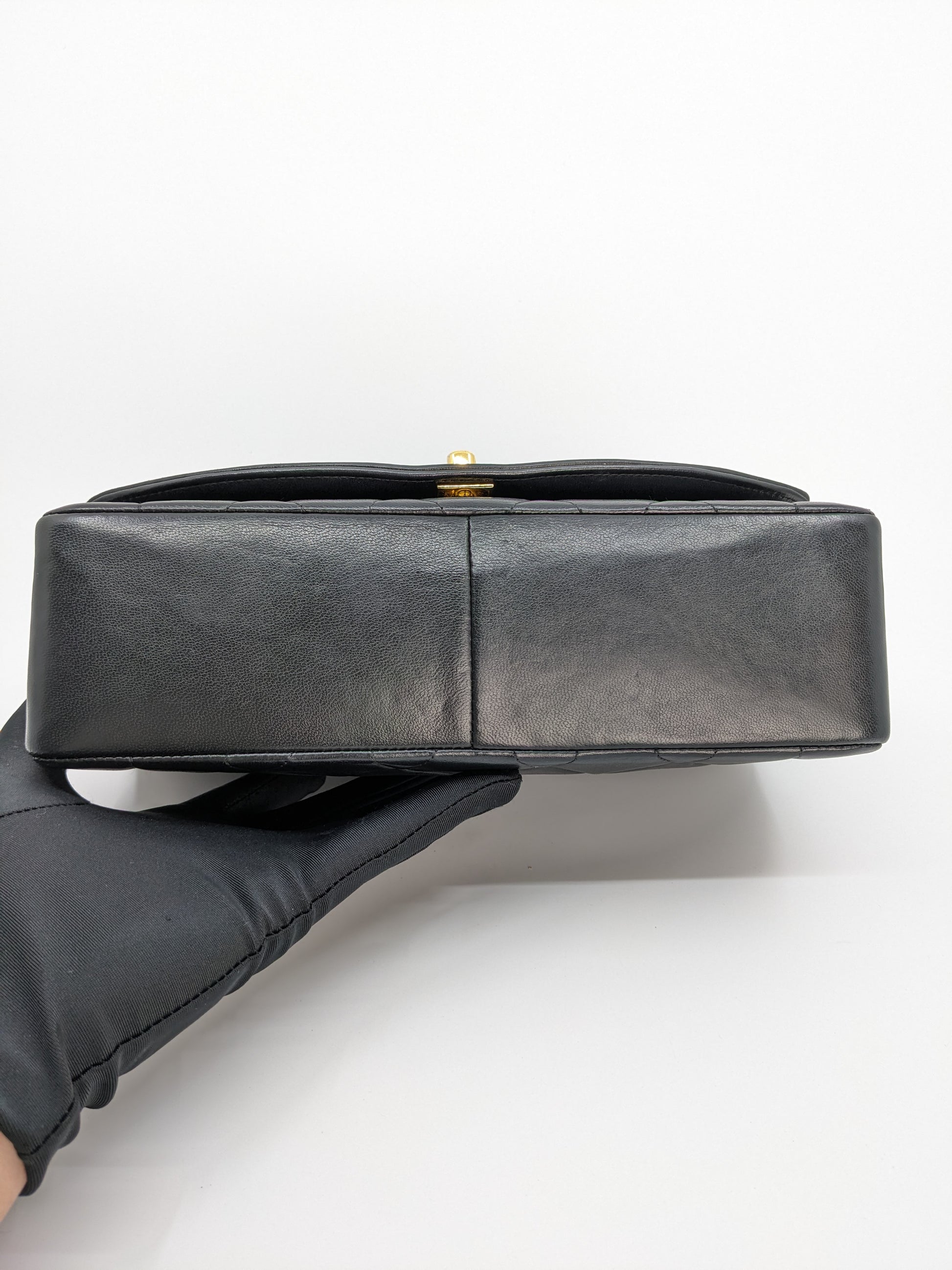 Crafted from luxurious black lambskin leather, it features the signature curved front flap, elegant quilted body, and 24k gold-plated hardware. The bag includes a single flap with a CC turn-lock closure, a leather-interwoven chain strap, and a burgundy leather interior. The medium size offers enough room for essentials while maintaining a sleek, timeless silhouette. A true collector’s gem that embodies classic Chanel elegance.