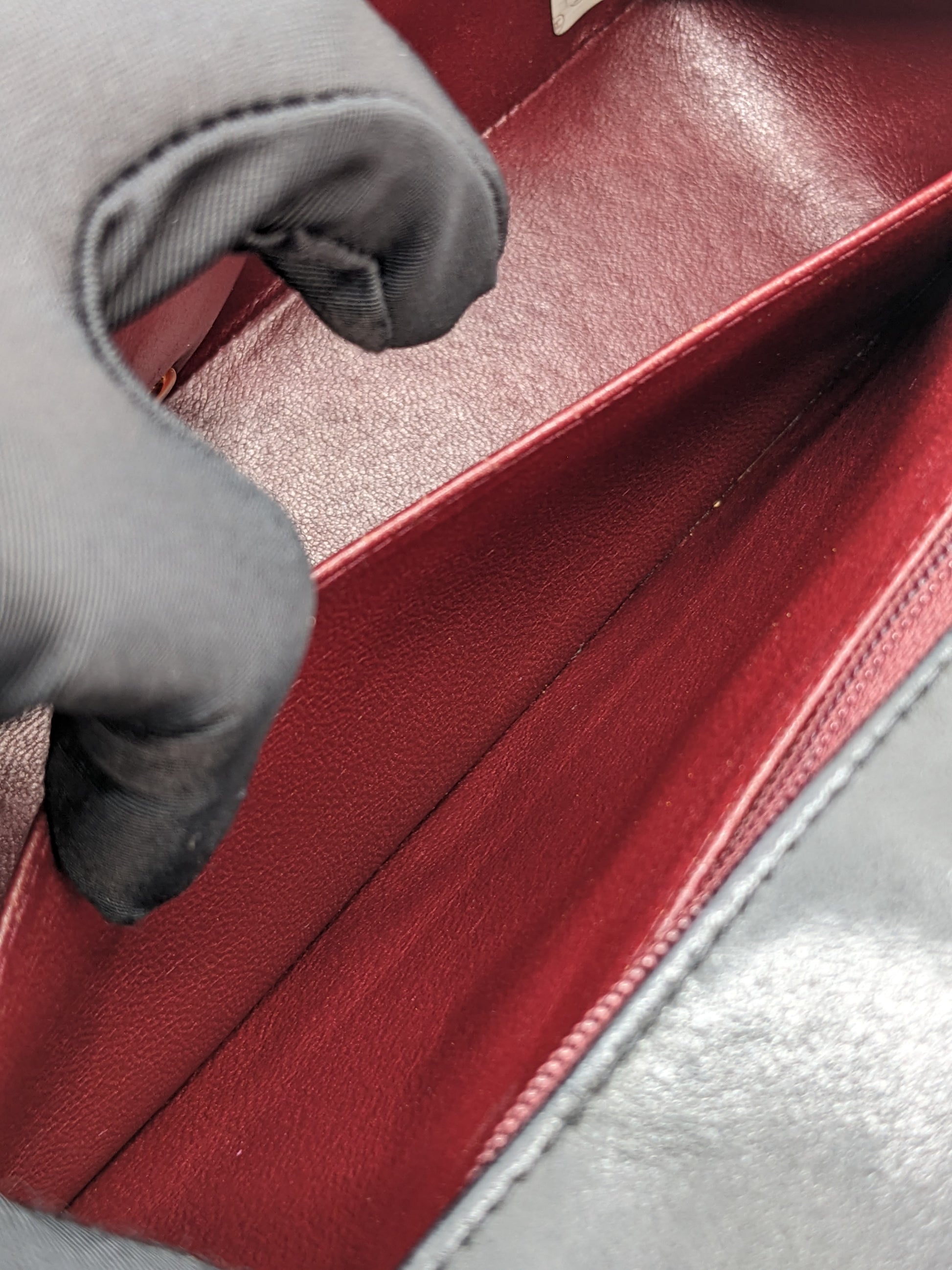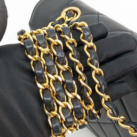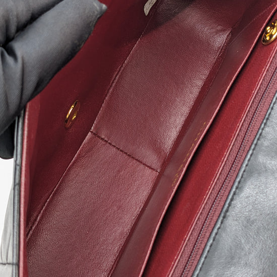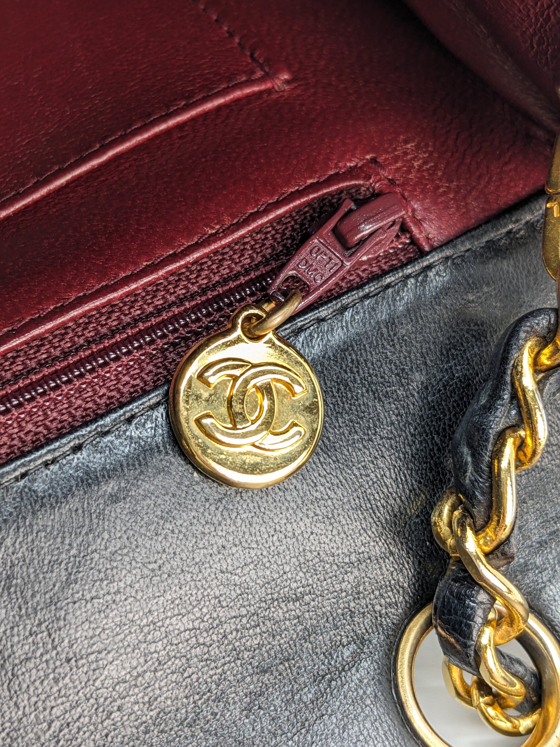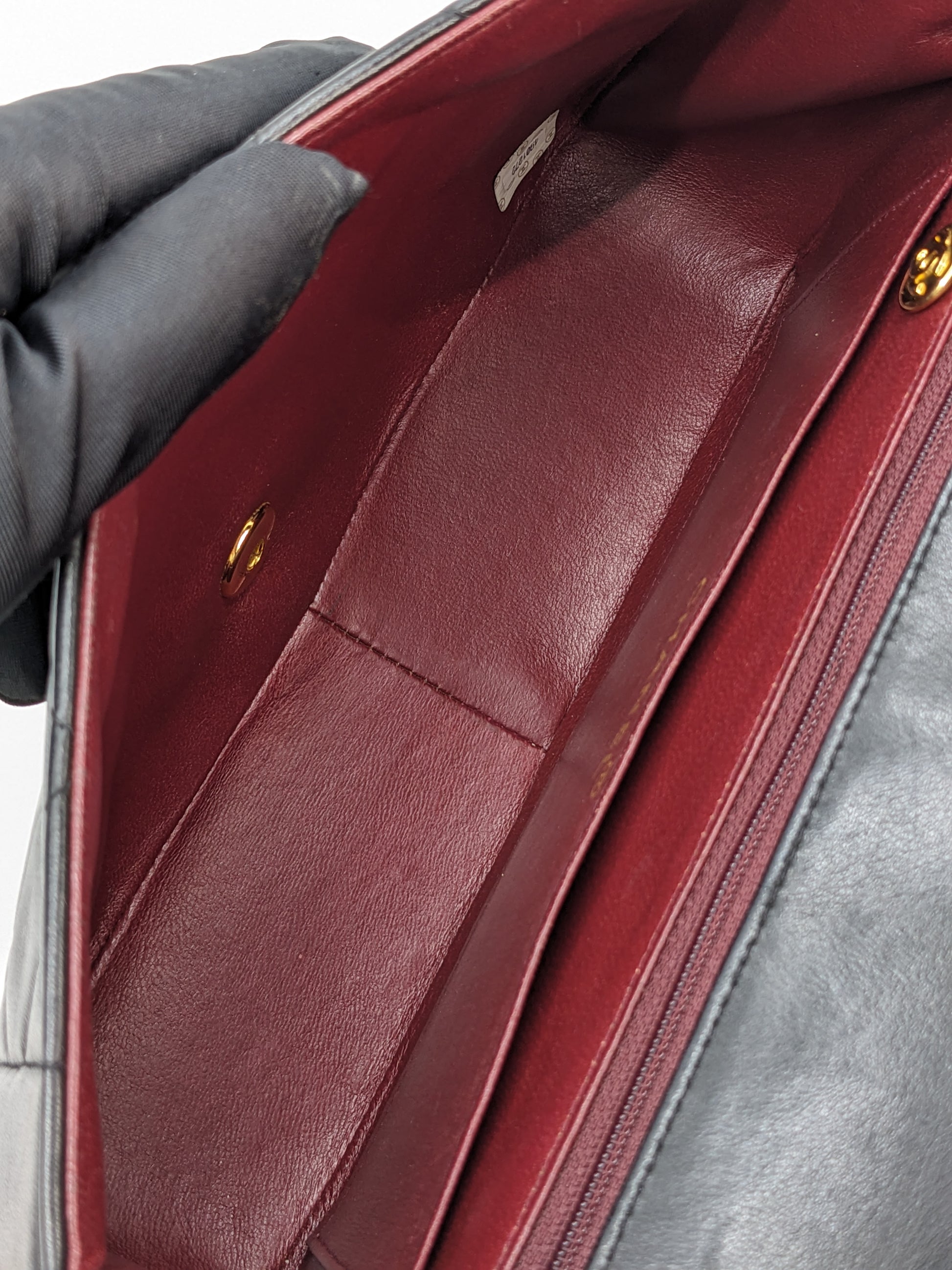 Crafted from luxurious black lambskin leather, it features the signature curved front flap, elegant quilted body, and 24k gold-plated hardware. The bag includes a single flap with a CC turn-lock closure, a leather-interwoven chain strap, and a burgundy leather interior. The medium size offers enough room for essentials while maintaining a sleek, timeless silhouette. A true collector’s gem that embodies classic Chanel elegance.