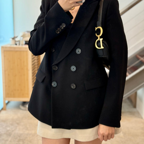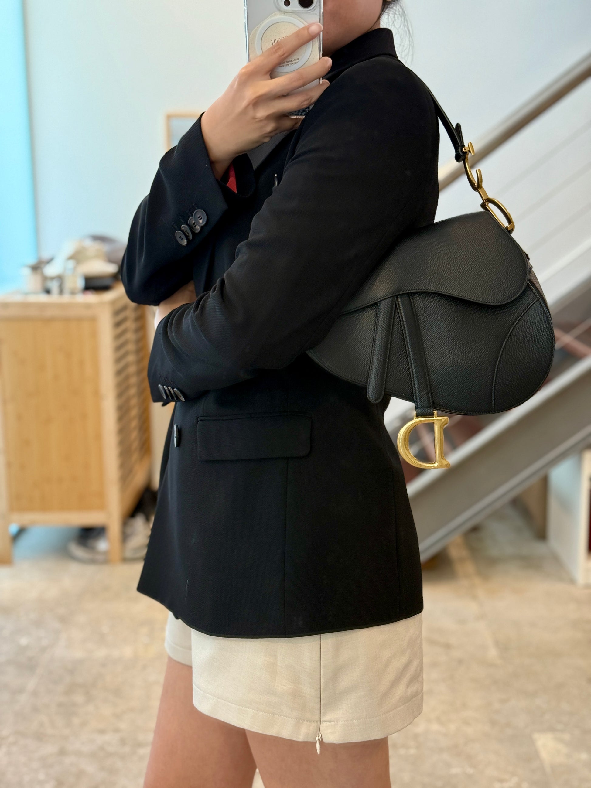 The Dior Saddle Bag in Medium Black is an iconic fashion statement, originally introduced in 1999 and reimagined by Maria Grazia Chiuri in recent collections. Crafted from grained calfskin, it features the signature asymmetrical silhouette with magnetic flap closure and bold “D” stirrup charm.