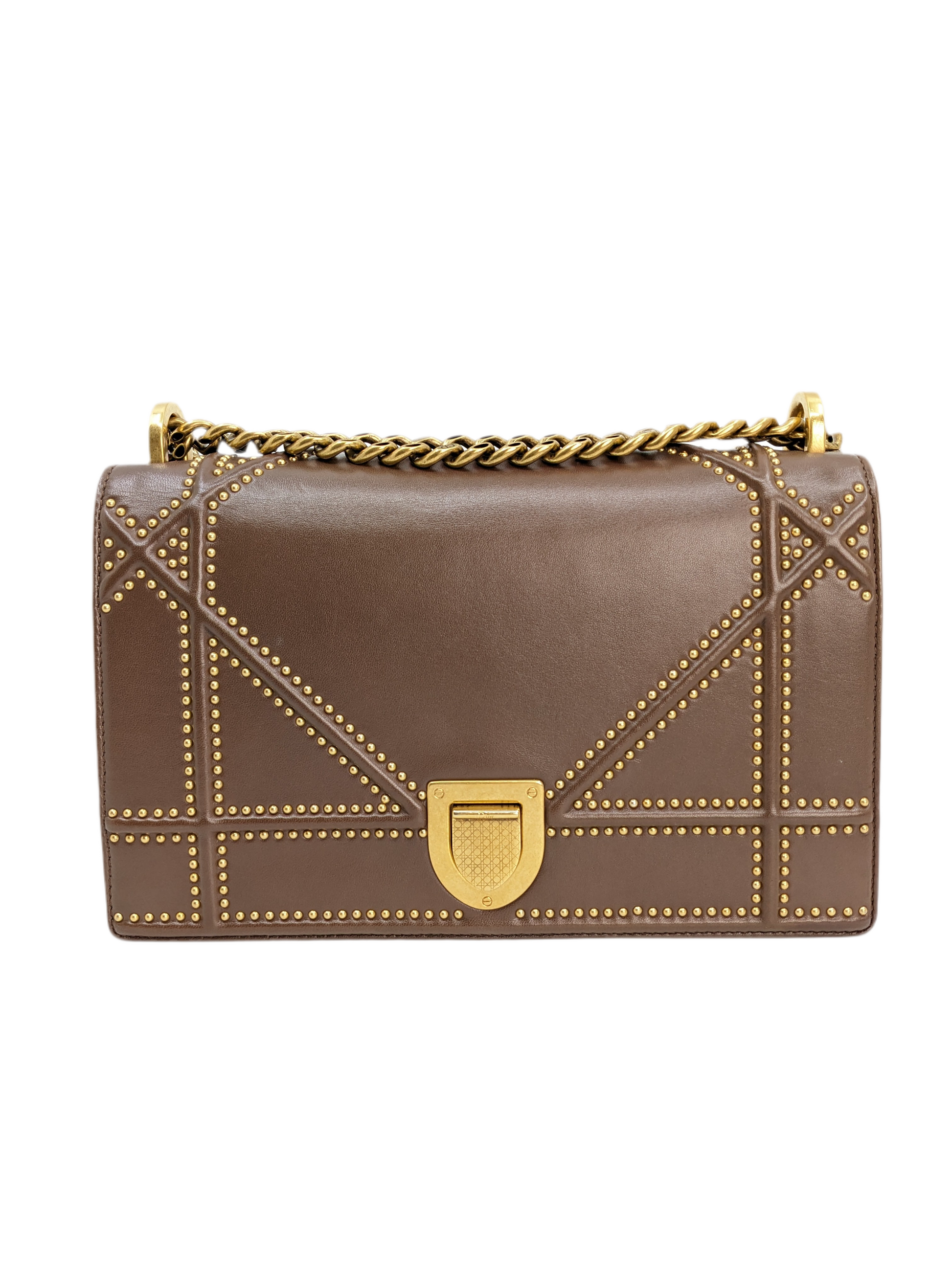 The Christian Dior Medium Diorama Flap Bag in Brown is a sophisticated blend of modern design and timeless elegance. Crafted from luxurious grained calfskin leather in a warm brown hue with gold studs, gold-tone chain strap that can be worn doubled over the shoulder or extended for crossbody wear.