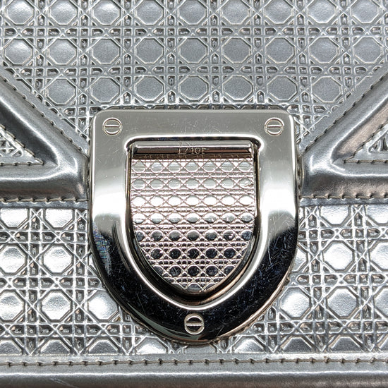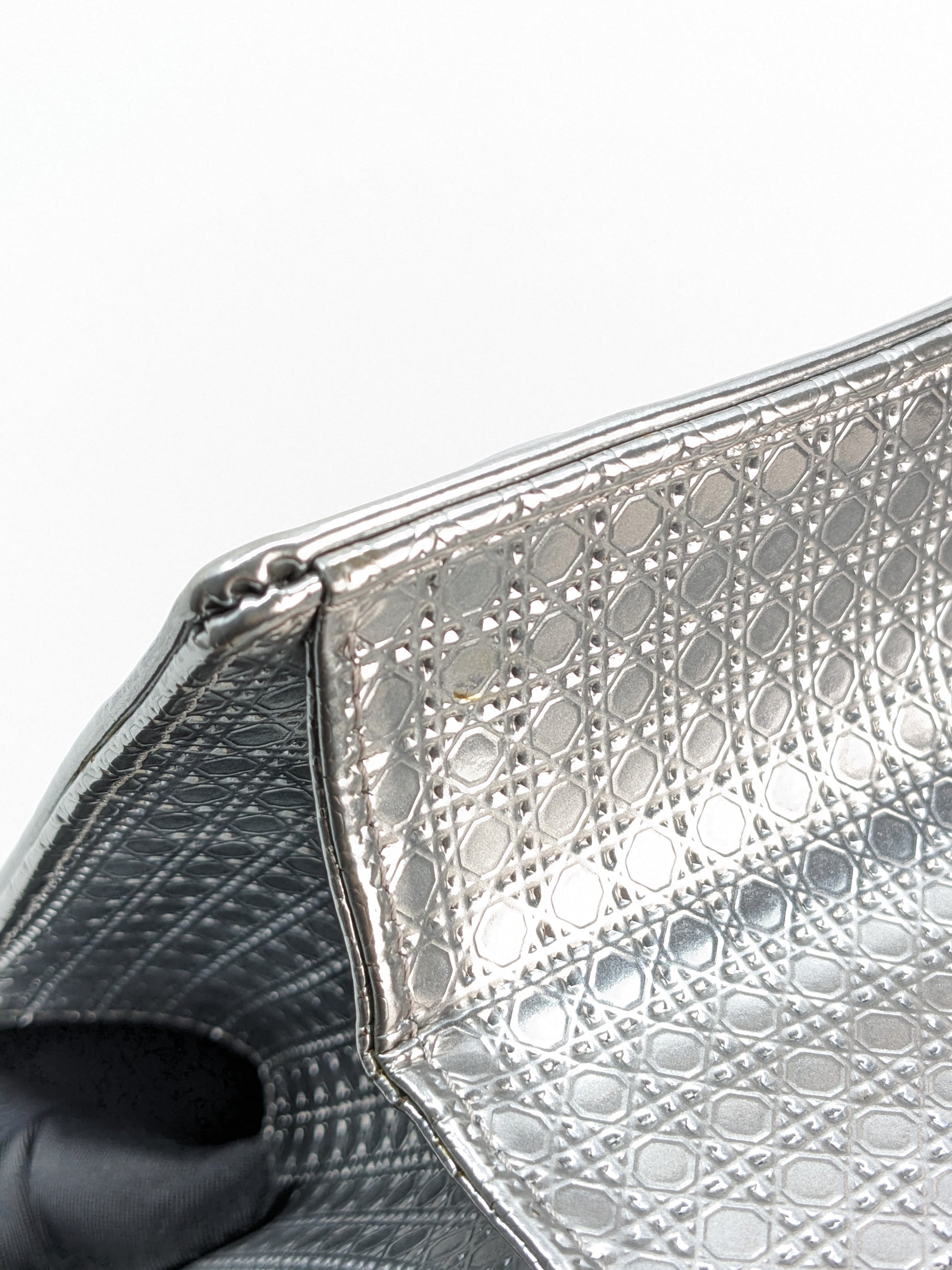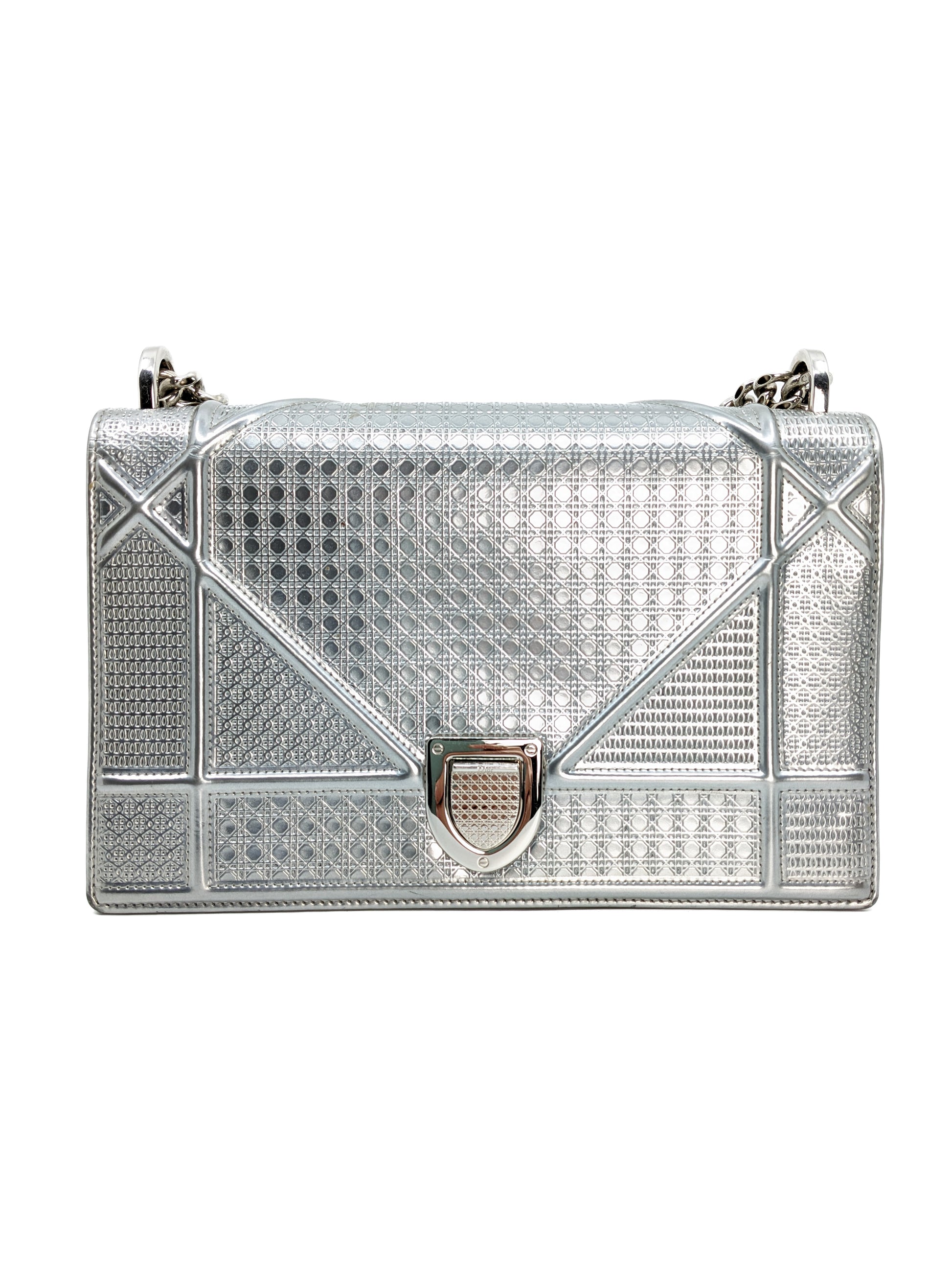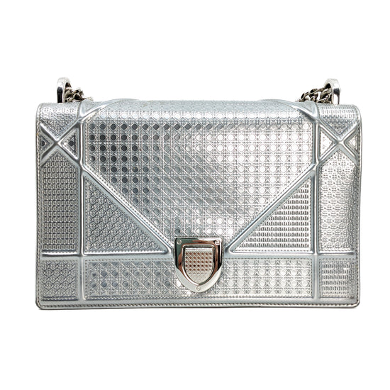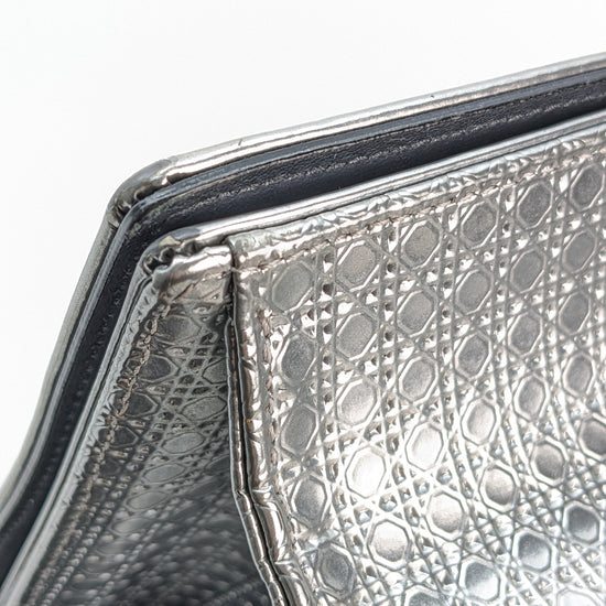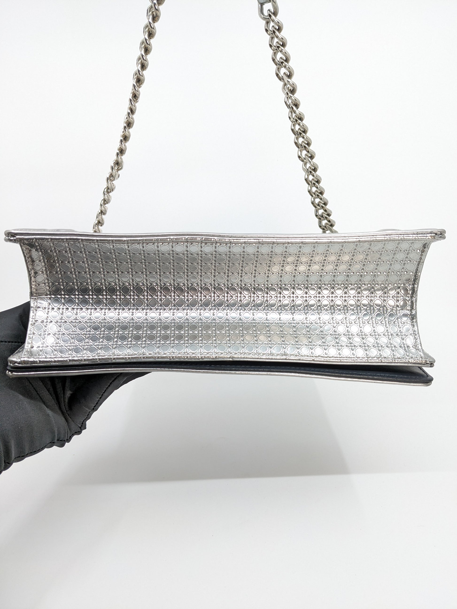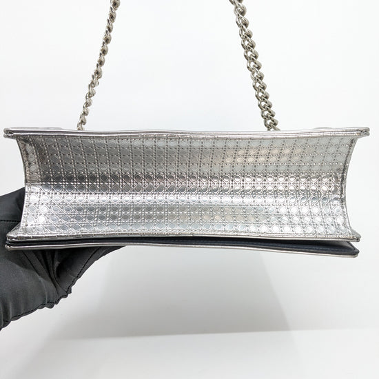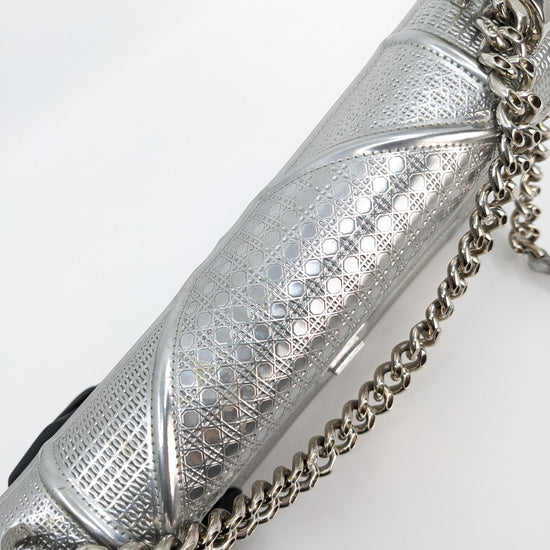 This eye-catching Diorama bag features silver metallic calfskin with a structured cannage motif and sleek silver-tone hardware (SHW).