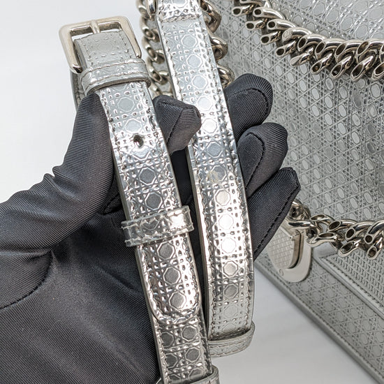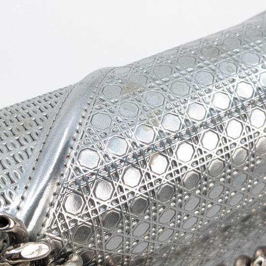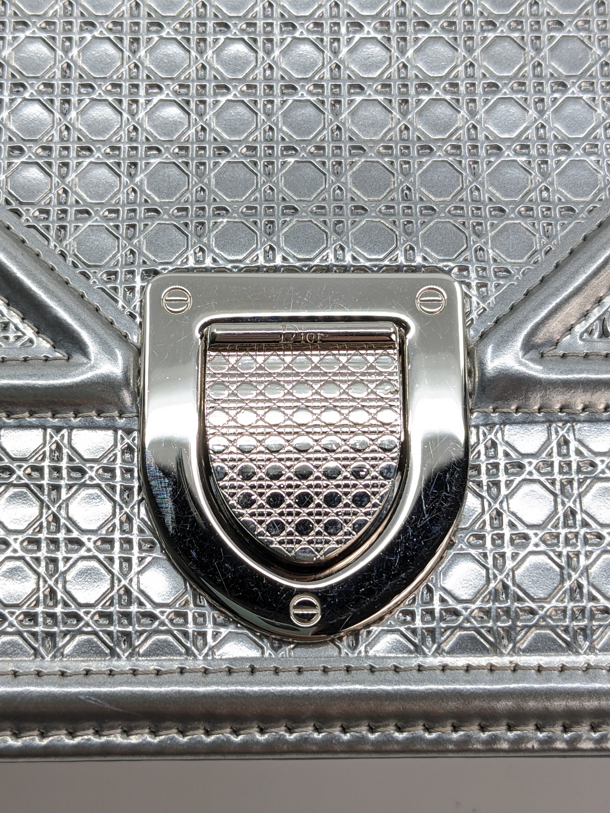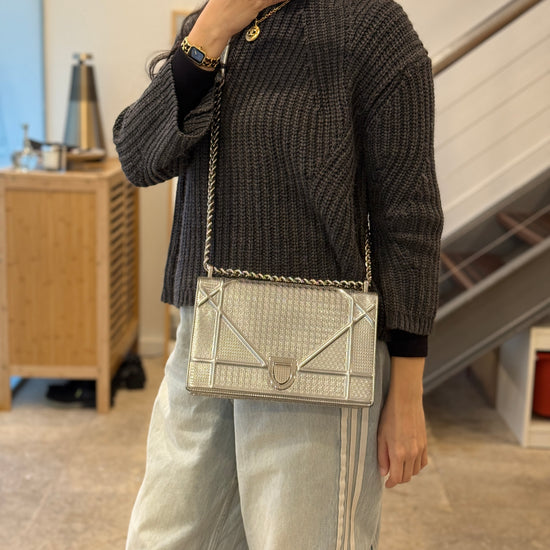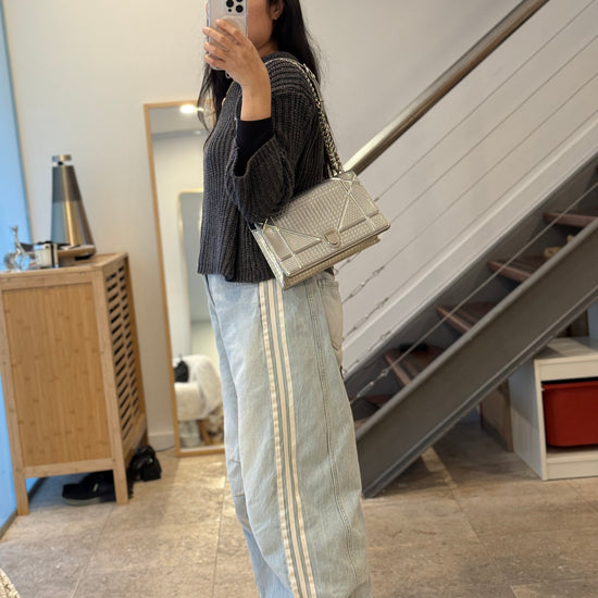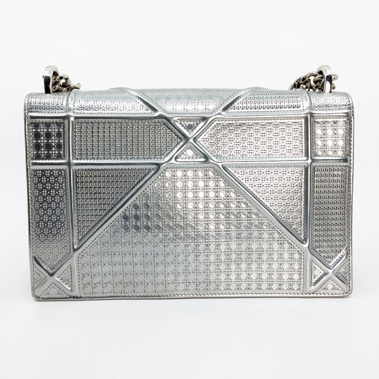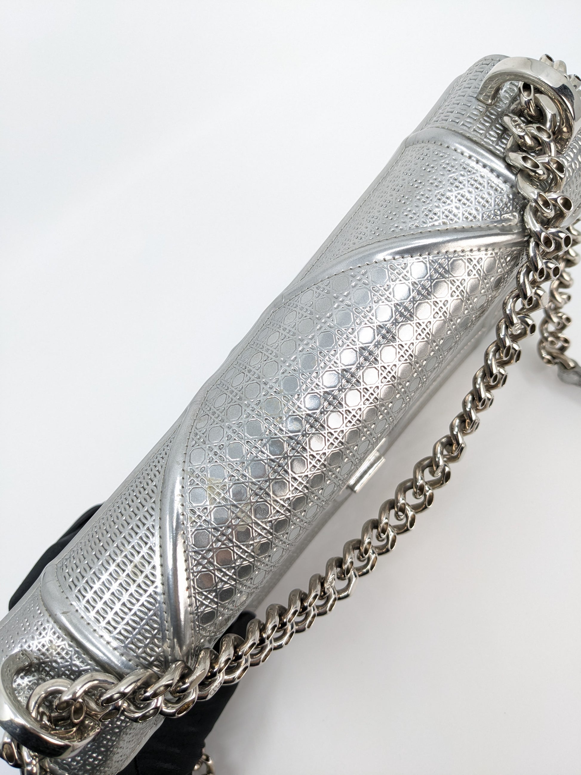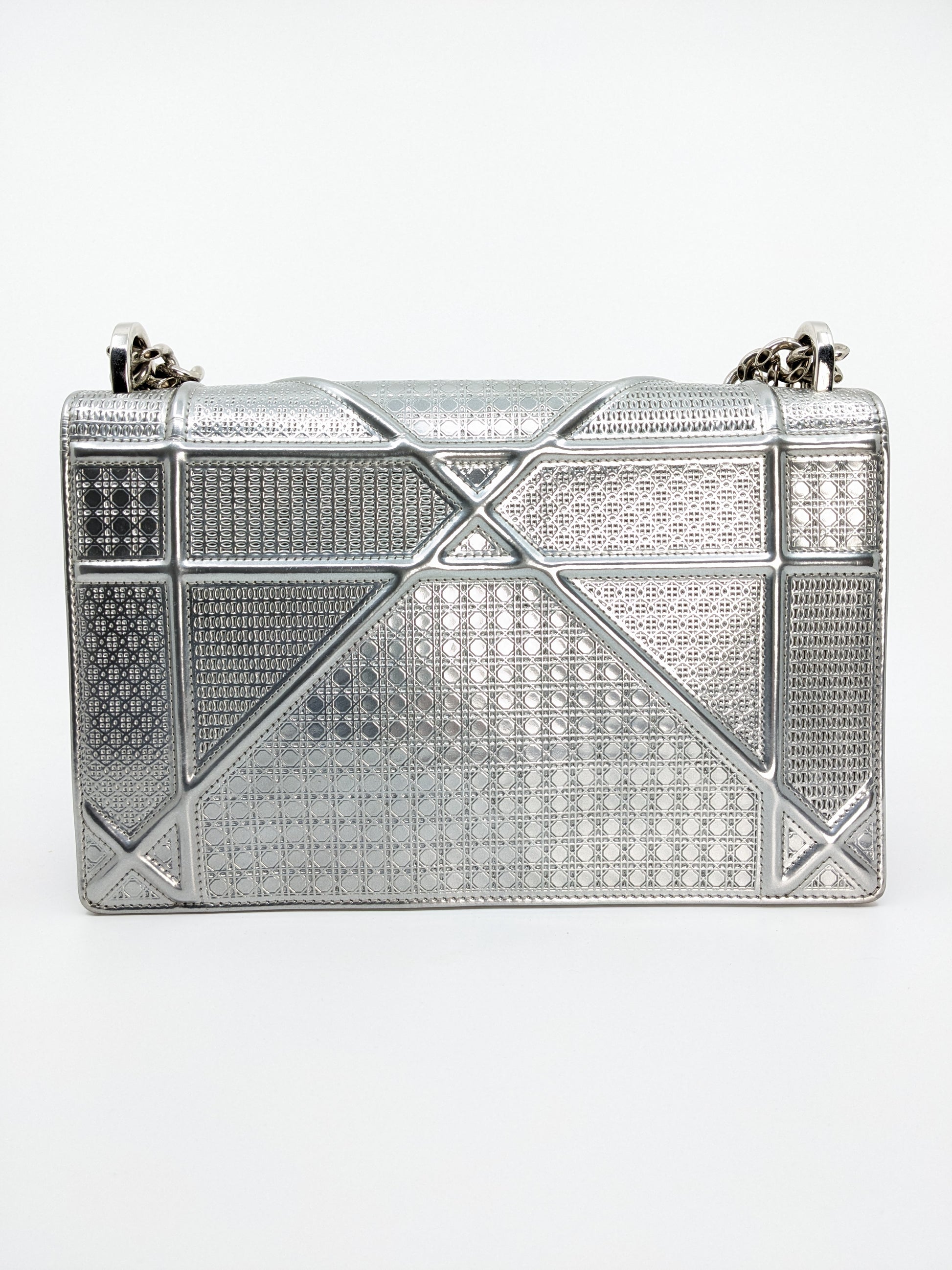 This eye-catching Diorama bag features silver metallic calfskin with a structured cannage motif and sleek silver-tone hardware (SHW).