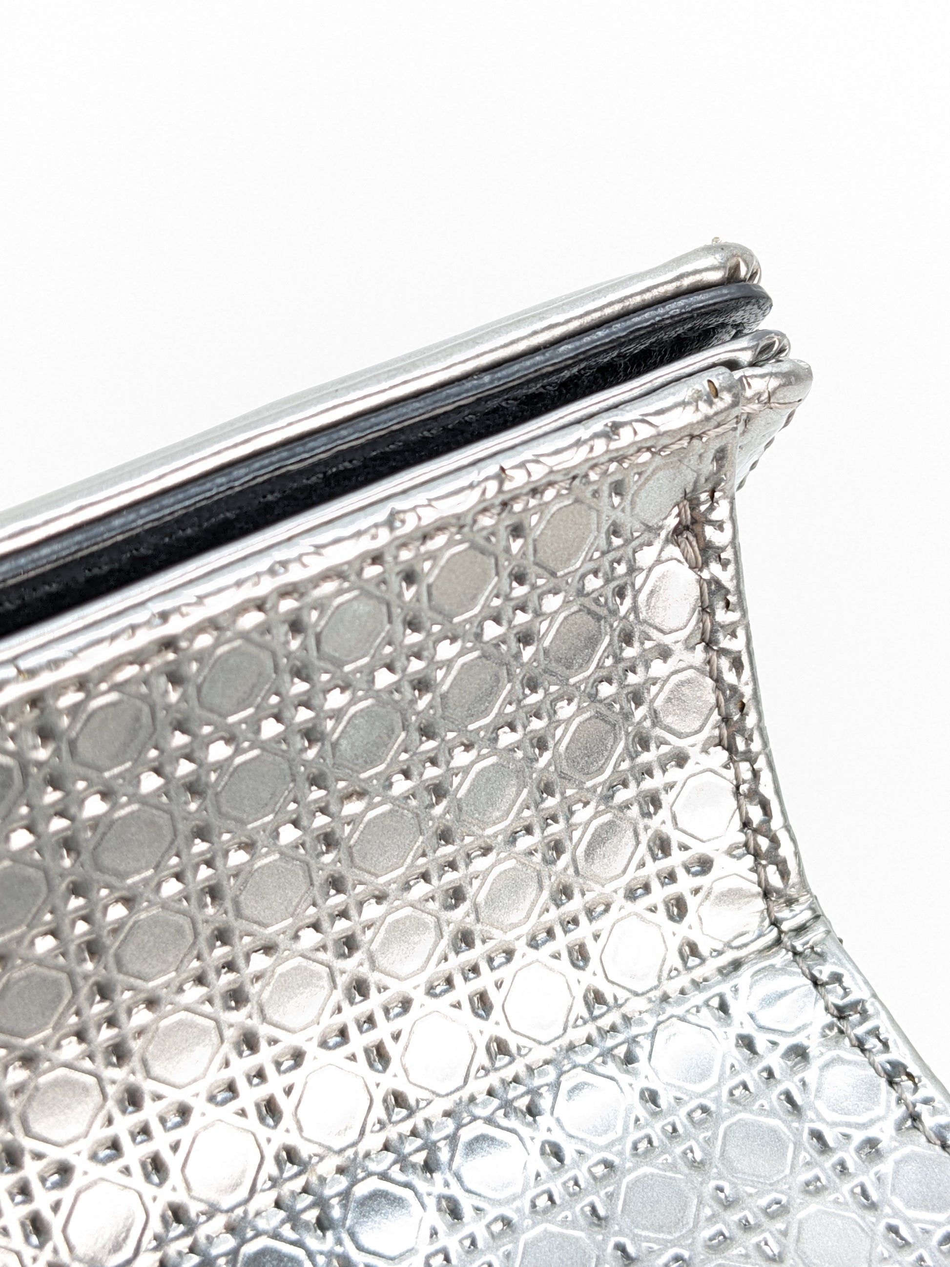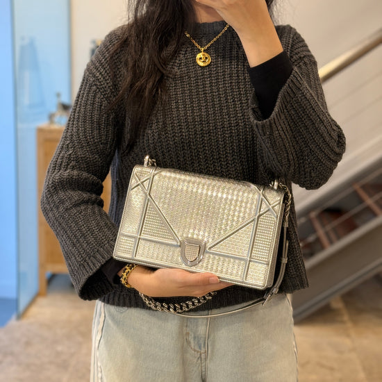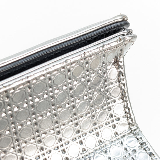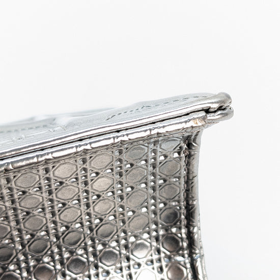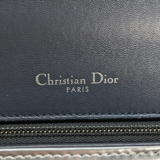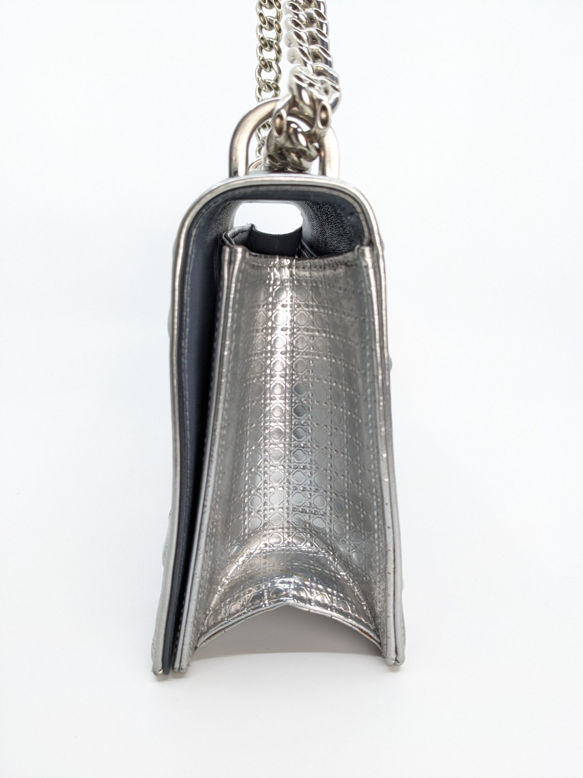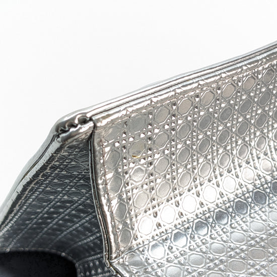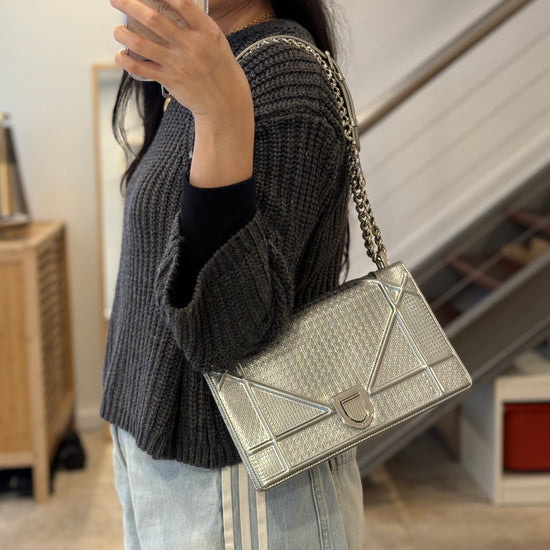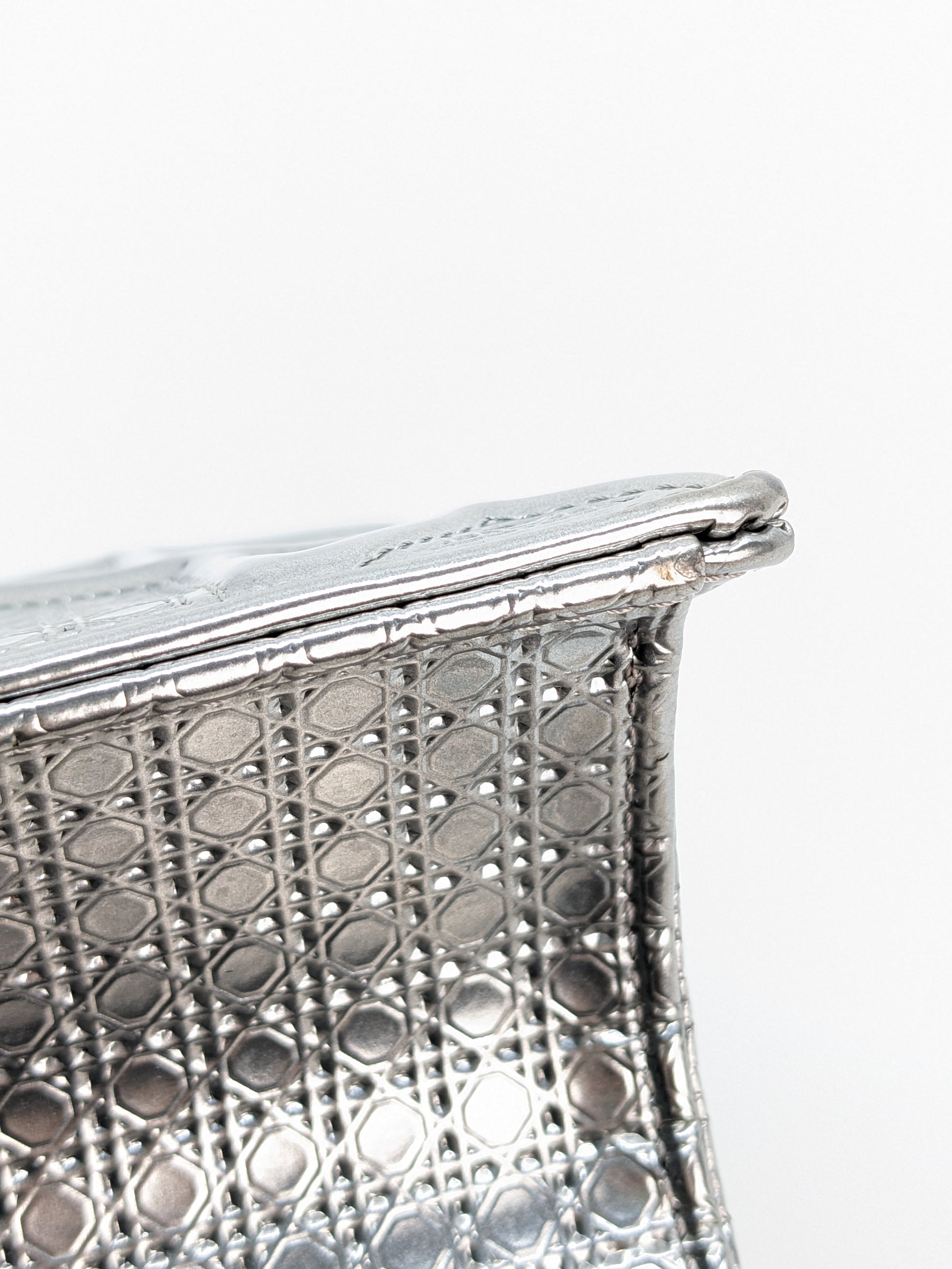 This eye-catching Diorama bag features silver metallic calfskin with a structured cannage motif and sleek silver-tone hardware (SHW).