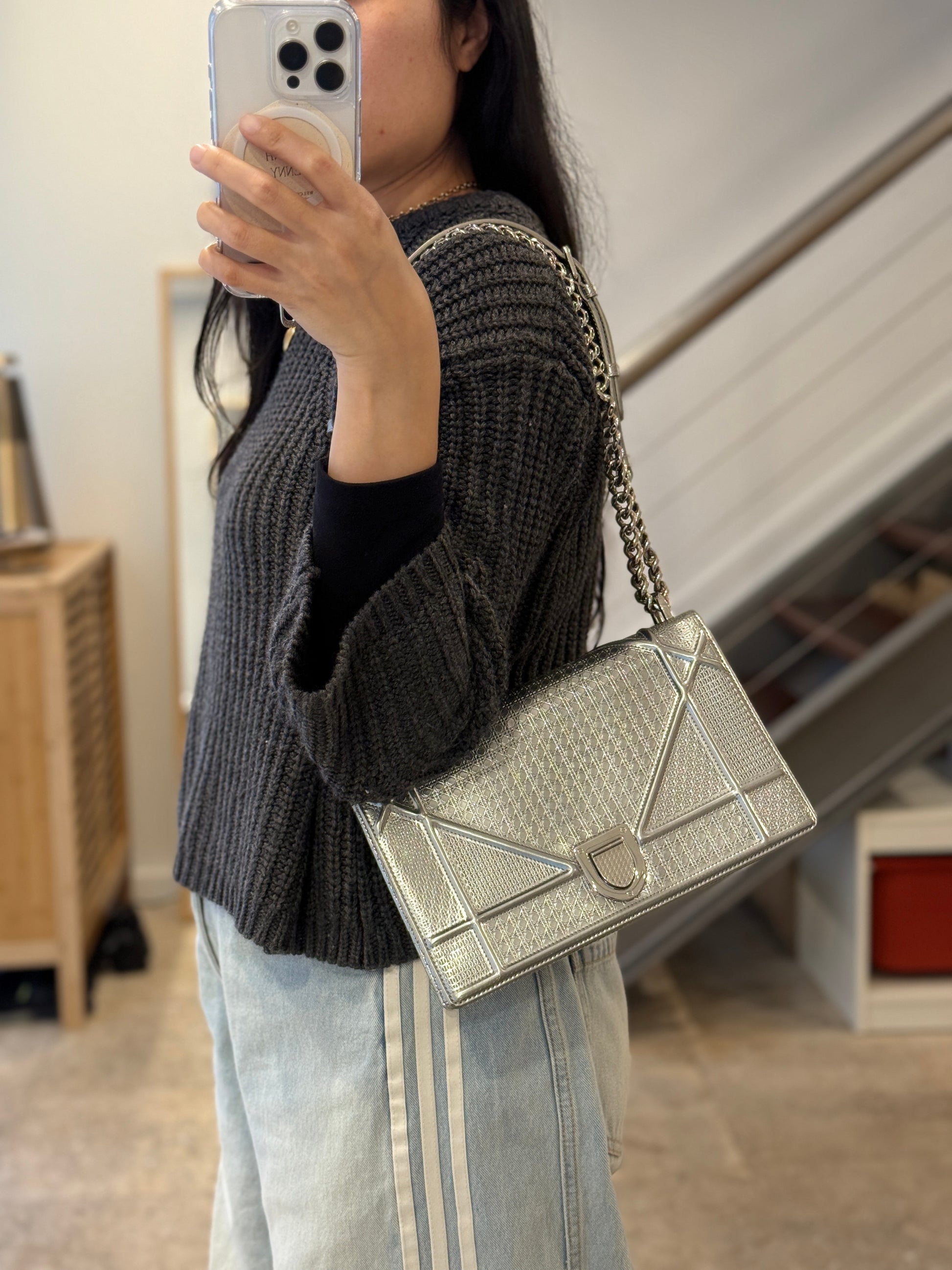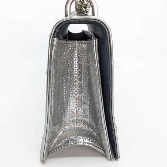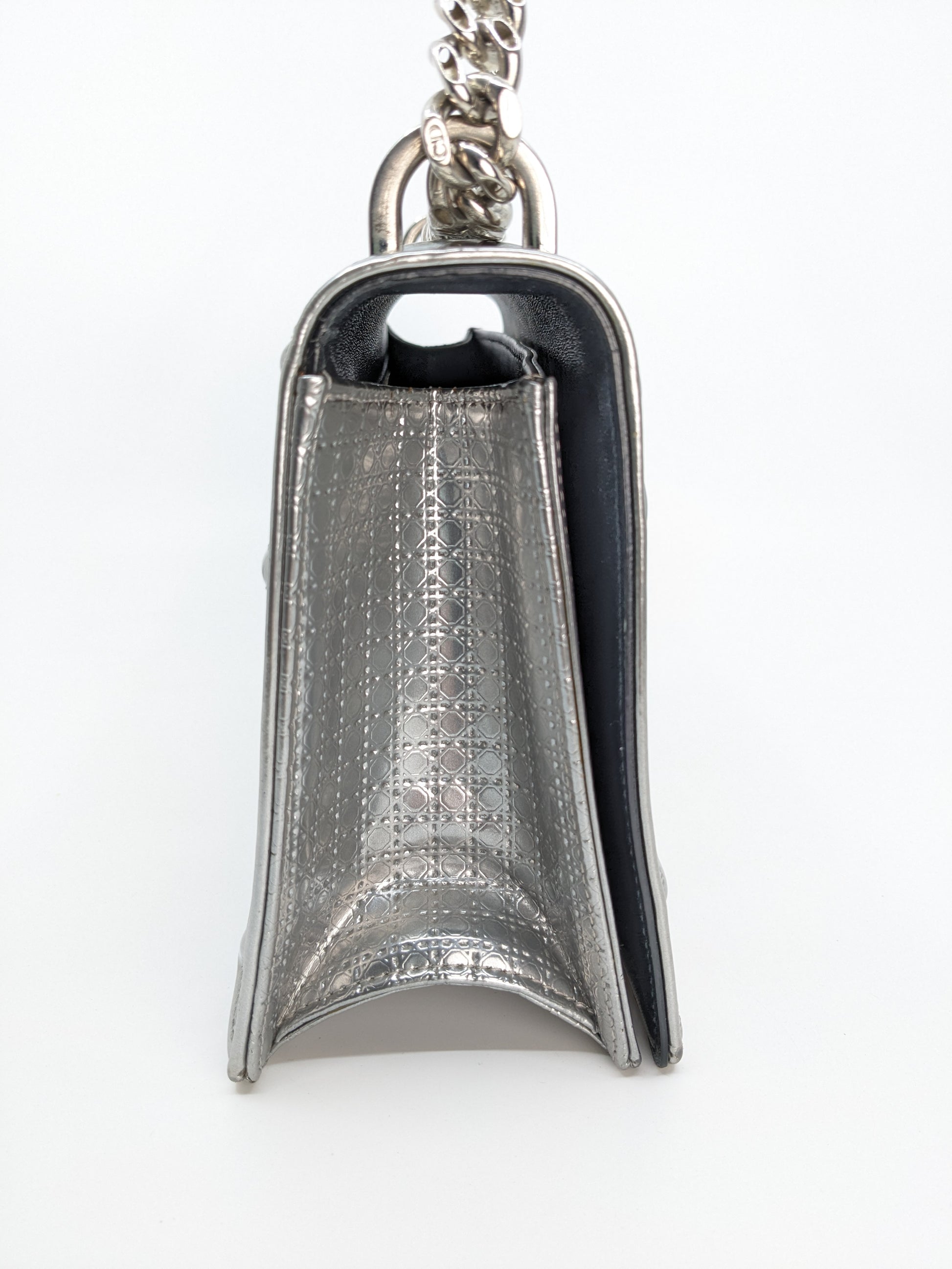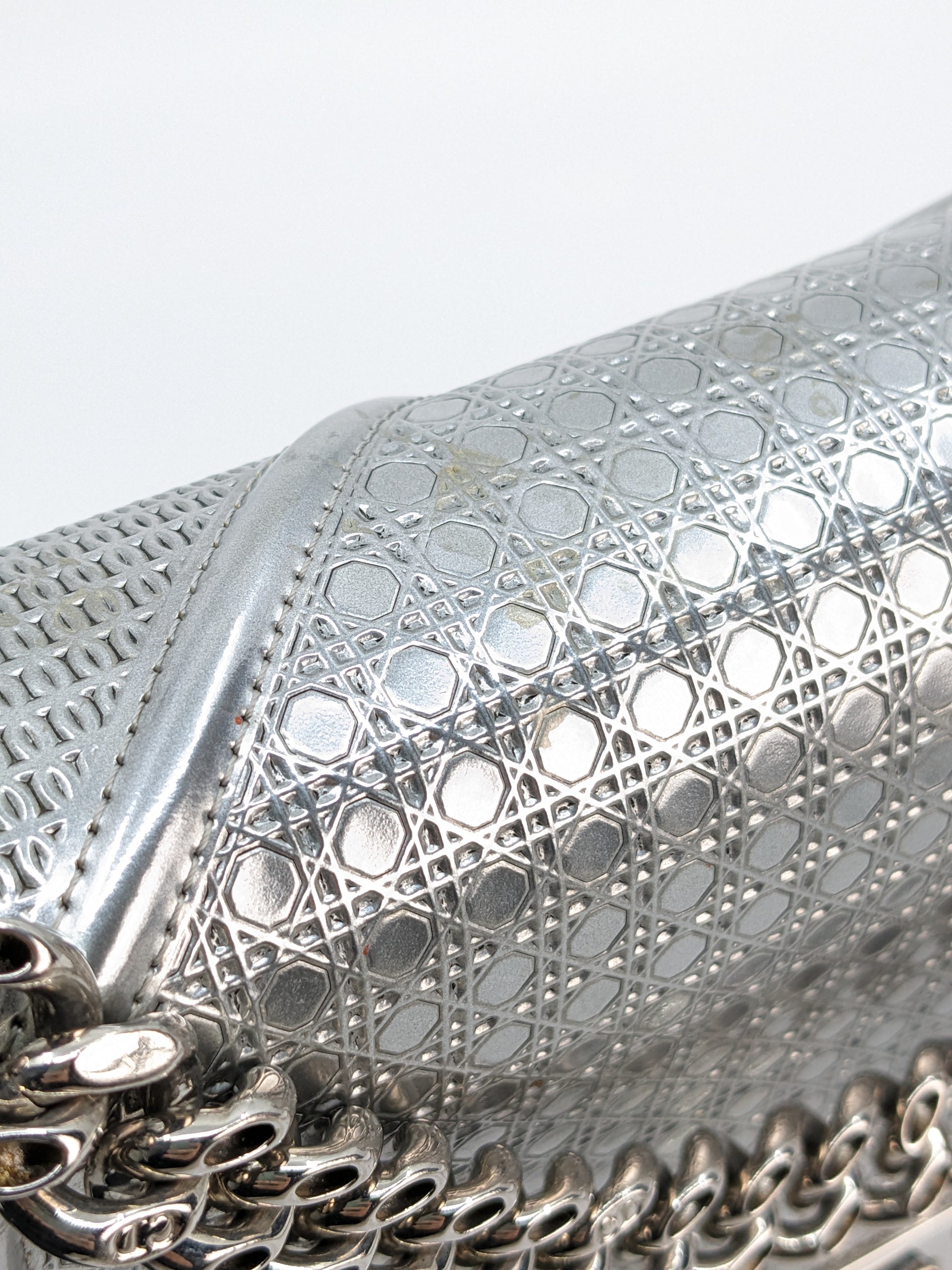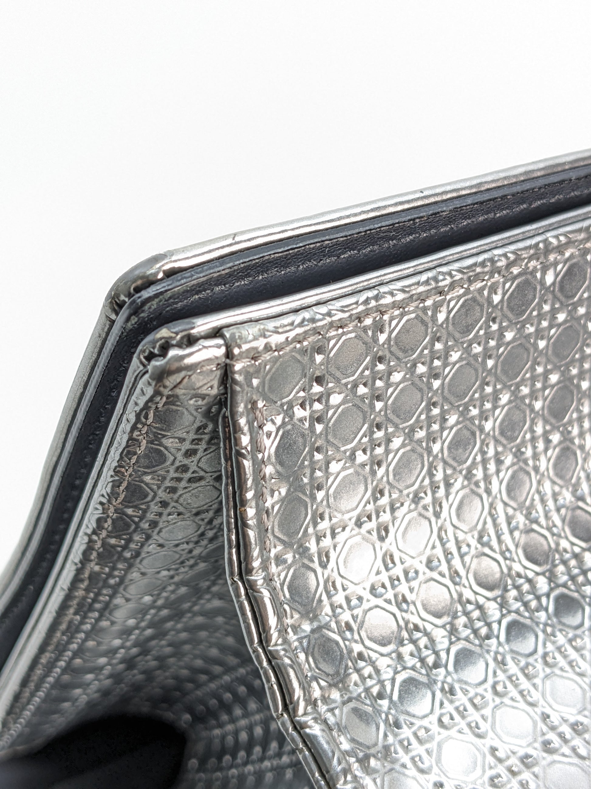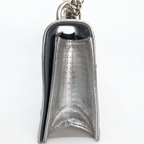 This eye-catching Diorama bag features silver metallic calfskin with a structured cannage motif and sleek silver-tone hardware (SHW).
