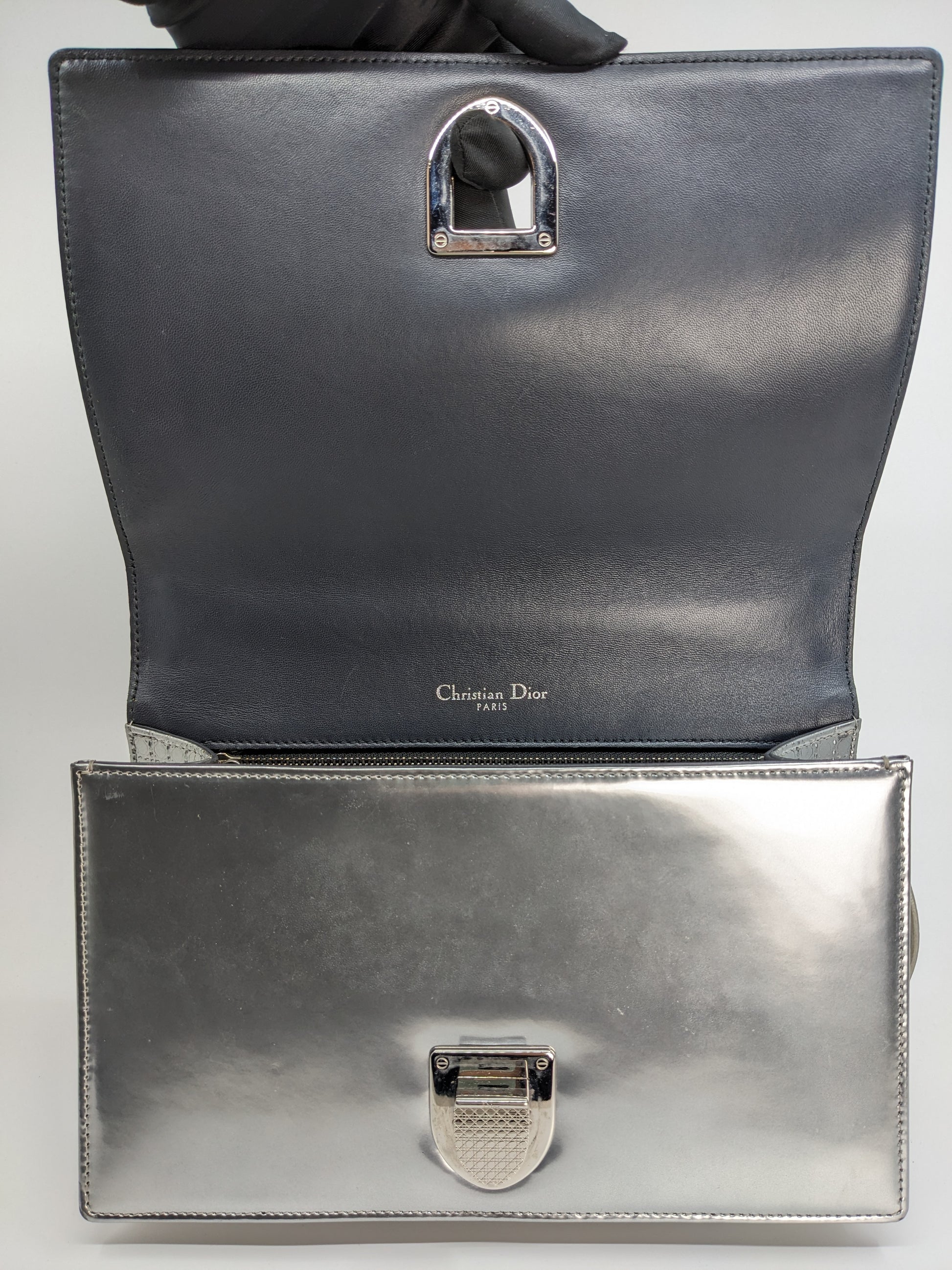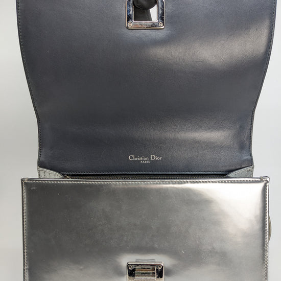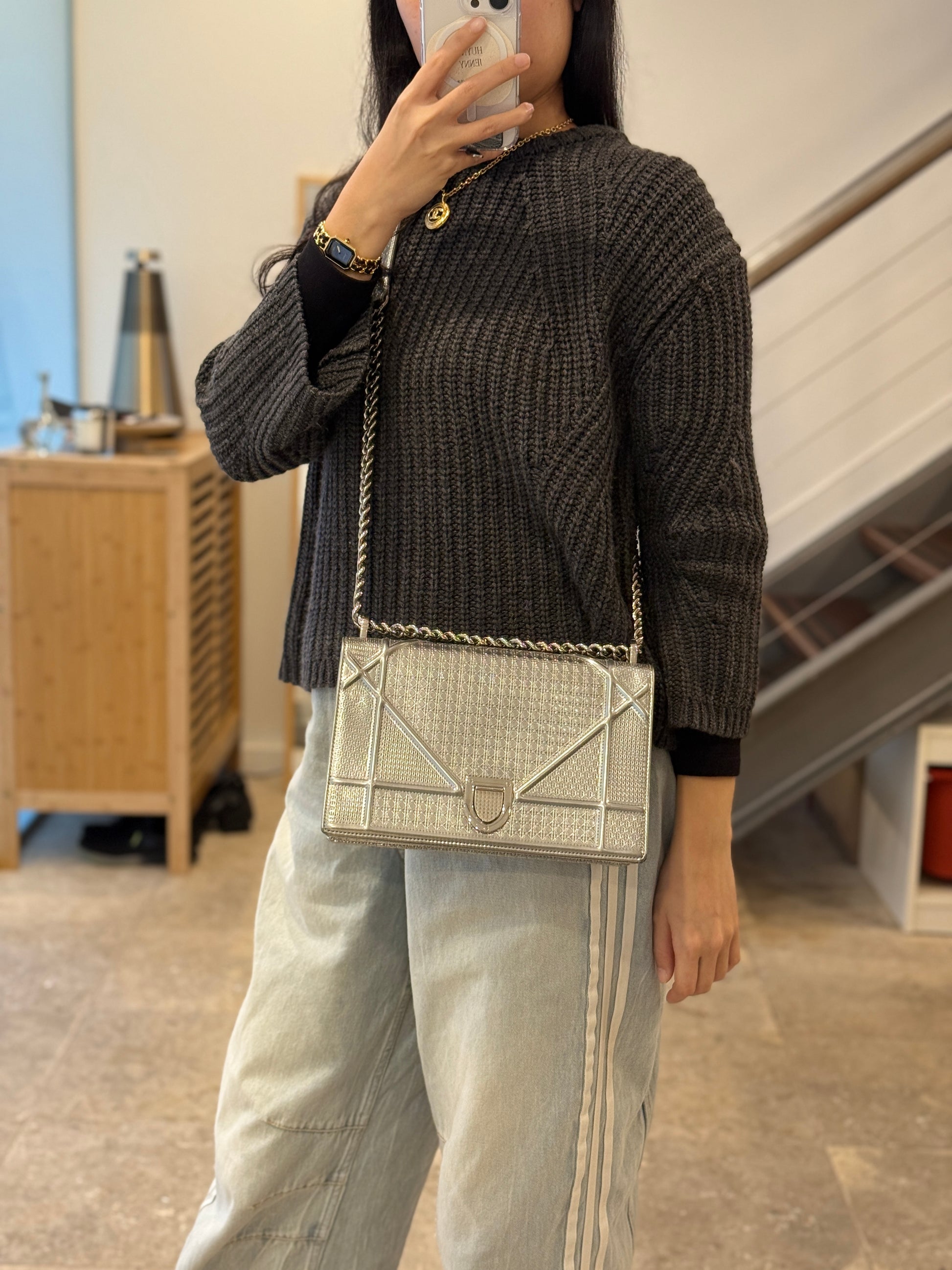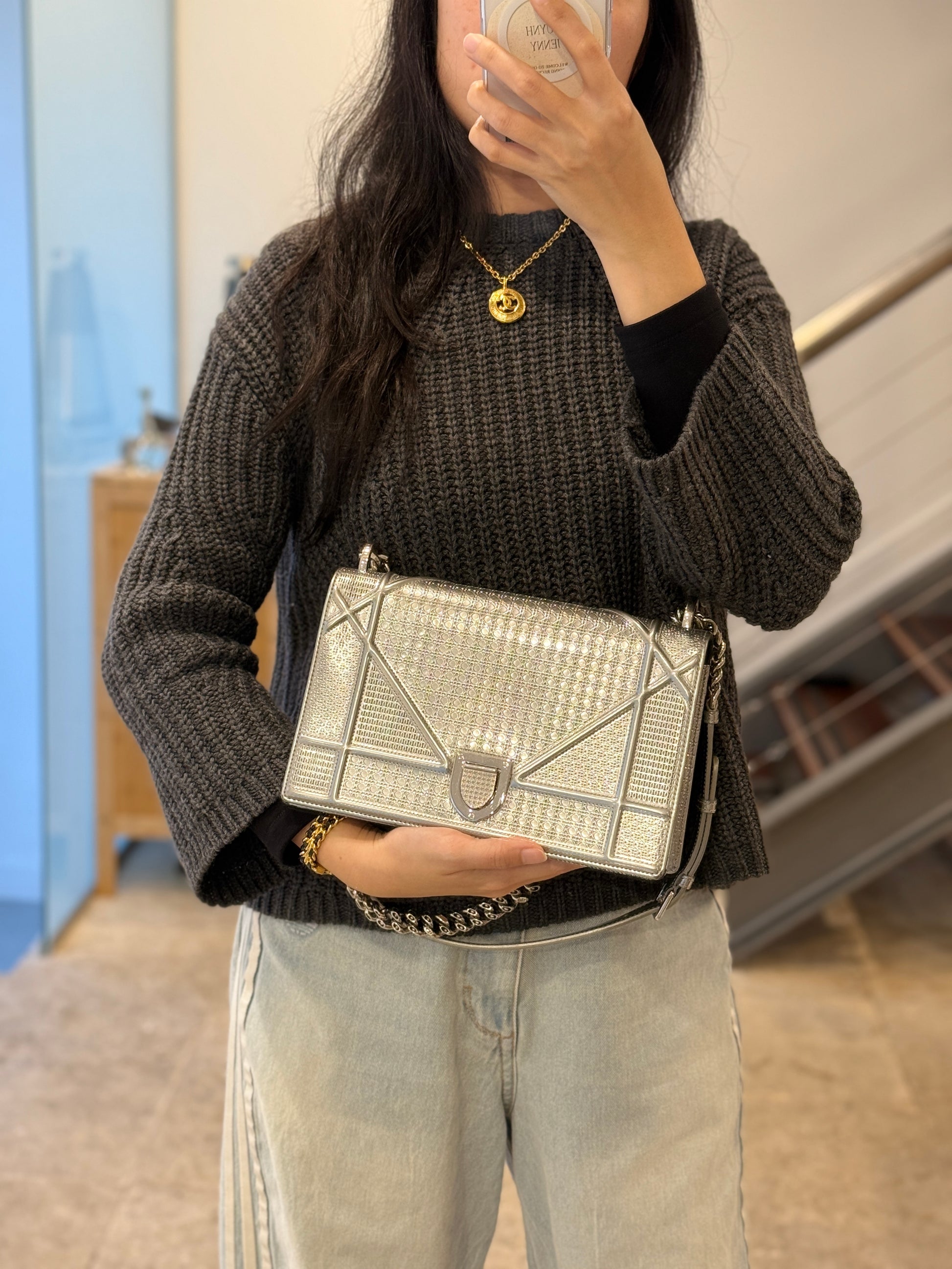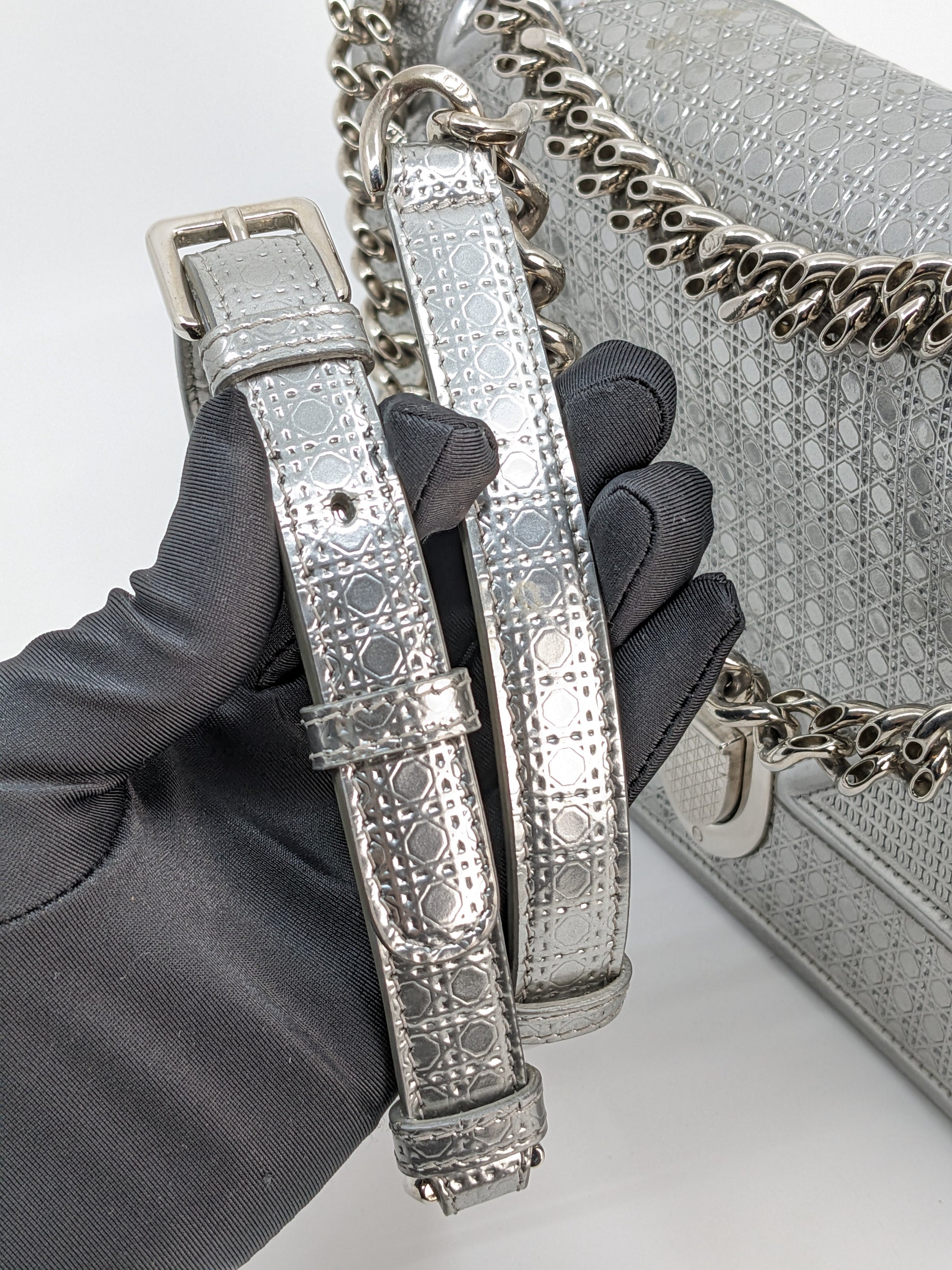 This eye-catching Diorama bag features silver metallic calfskin with a structured cannage motif and sleek silver-tone hardware (SHW).