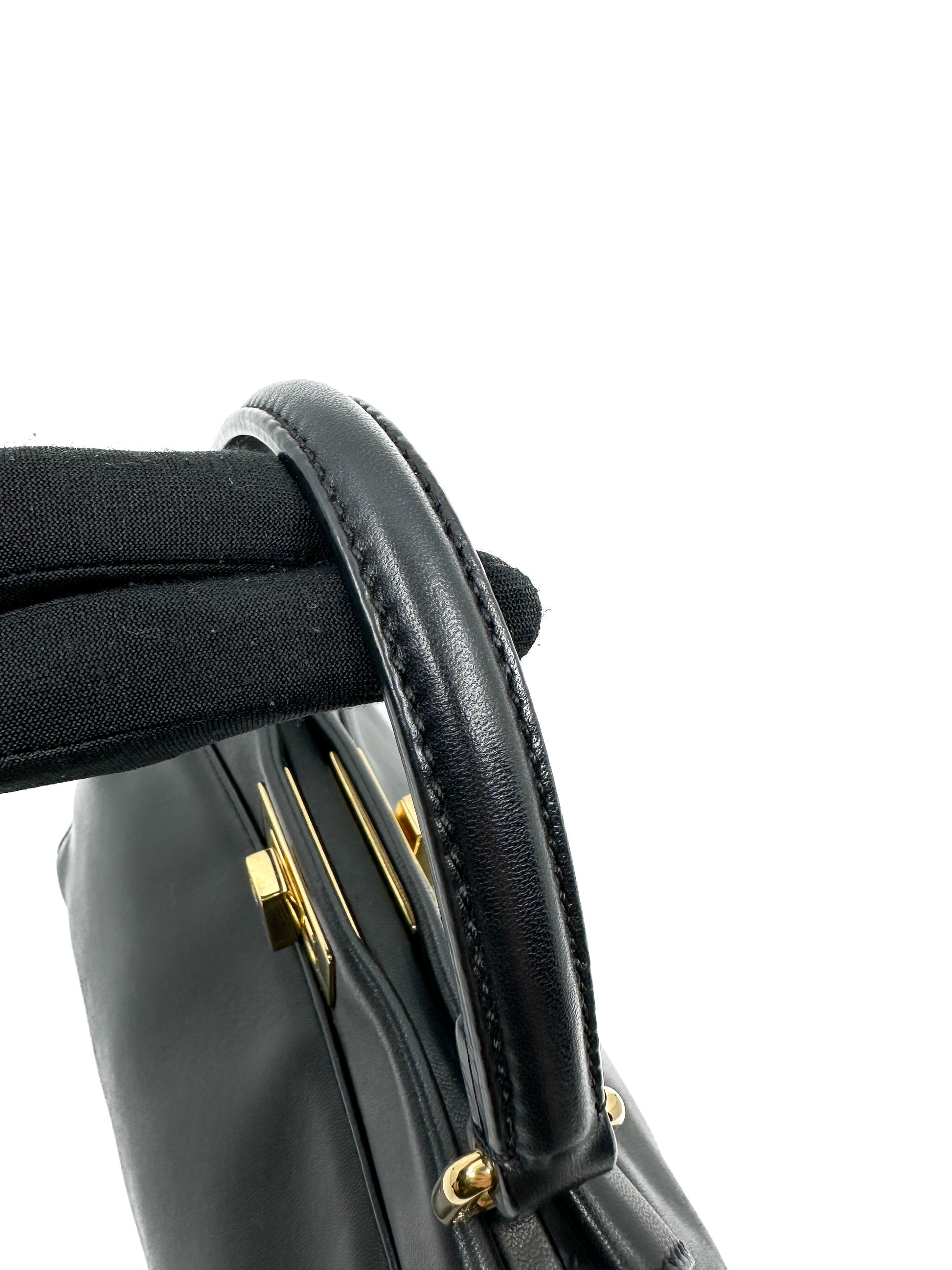 Featuring a tone on tone supple nappa leather lining, tortoiseshell-look plexiglass bar, two internal compartments separated by a stiff partition, an inner pocket with zip and gold-finish metalware.