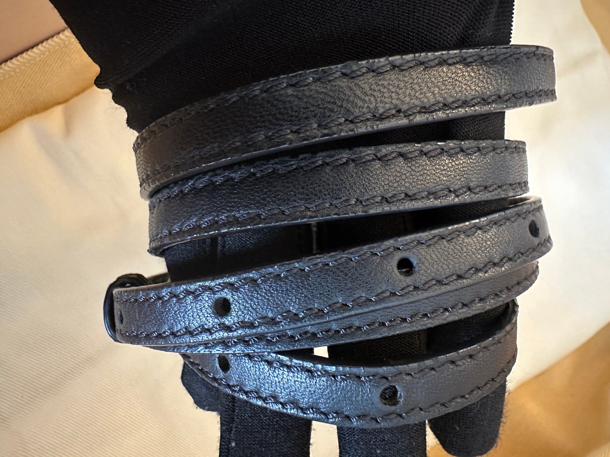 Condition: very good. Hairline scratches on hardware. Creased by storage.