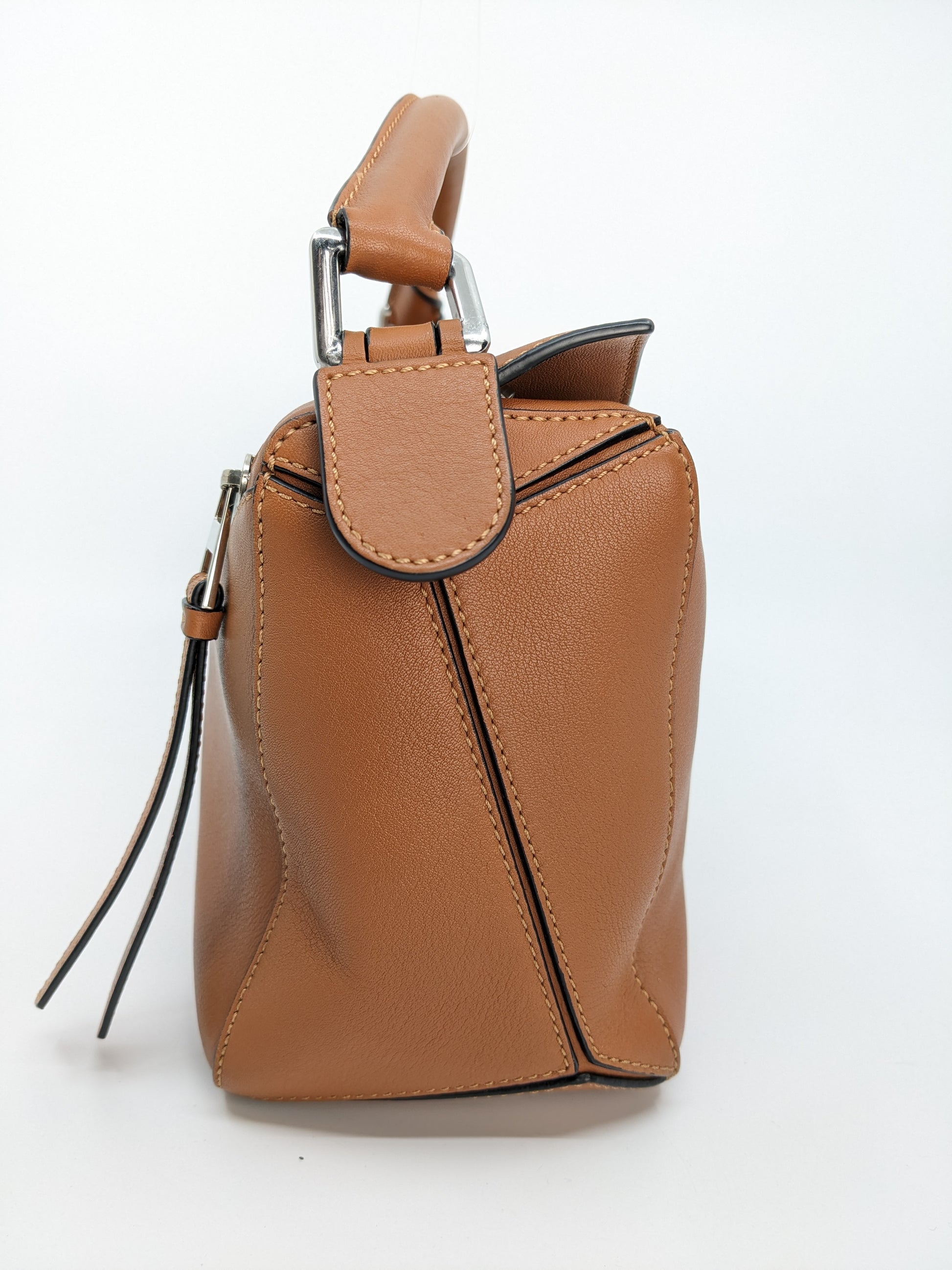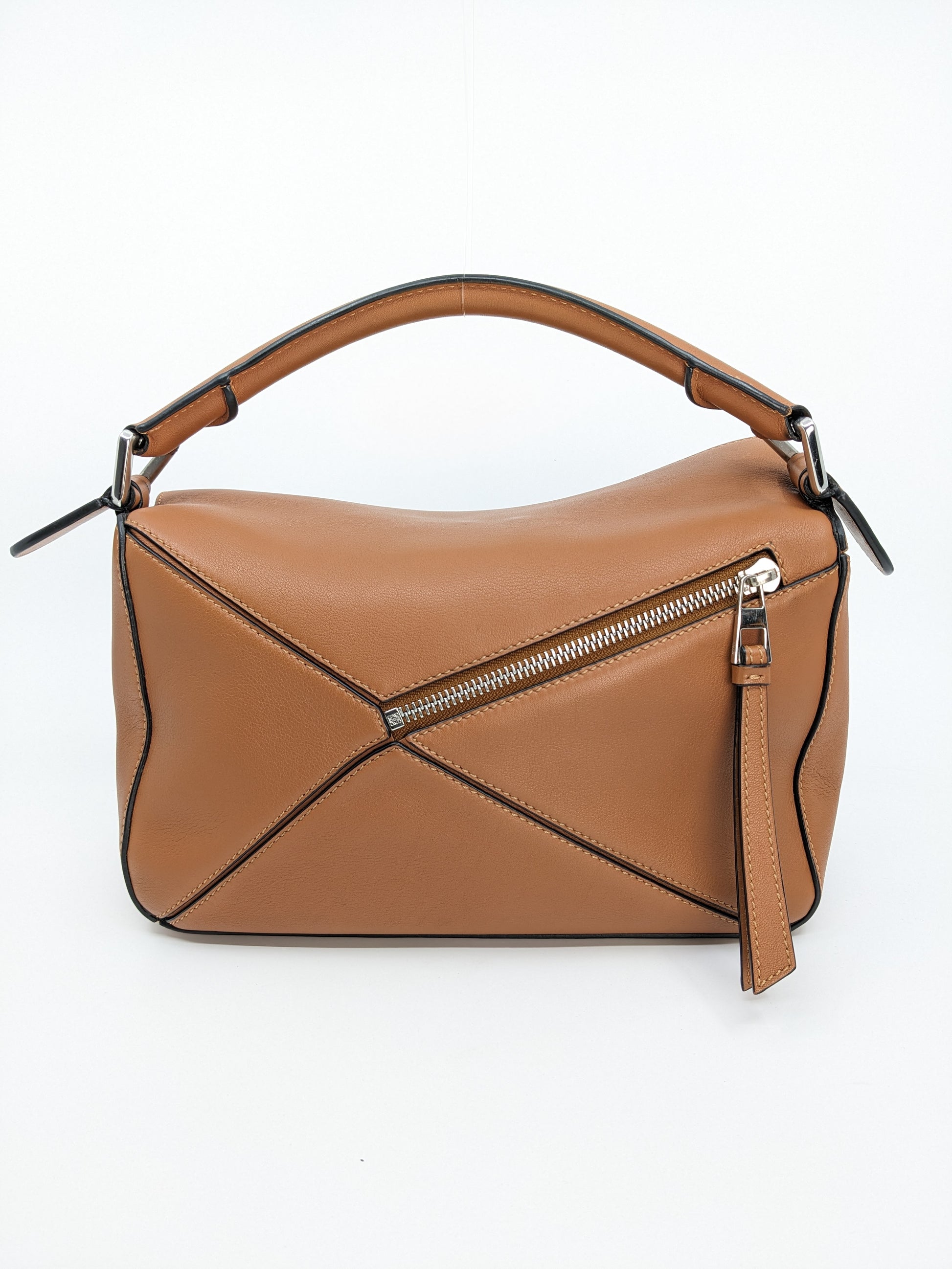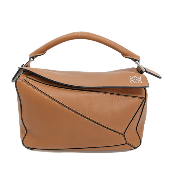The Loewe Puzzle Bag in Tan (Small) is a modern icon designed by Jonathan Anderson, first introduced in 2015.