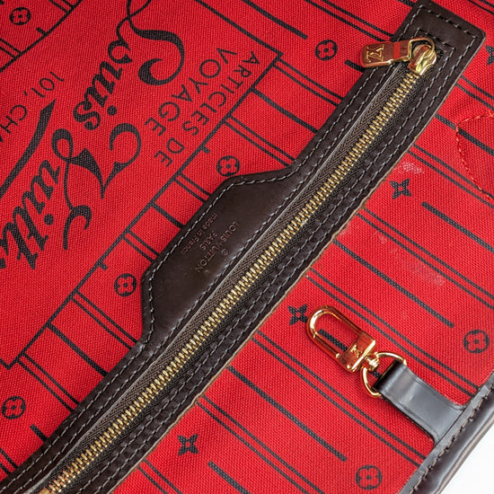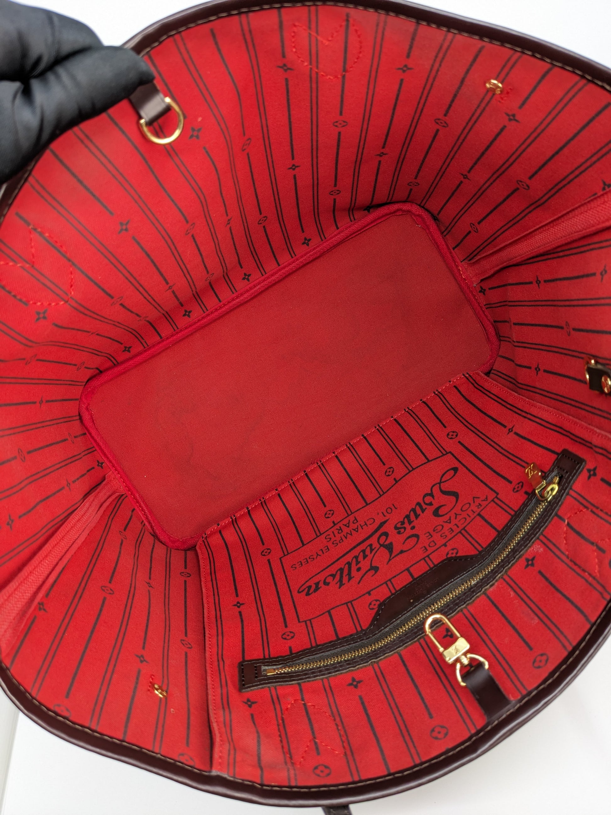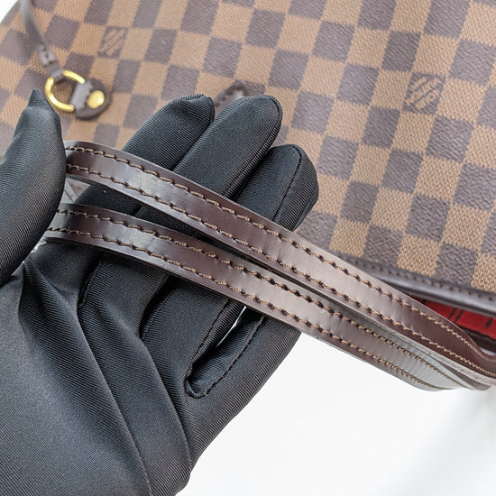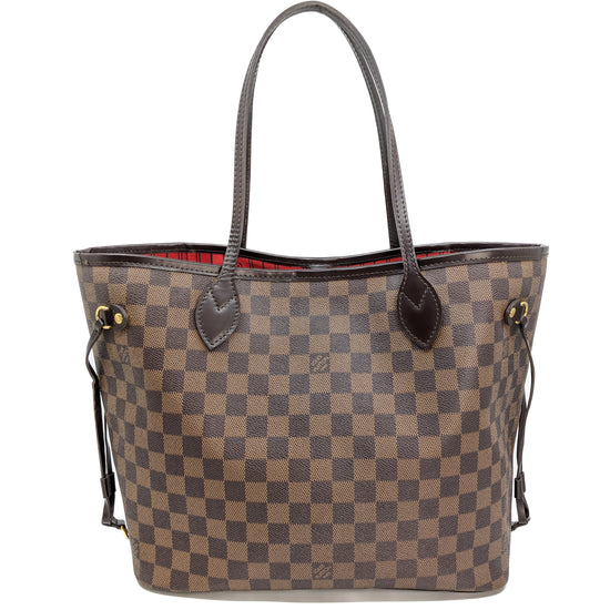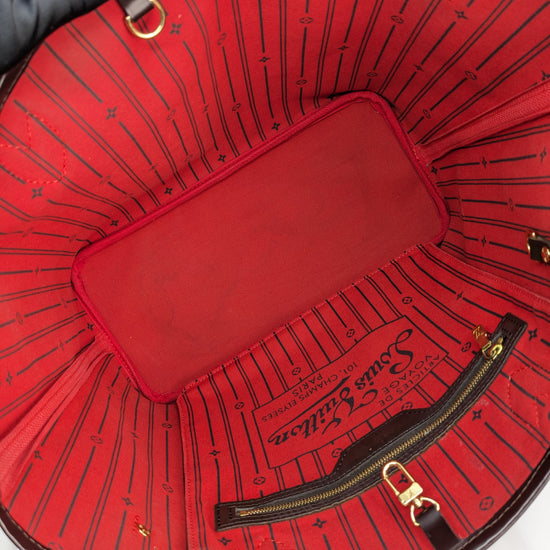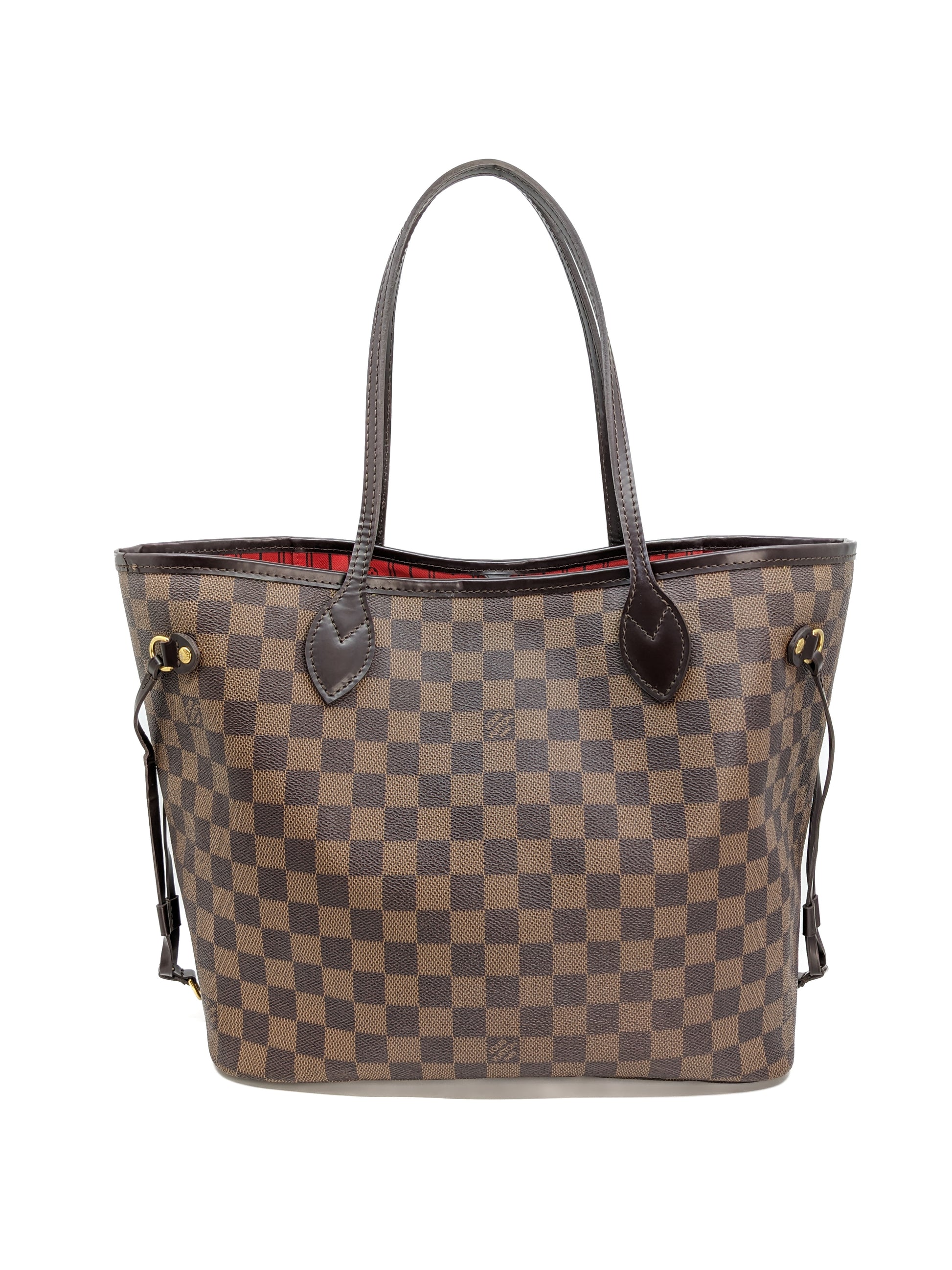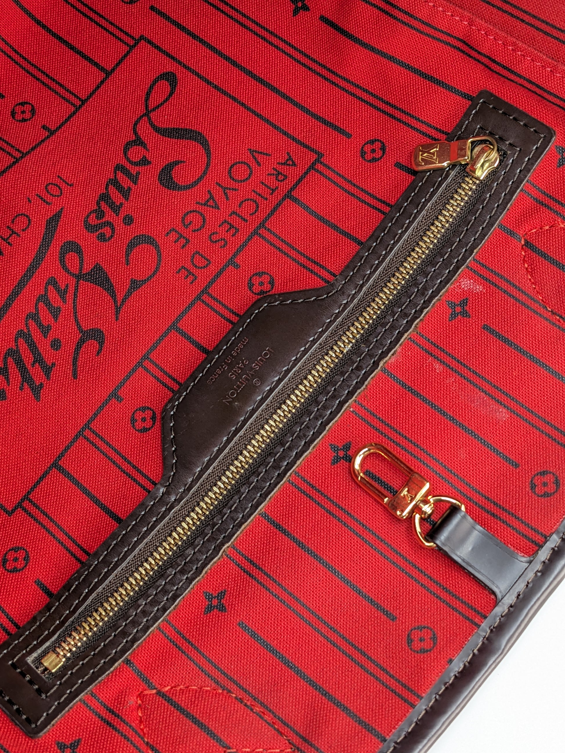 The Louis Vuitton Neverfull MM in Damier Ebene canvas with red lining is a timeless and versatile tote that combines elegance with practicality. Crafted from durable coated canvas with chocolate brown leather trim, it features slim, comfortable shoulder straps and gold-tone hardware.