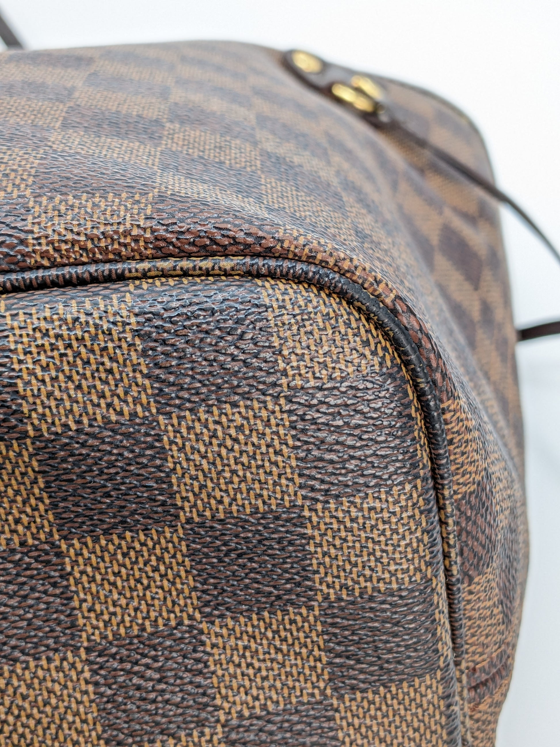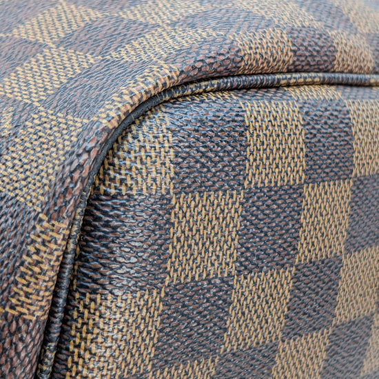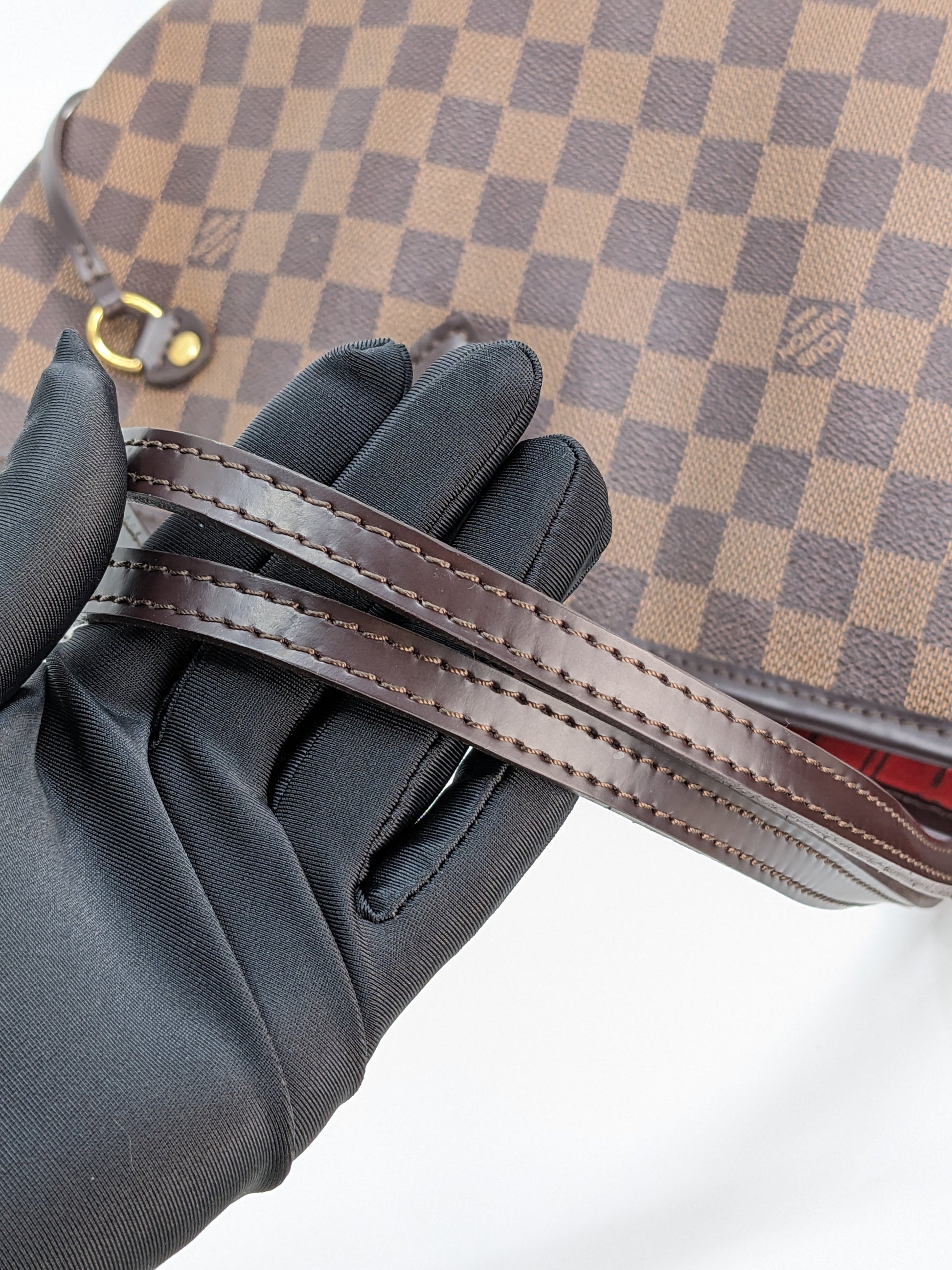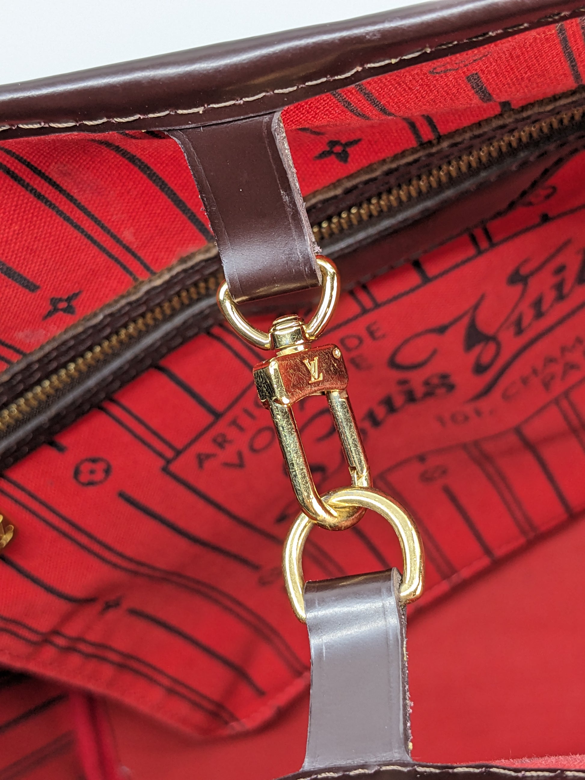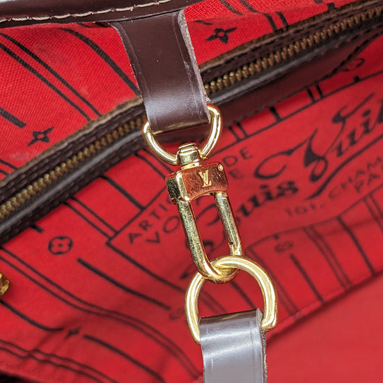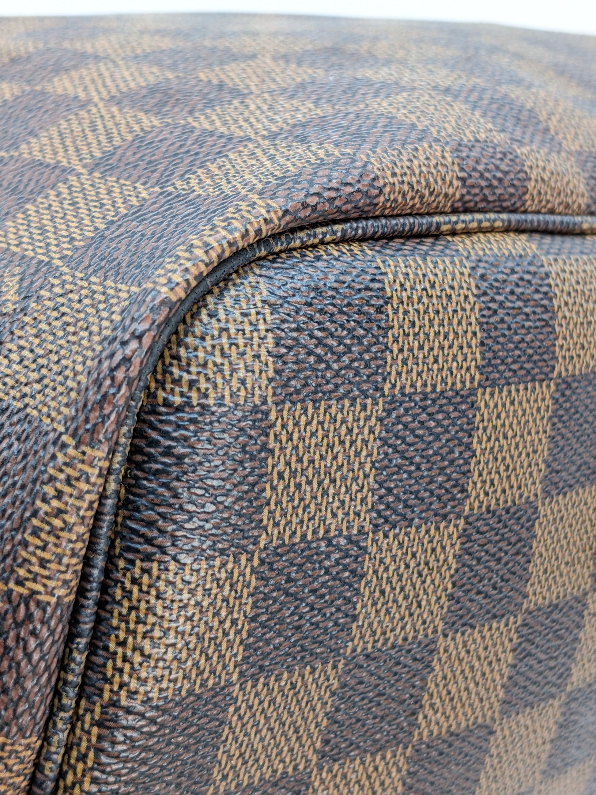 The Louis Vuitton Neverfull MM in Damier Ebene canvas with red lining is a timeless and versatile tote that combines elegance with practicality. Crafted from durable coated canvas with chocolate brown leather trim, it features slim, comfortable shoulder straps and gold-tone hardware.