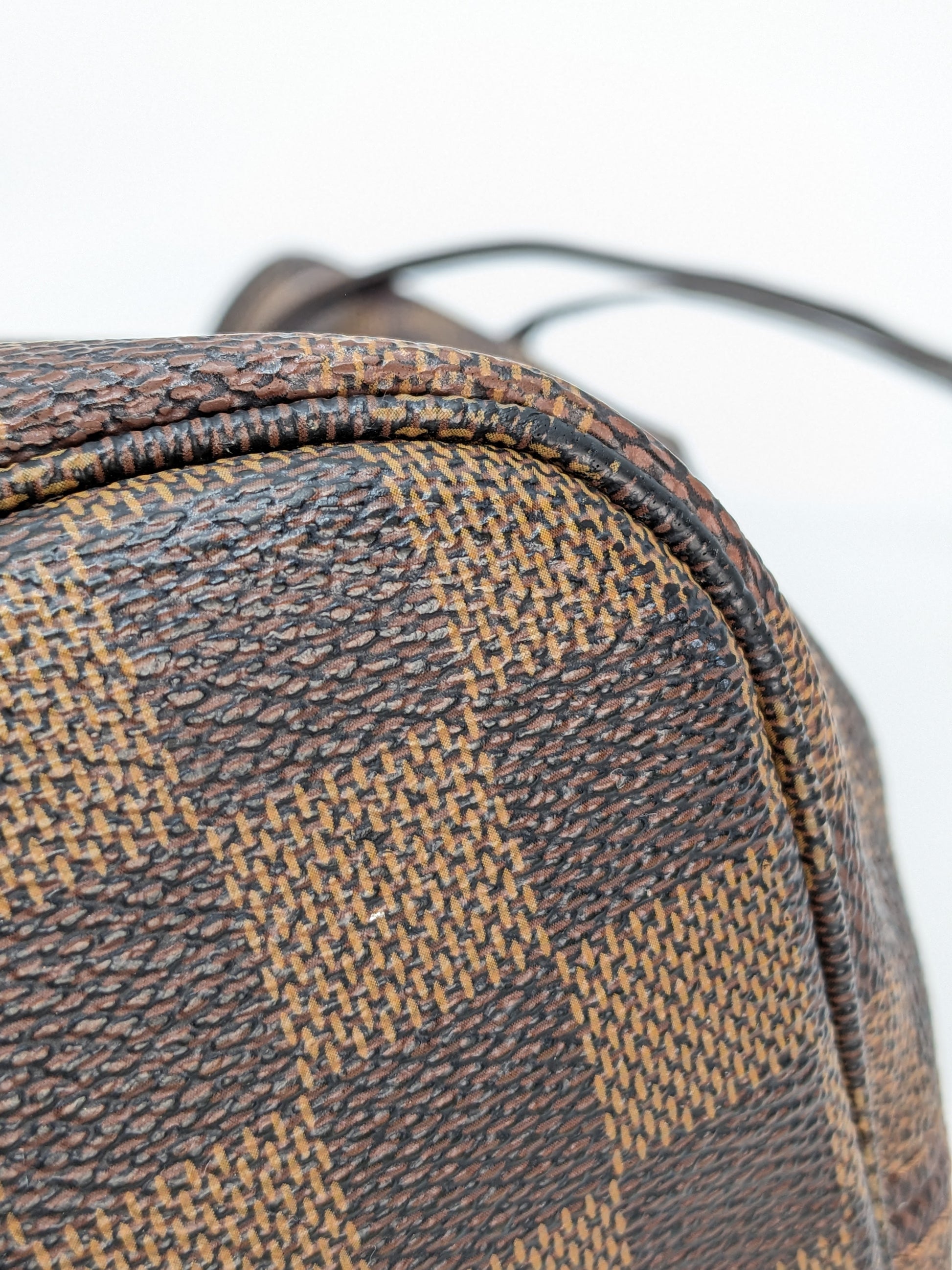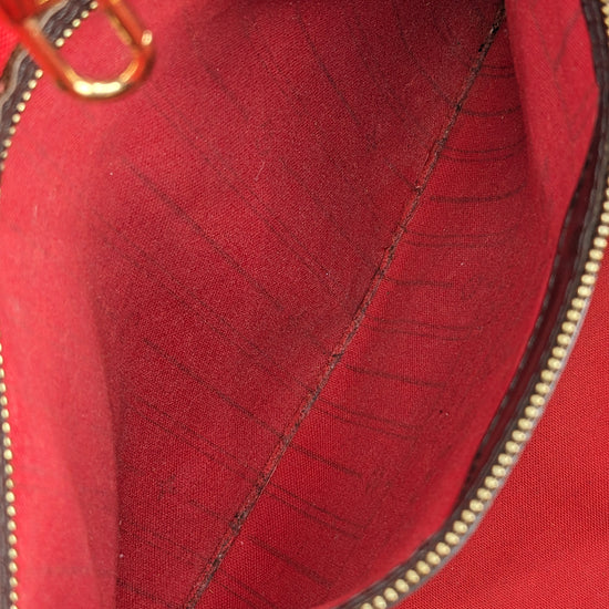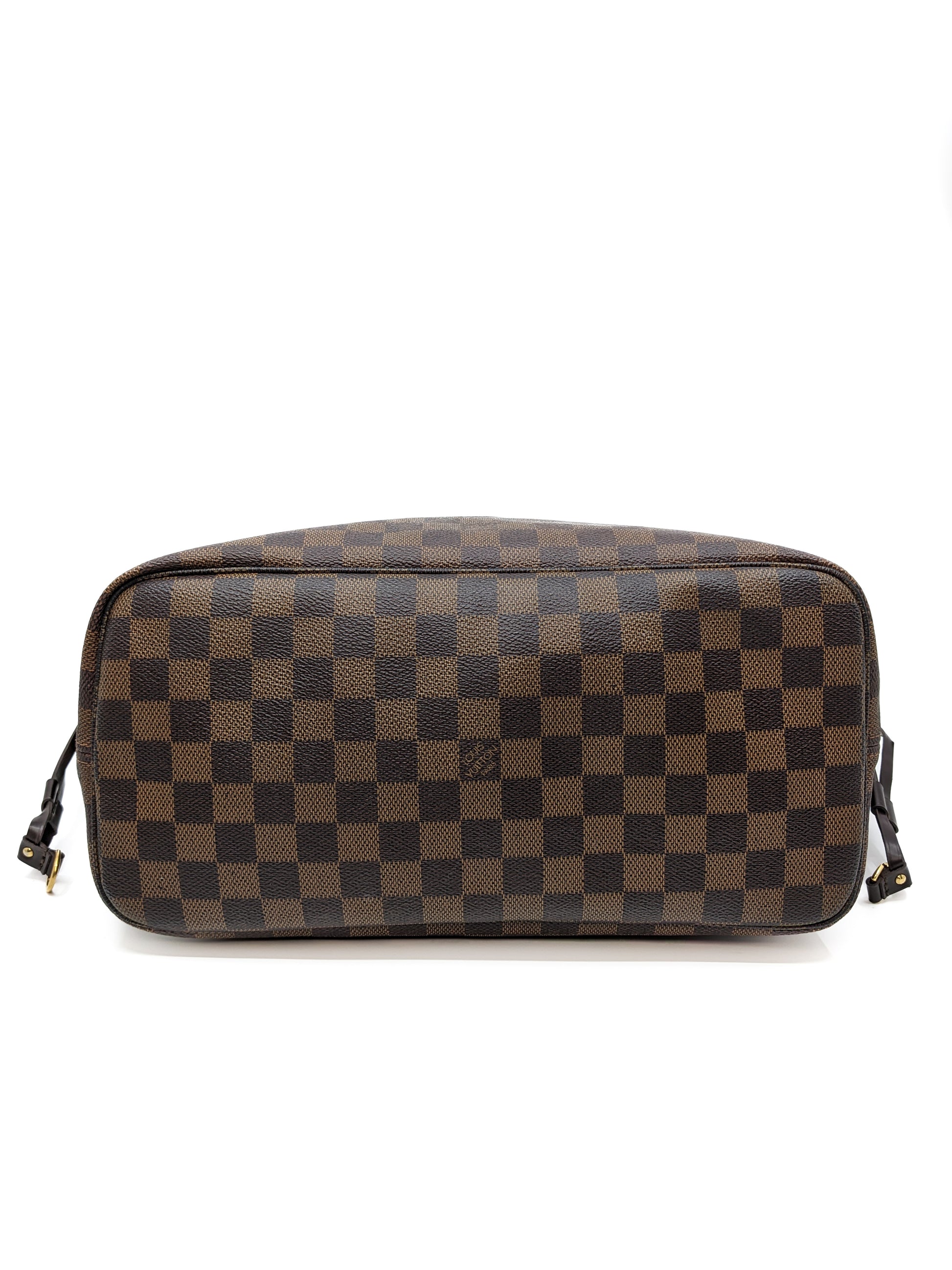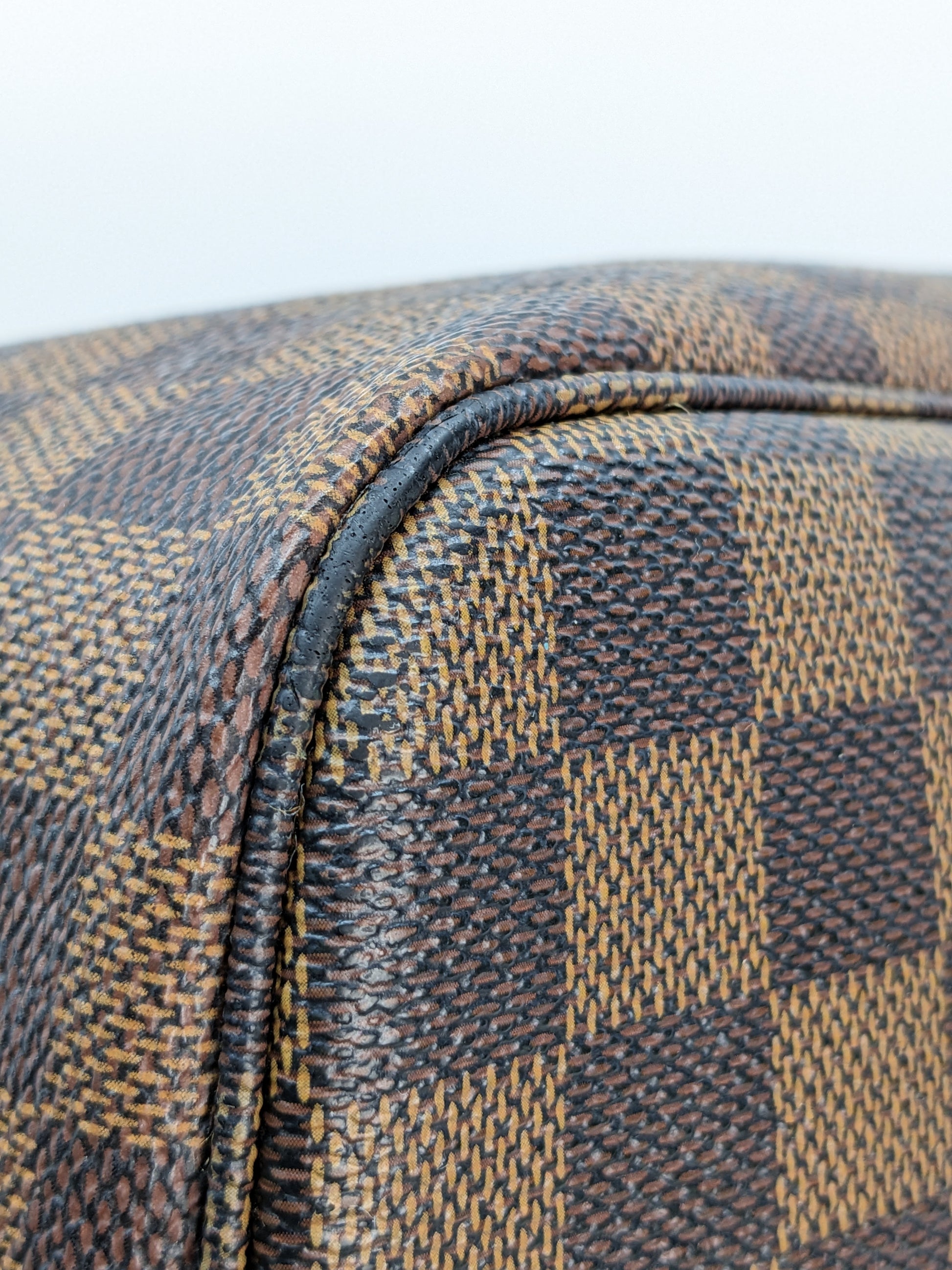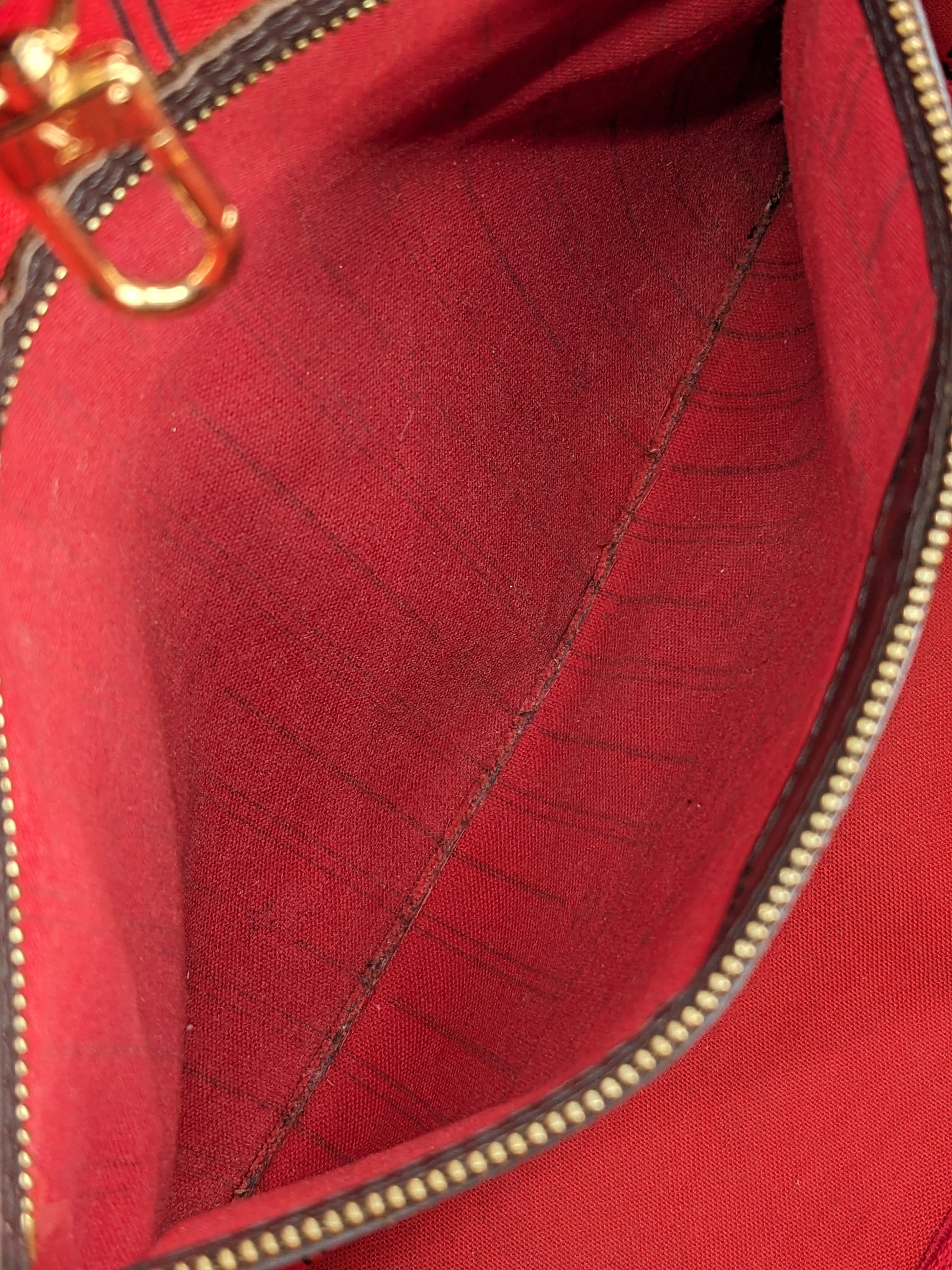 The Louis Vuitton Neverfull MM in Damier Ebene canvas with red lining is a timeless and versatile tote that combines elegance with practicality. Crafted from durable coated canvas with chocolate brown leather trim, it features slim, comfortable shoulder straps and gold-tone hardware.