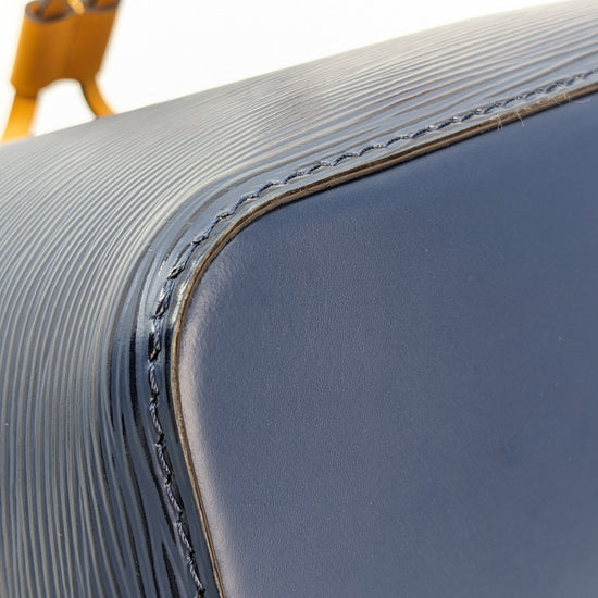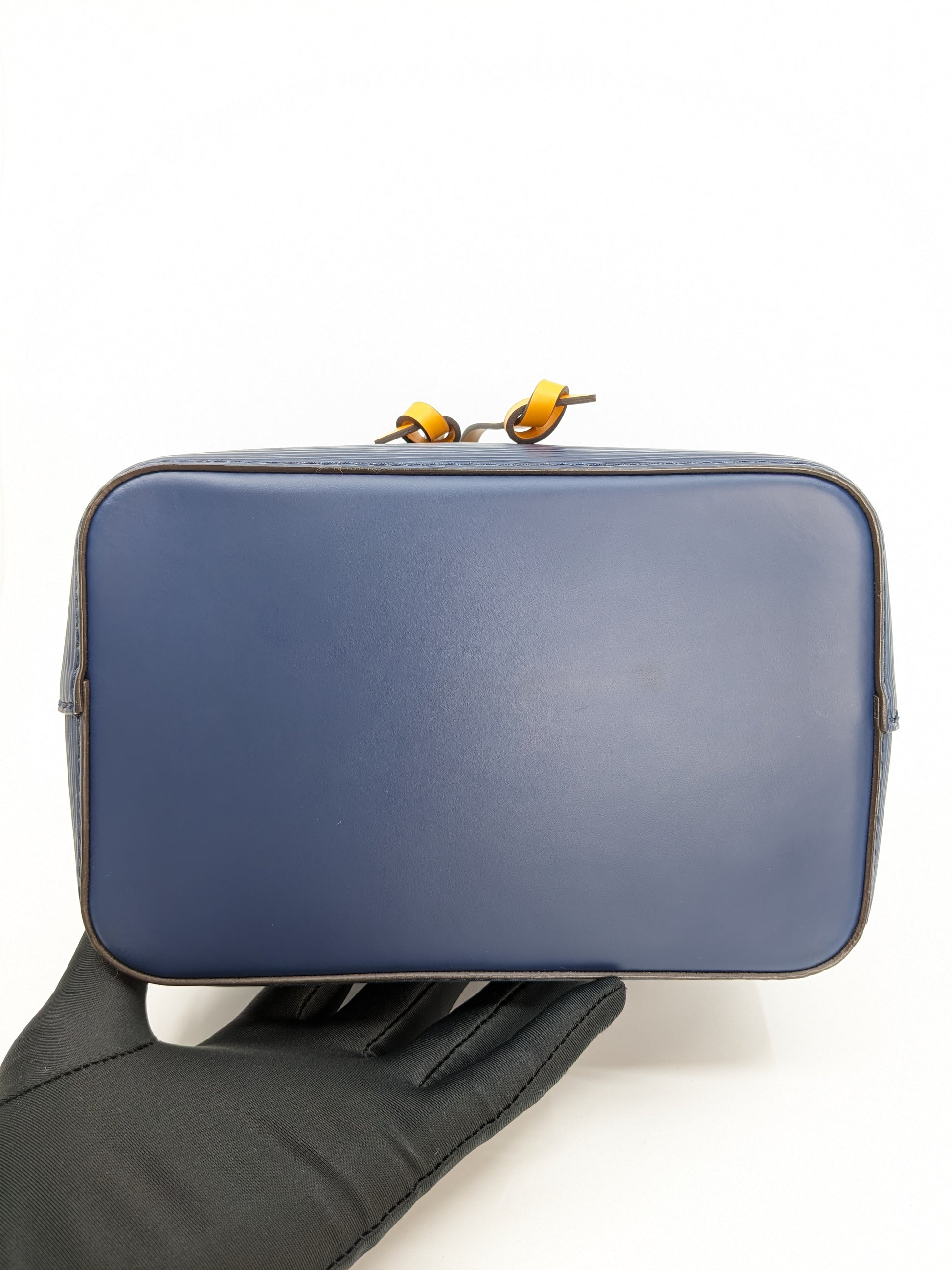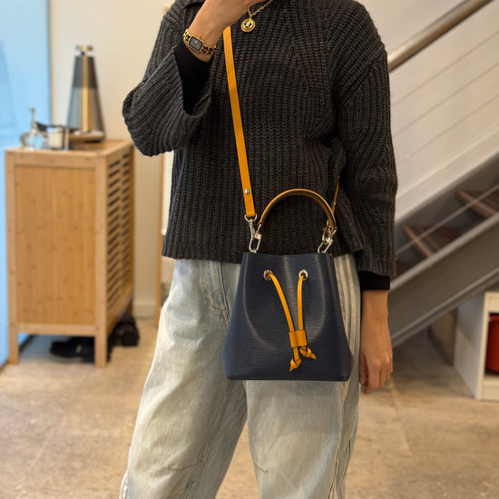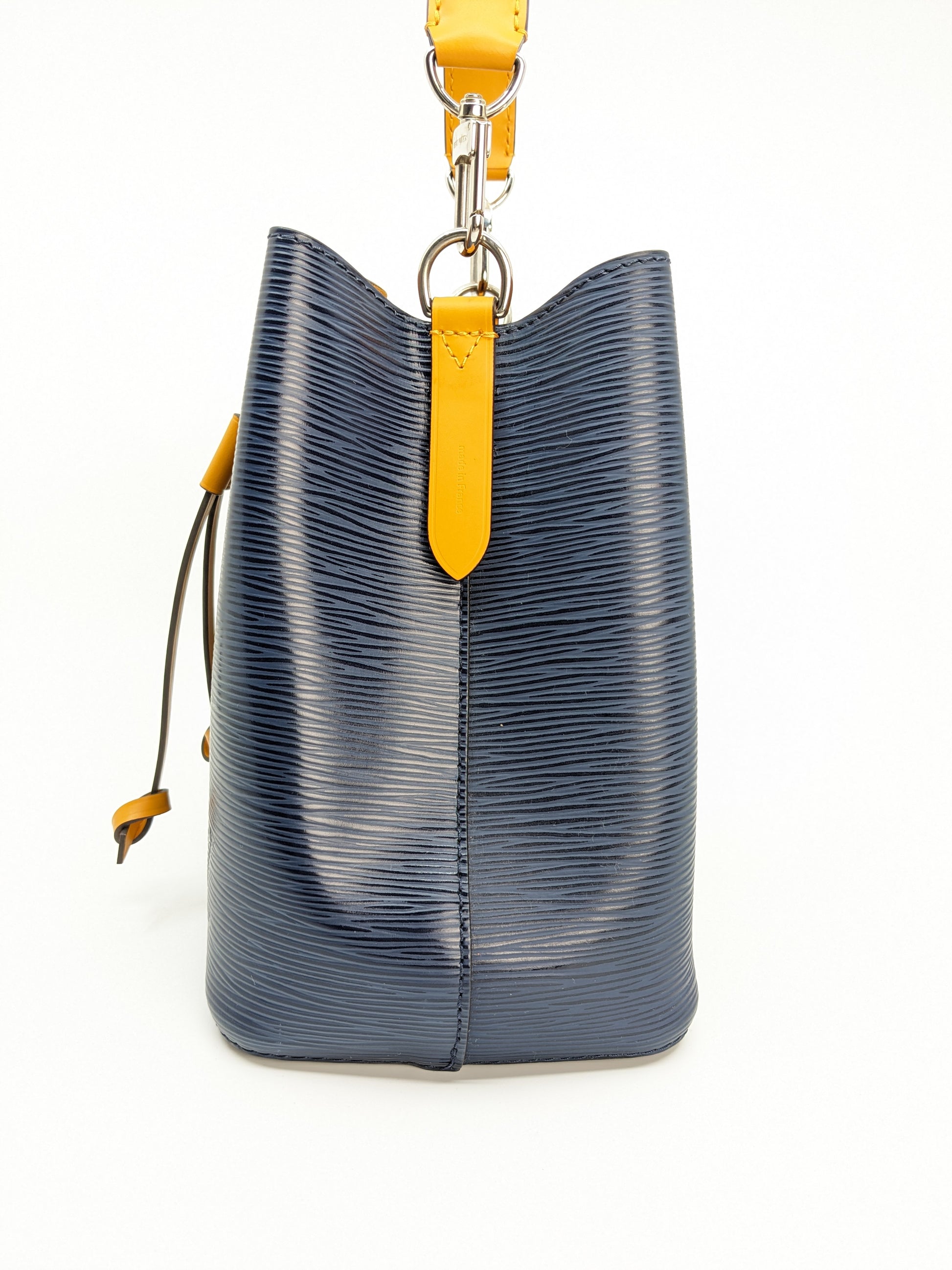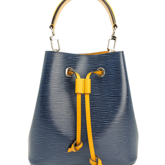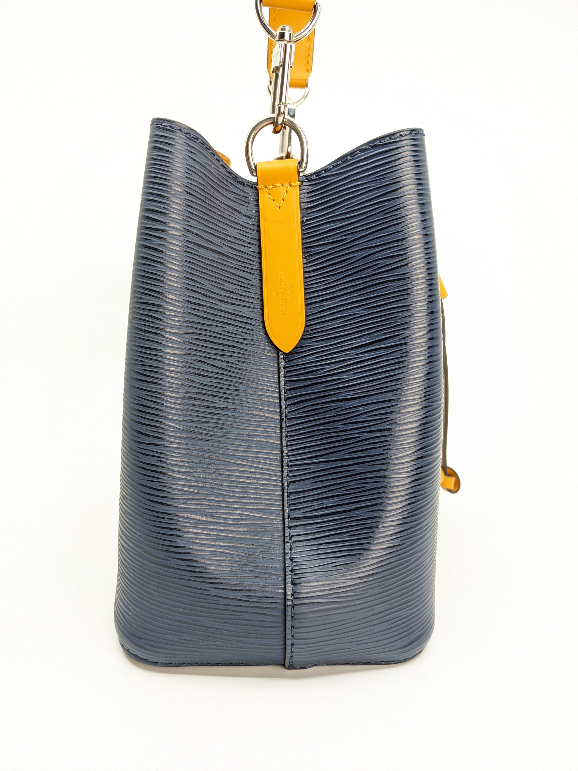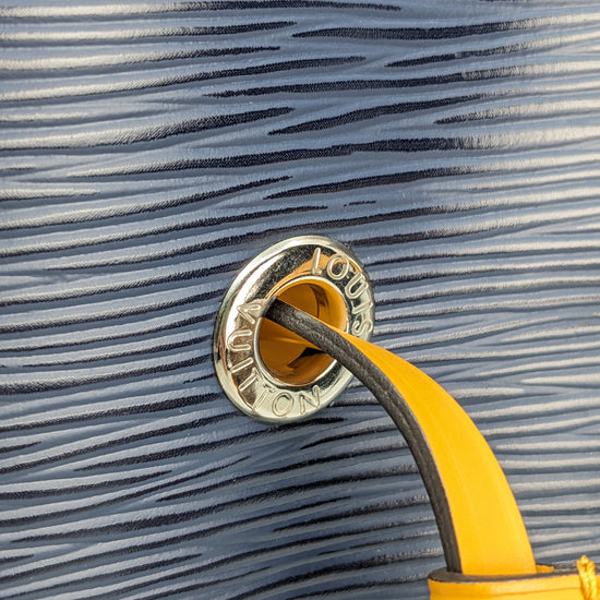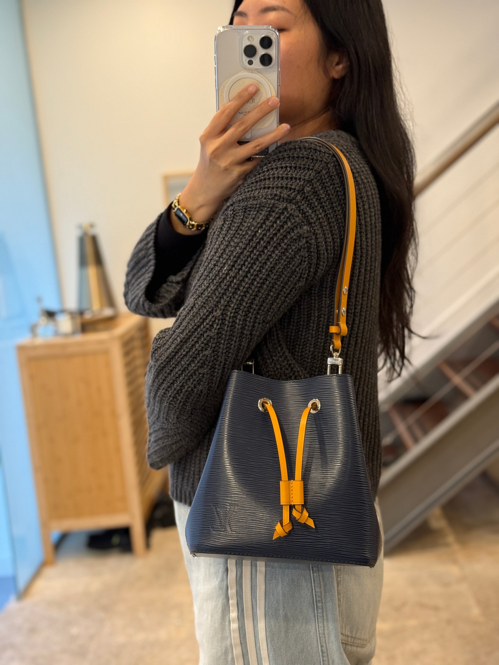 The Louis Vuitton Noéneo PM in Blue Epi leather is a modern reinterpretation of the classic Noé bucket bag, originally designed in 1932 to carry champagne bottles.