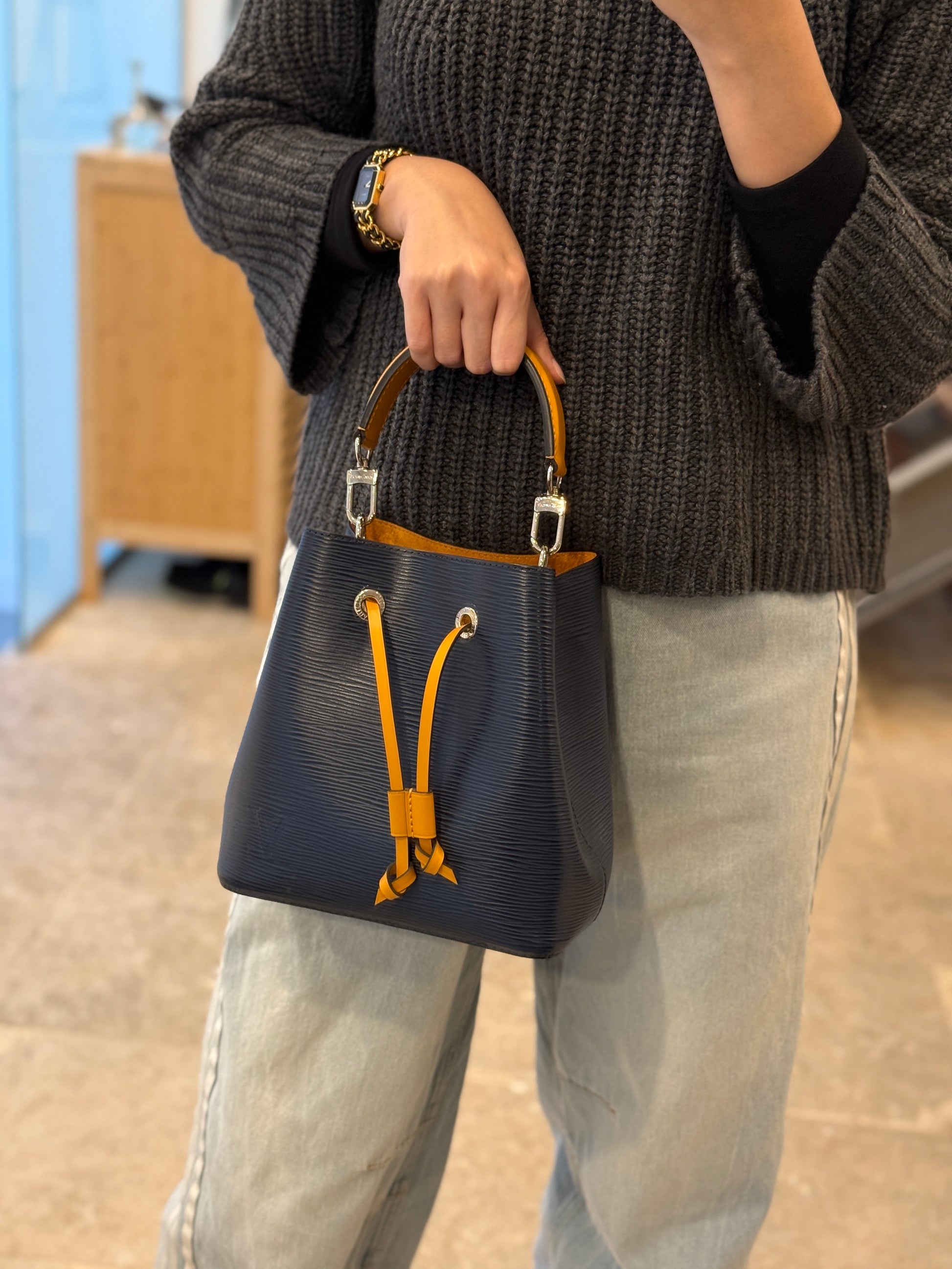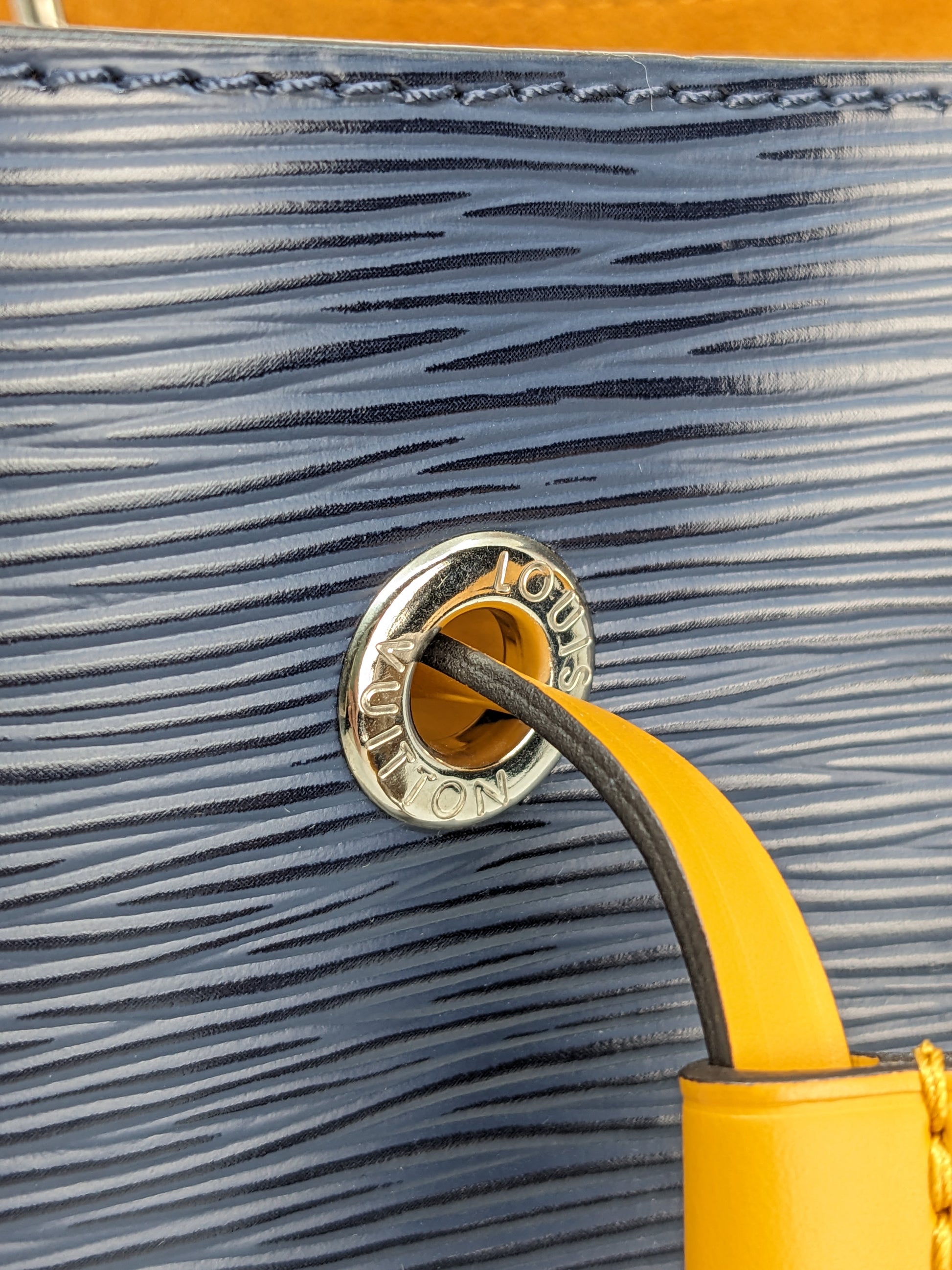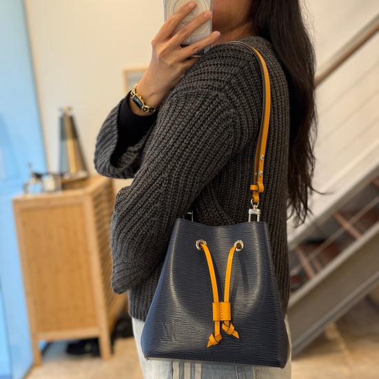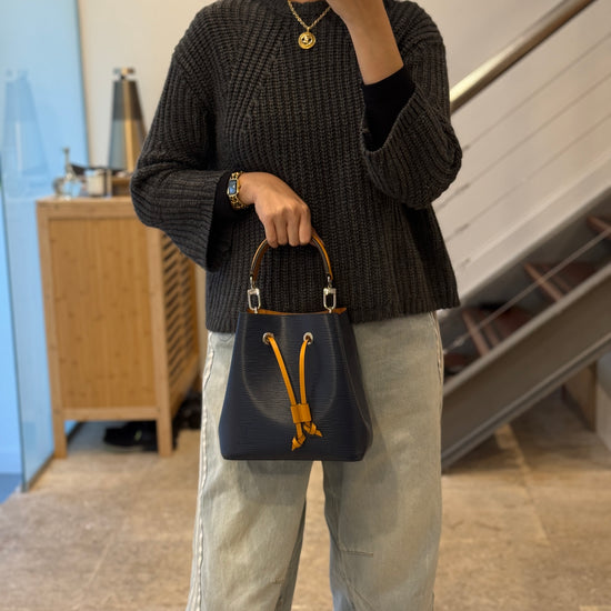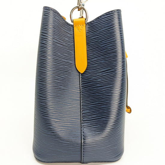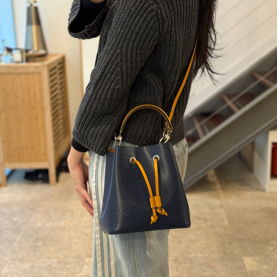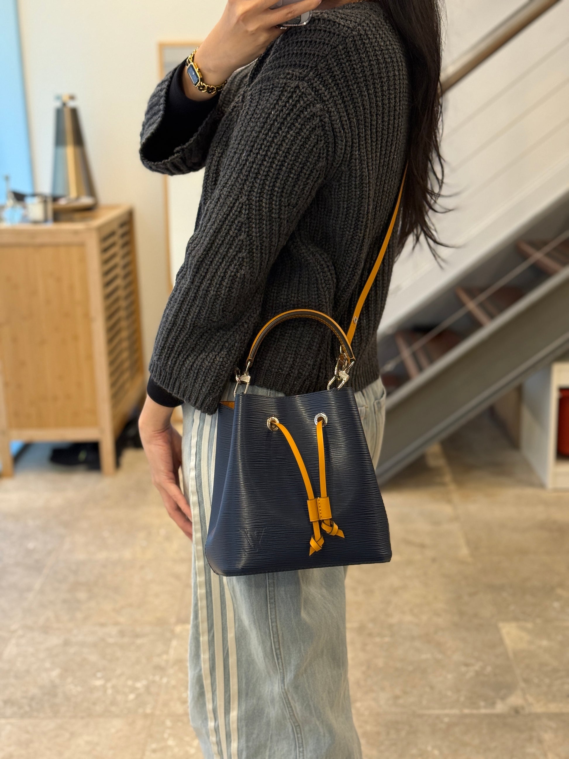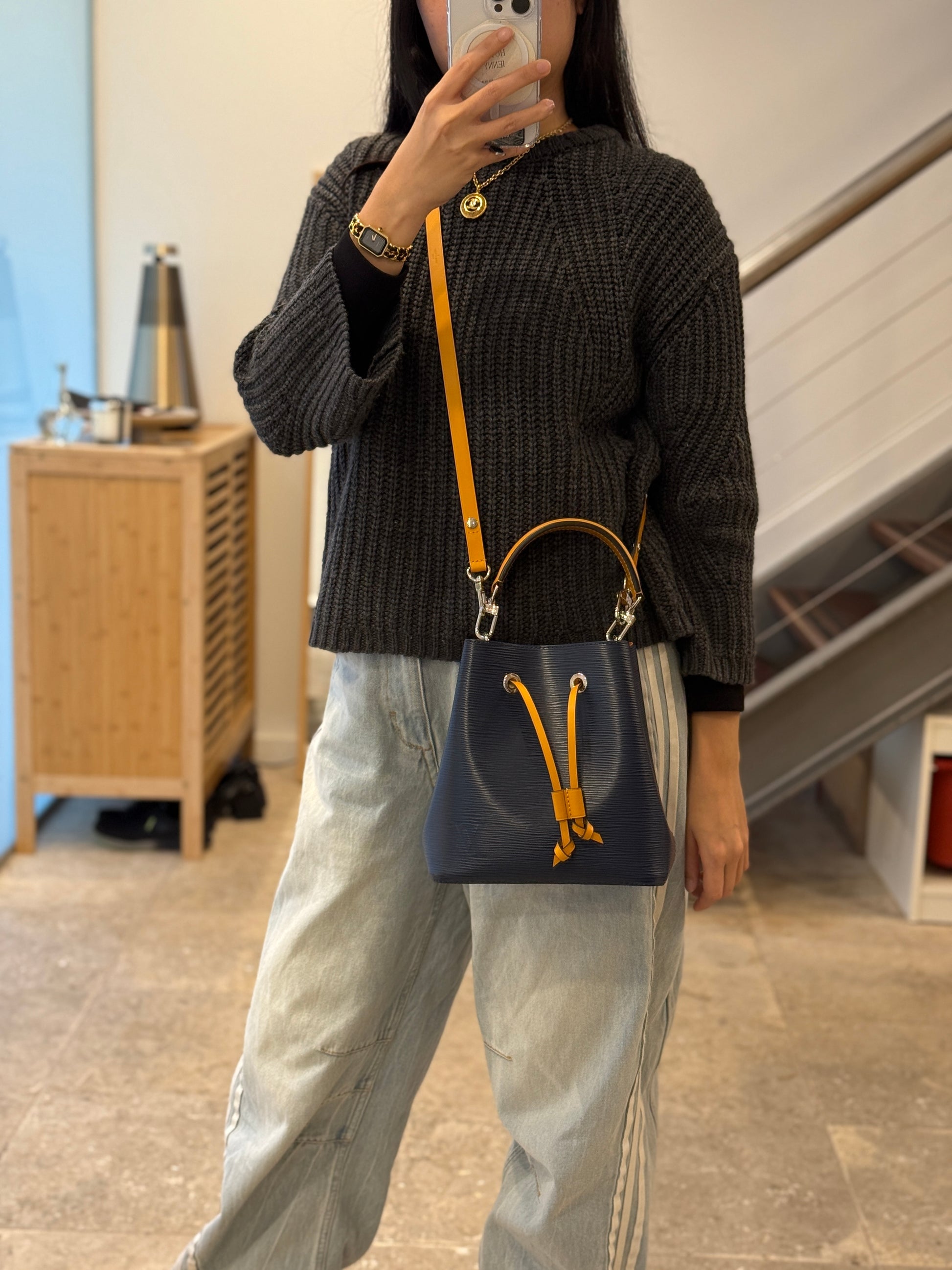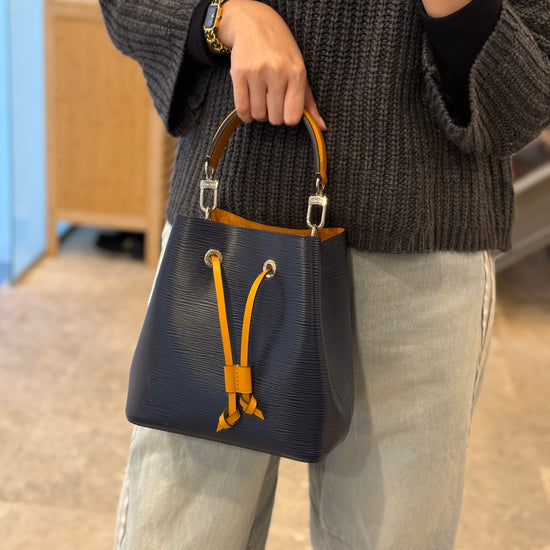 The Louis Vuitton Noéneo PM in Blue Epi leather is a modern reinterpretation of the classic Noé bucket bag, originally designed in 1932 to carry champagne bottles.