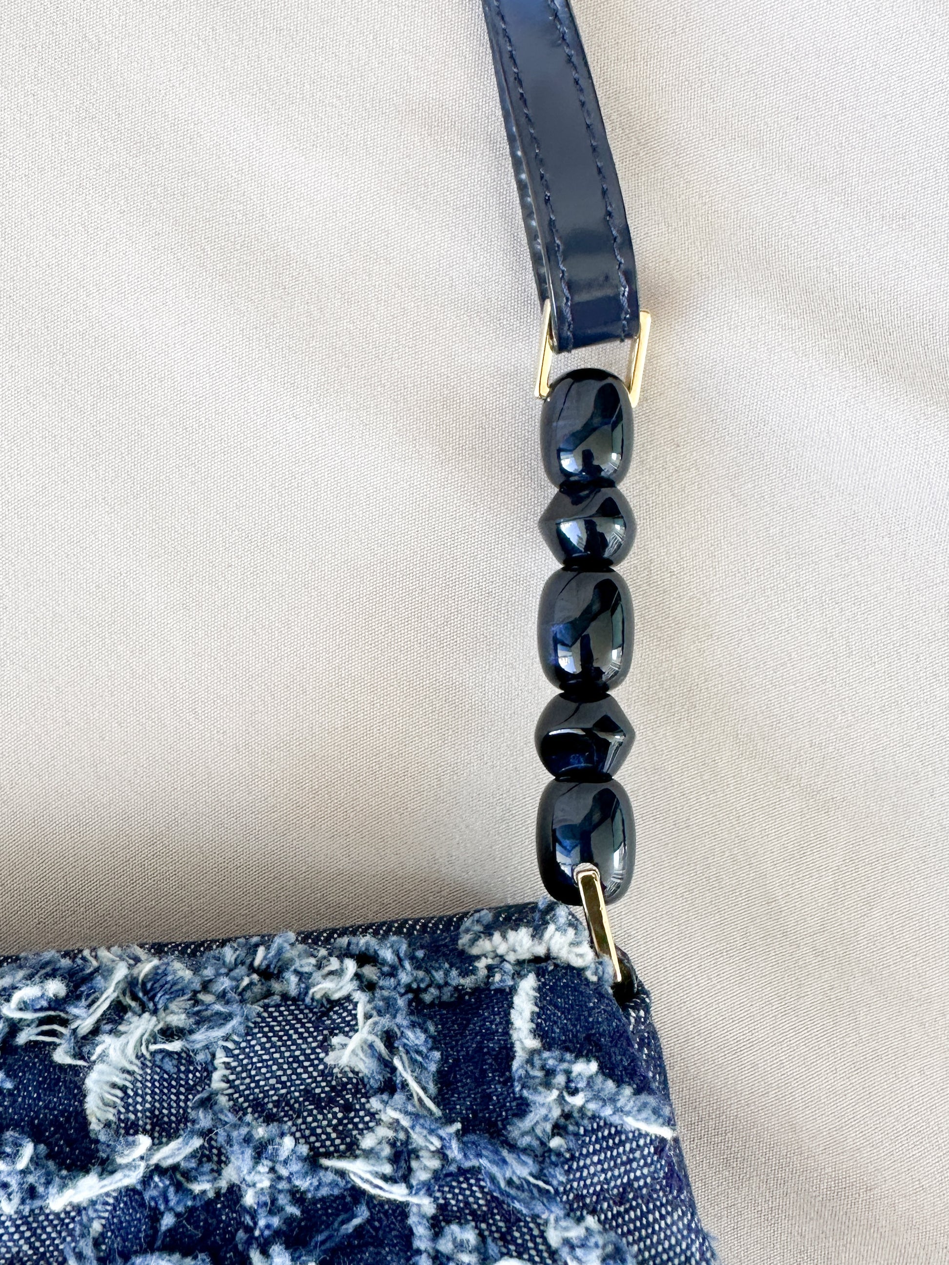 Crafted with exquisite attention to detail, the Dior Malice Bag in Denim features gold hardware, and a patent leather trap mixed with charm detail. The denim fabric, carefully selected for its quality and ruffle texture, brings a contemporary edge to the classic Malice silhouette, making it a versatile addition to any fashion enthusiast's collection. The bag's unique material choice reflects Galliano's commitment to pushing the boundaries of traditional luxury fashion, making it a standout piece that is both modern and timeless.