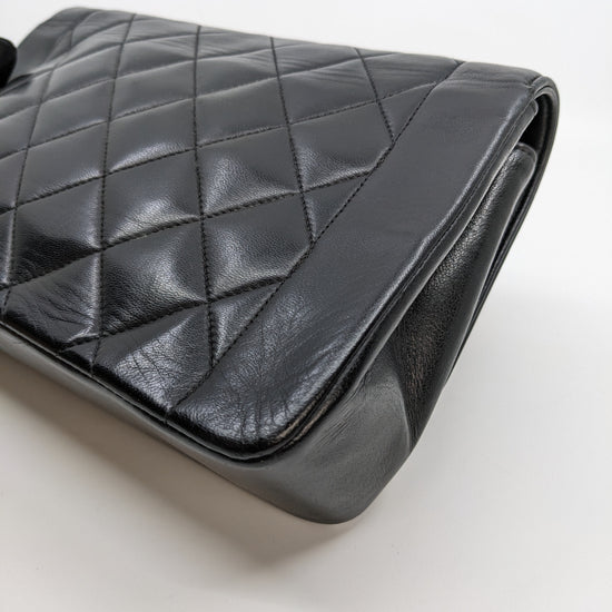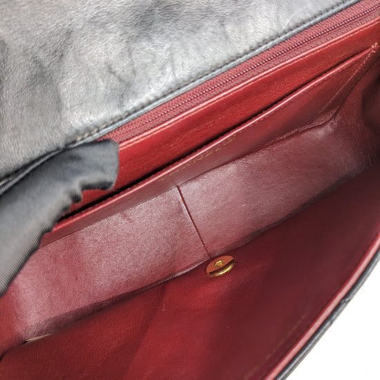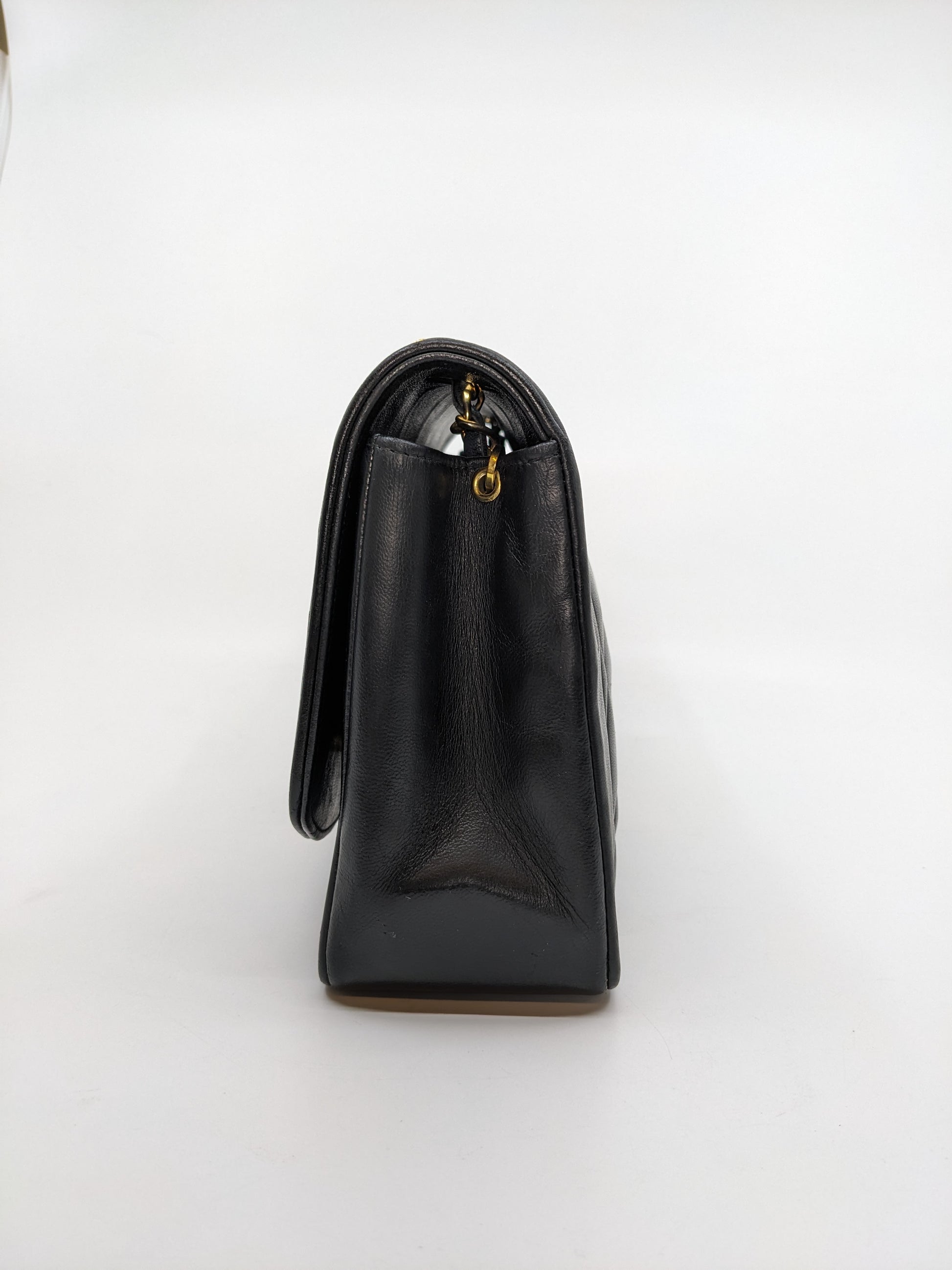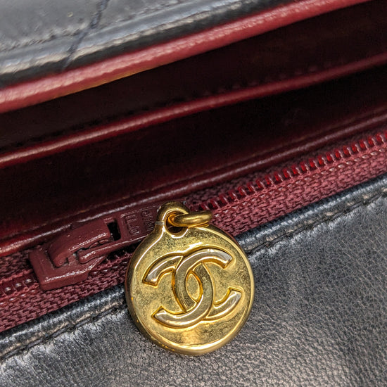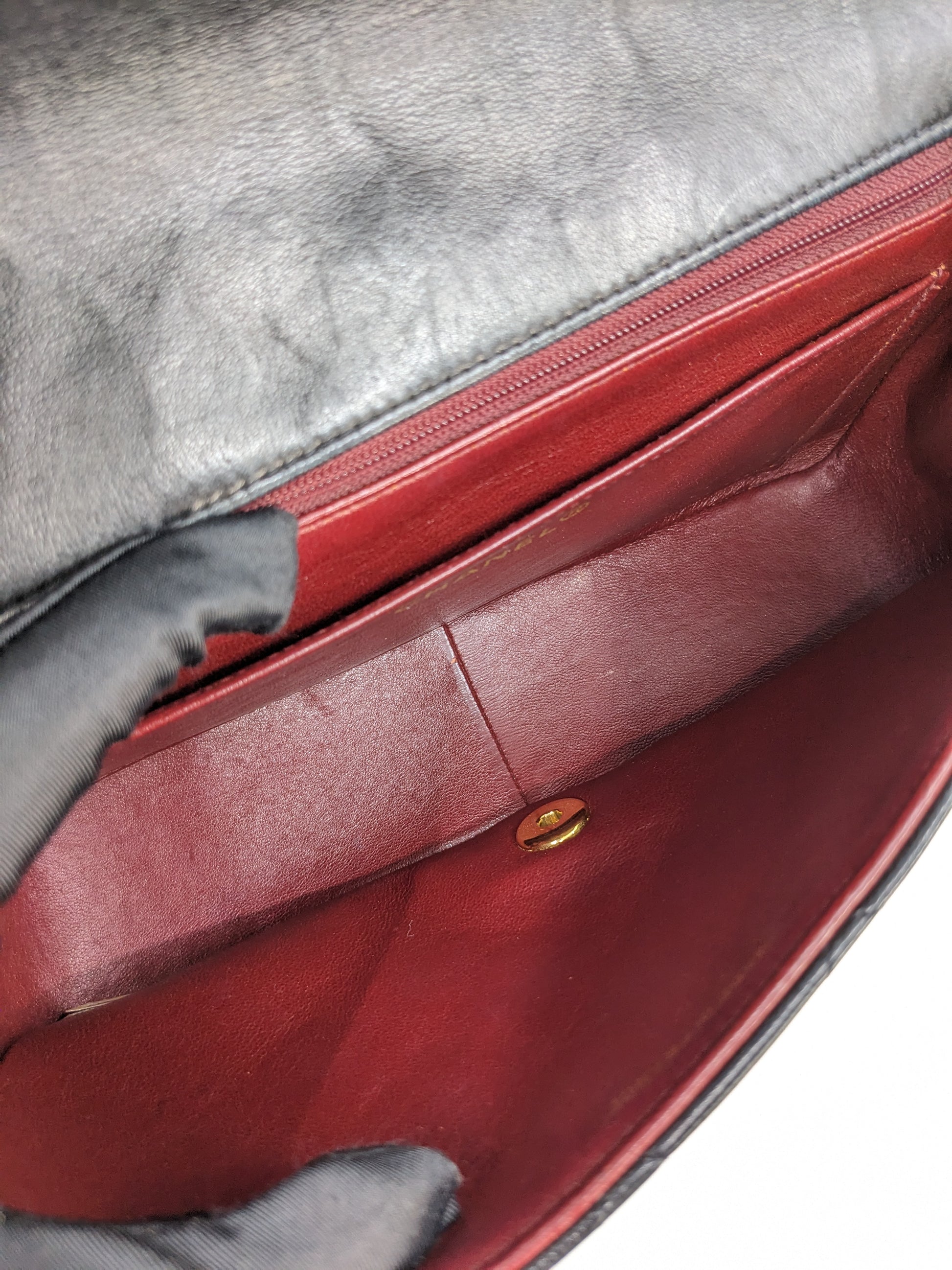 Crafted from luxurious black lambskin leather, it features the signature curved front flap, elegant quilted body, and 24k gold-plated hardware. The bag includes a single flap with a CC turn-lock closure, a leather-interwoven chain strap, and a burgundy leather interior. The medium size offers enough room for essentials while maintaining a sleek, timeless silhouette. A true collector’s gem that embodies classic Chanel elegance.