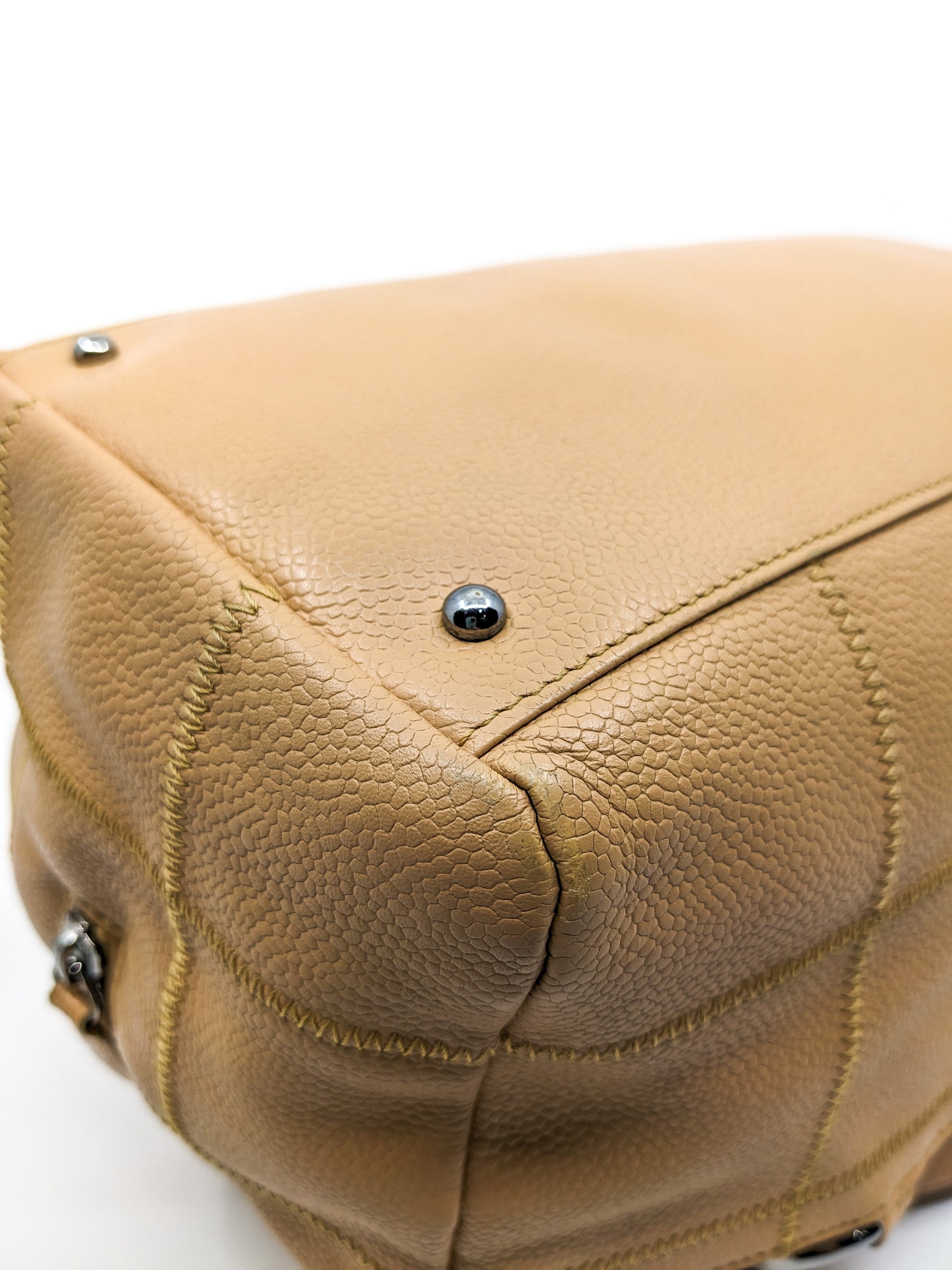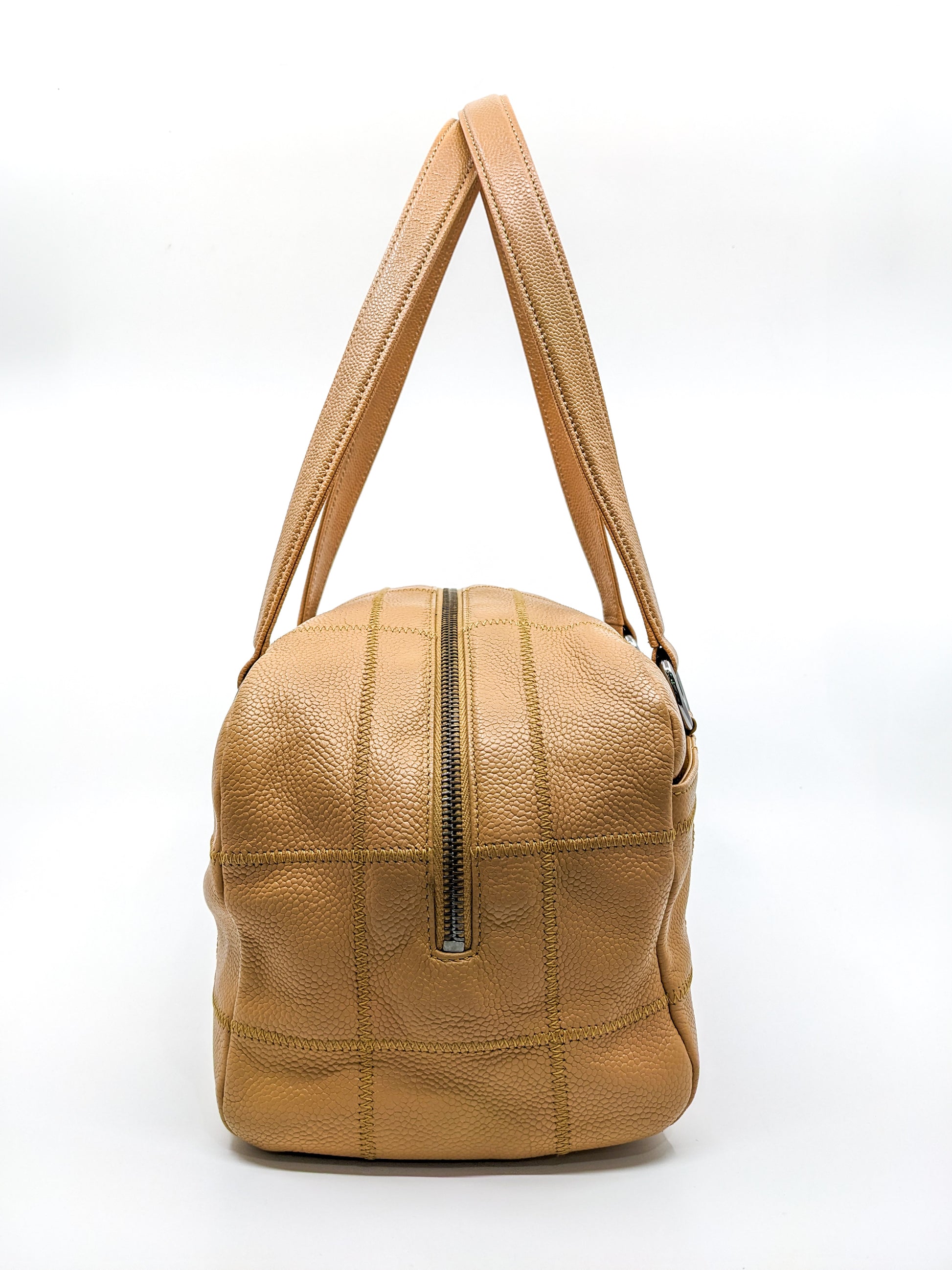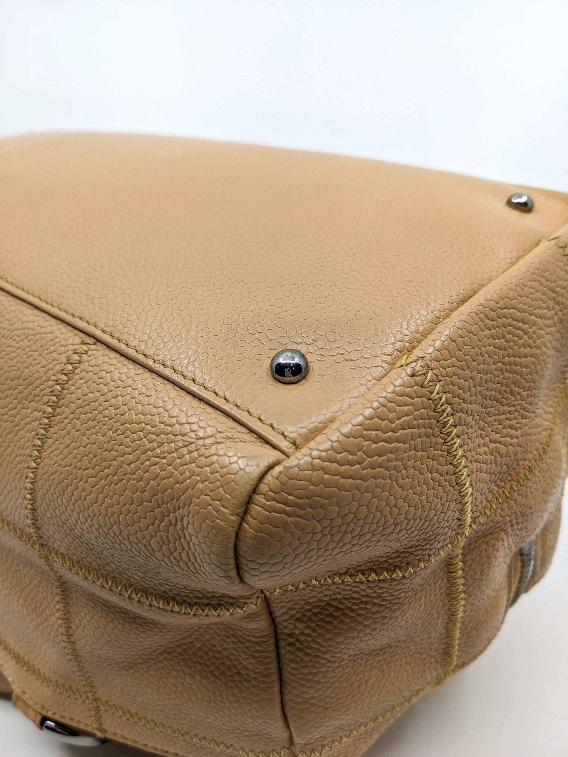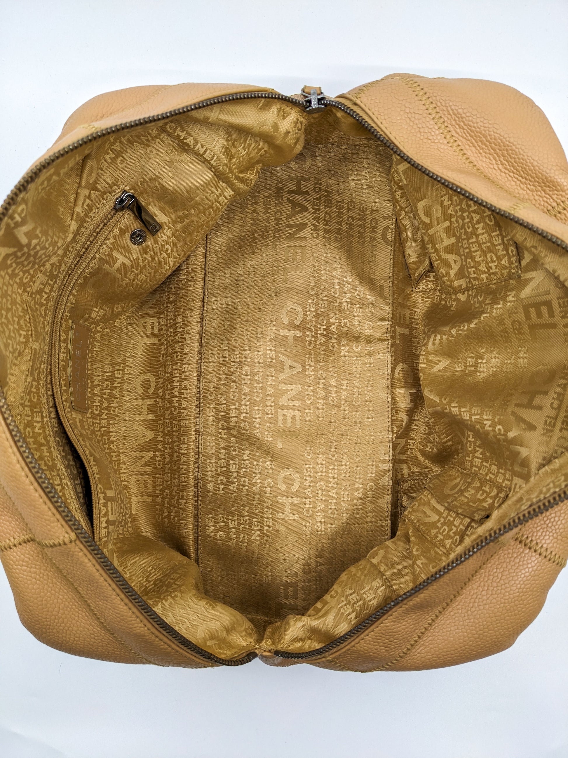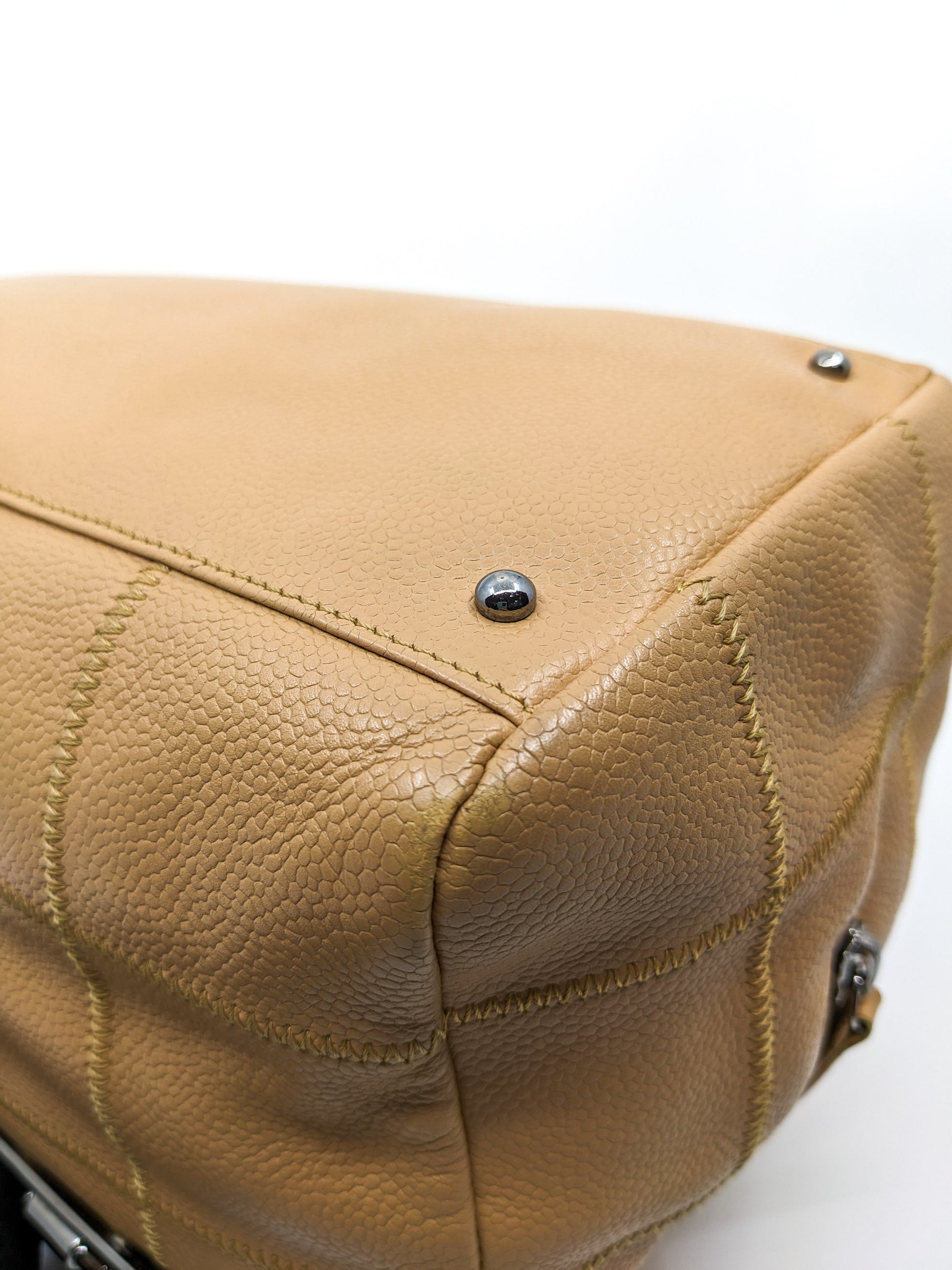 This vintage Chanel Bowling Bag in Beige Caviar exudes timeless elegance with its signature quilted design and sculptural silhouette. Crafted from luxurious beige caviar leather, it offers a perfect blend of classic Chanel style and modern versatility, making it a coveted accessory for discerning collectors and fashion enthusiasts alike.